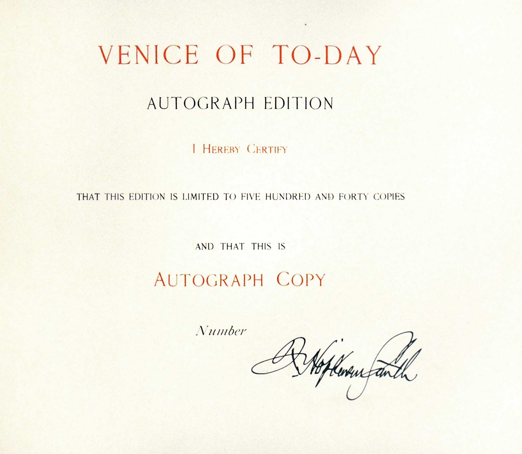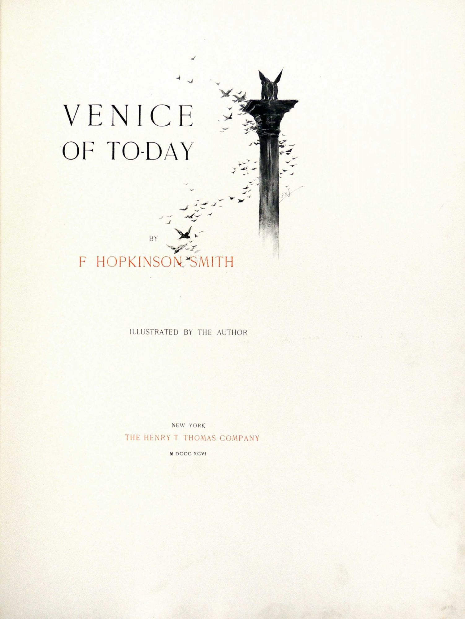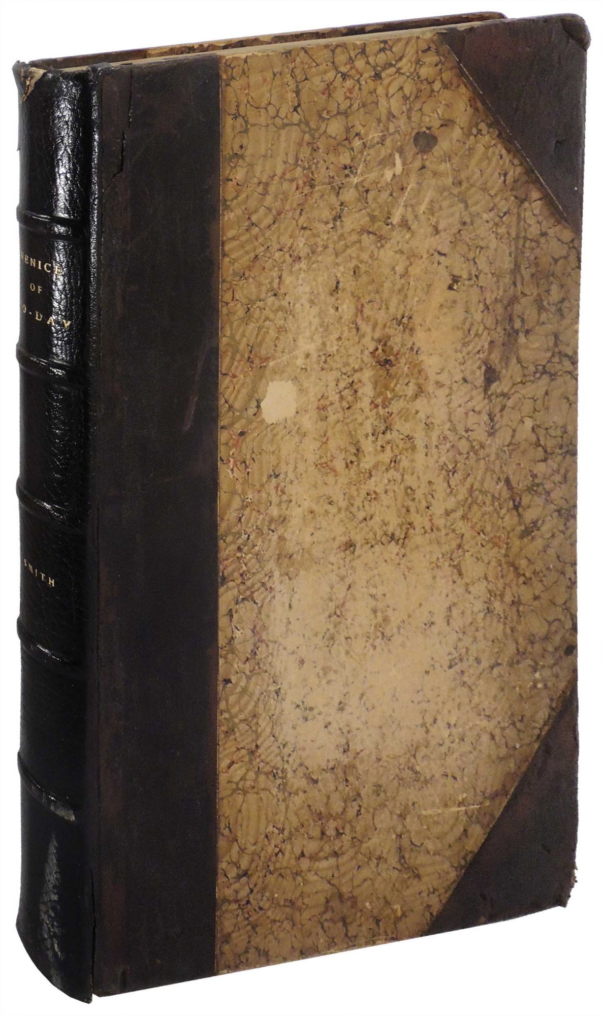 New York: The Harry T Thomas Company, 1896. Very Good. One of 540 copies of the scarce Autograph Edition signed by the author/artist. Francis Hopkinson Smith (1838-1915) was an American author, artist and engineer born in Baltimore, Maryland, a descendant of Francis Hopkinson, one of the signers of the Declaration of Independence. He became a contractor in New York City and did much work for the Federal government, including the stone ice-breaker at Bridgeport, Connecticut, the jetties at the mouth of the Connecticut river, the foundation for the Bartholdi Statue of Liberty in New York harbor, and the Race Rock Lighthouse off New London, Connecticut. His vacations were spent sketching in the White Mountains, in Cuba, in Mexico, and afterwards in Venice, Constantinople and Holland. He published various volumes of travel illustrated by himself, including this work on Venice [Wikipedia]. This beautiful large folio is extensively illustrated both in color and black & white. There are 20 full page color plates and 21 in b&w, all protected by tissue guards. In addition there are numerous color and b&w text illustrations throughout the book. In his preface Smith wrote that his aim was to describe and depict the beauties of Venice that one sees in the sunlight of a summer's day. Bound in contemporary brown three quarter leather with marbled paper boards and endpapers. Leather is scraped and scuffed, with tear along top of spine. Paper boards are also scraped and worn. The interior pages are quite clean and bright. There is a margin stain on the free front endpaper but the rest of the book is very good plus. A very desirable copy of this homage to the magical city of Venice. 140 pages plus plates. This is very heavy book that will require extra postage. ART/012319.