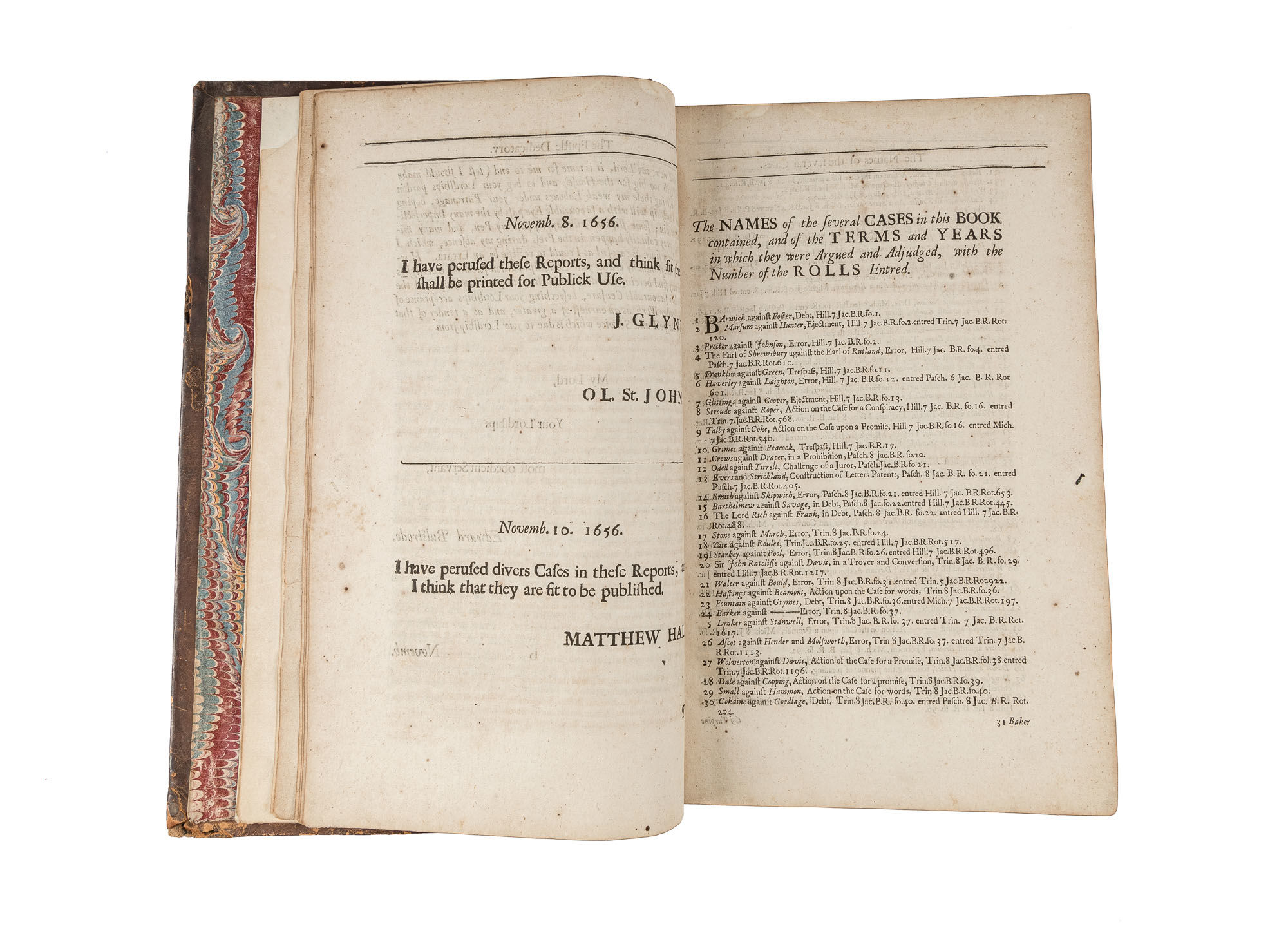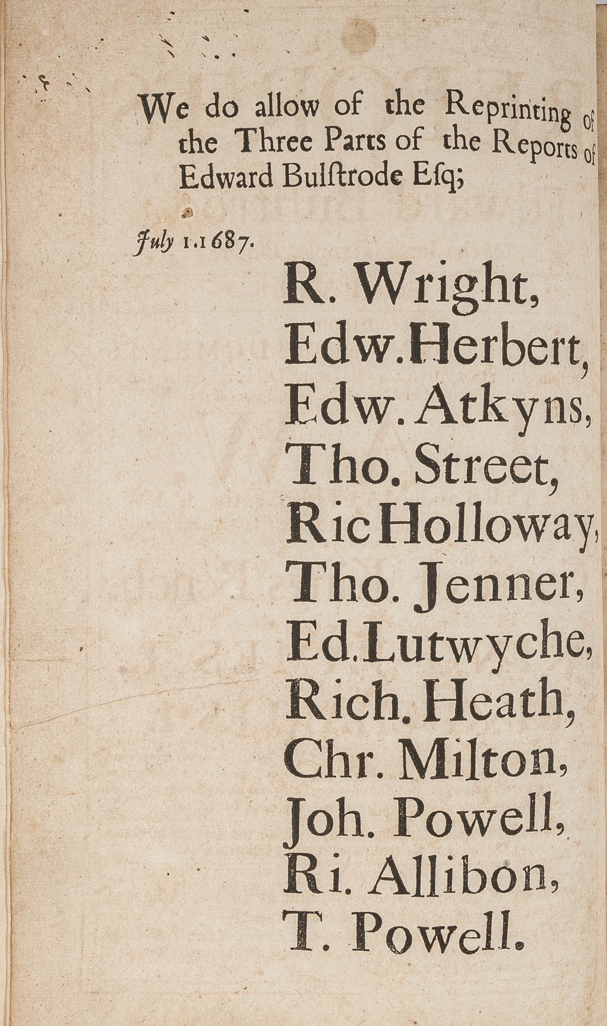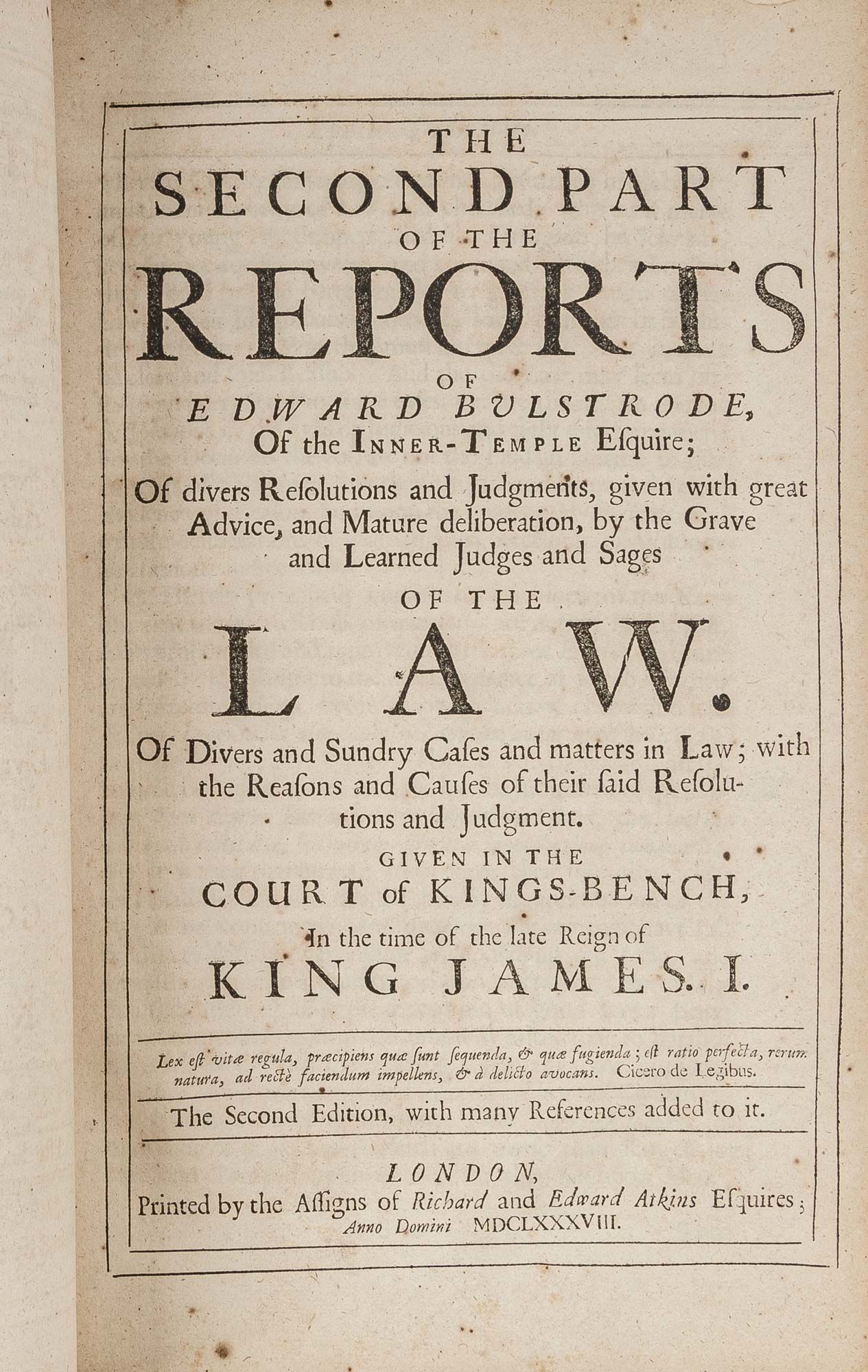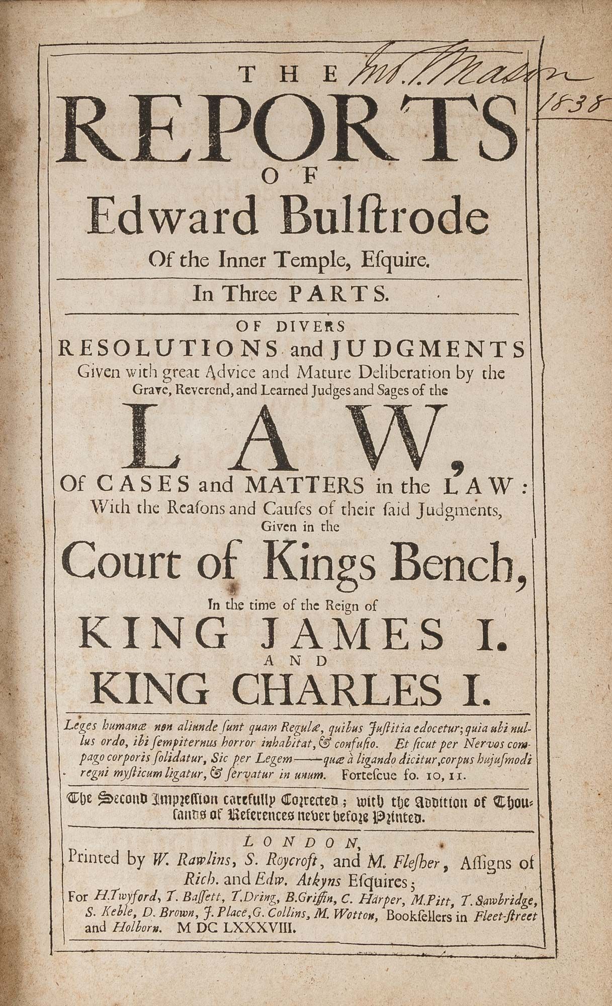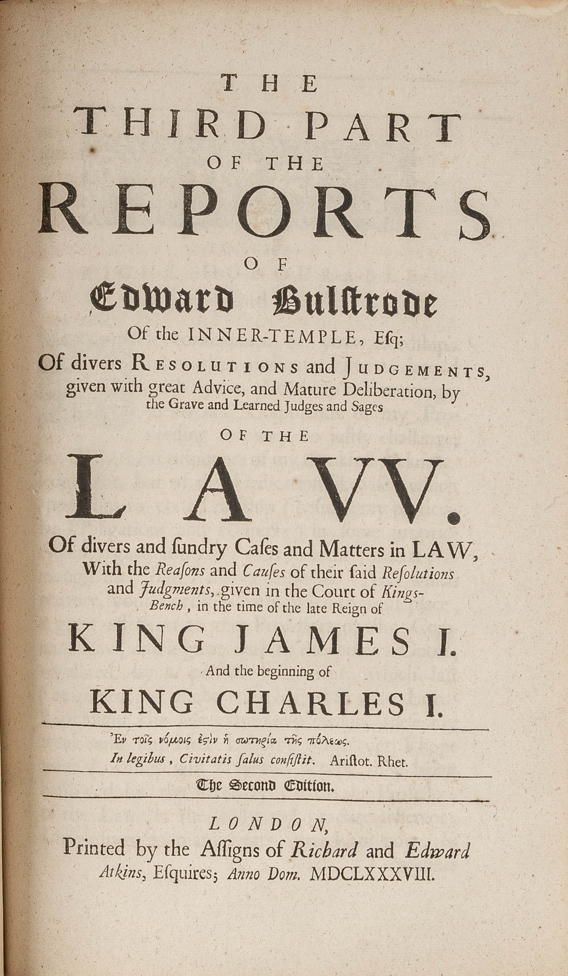 1688. Complete Final Edition of Bulstrode's Reports Bulstrode, Edward [1588-1659]. The Reports of Edward Bulstrode of the Inner Temple, Esquire. In Three Parts. Of Divers Resolutions and Judgments Given with Great Advice and Mature Deliberation by the Grave, Reverend, and Learned Judges and Sages of the Law, Of Cases and Matters in the Law: With the Reasons and Causes of Their Said Judgments, Given in the Court of Kings Bench, in the Time of the Reign of King James I. And King Charles I. The Second Impression Carefully Corrected; With the Addition of Thousands of References Never Before Printed. London: Printed by W. Rawlins, S. Roycroft, And M. Flesher, 1688. [xx], 223, [37] pp. [Bound with] Bulstrode, Edward. The Second Part of the Reports... The Second Edition, With Many References Added to It. London: Printed by the Assigns of Richard and Edward Atkins, 1688. [20], 216, 225-358, [36] pp. Text continuous despite irregular pagination. [And] Bulstrode, Edward. The Third Part of the Reports... The Second Edition. London: Printed by the Assigns of Richard and Edward Atkins, 1688. [xx], 341, [23] pp. Complete. Folio (12" x 7-1/2"). Contemporary calf, rebacked retaining existing gilt spine with raise bands and lettering piece, gilt rules and panels to boards. Moderate rubbing to boards and extremities, corners bumped and somewhat worn, gilt edges, marbled endpapers, hinges mended. Moderate toning, light foxing, early owner inscription to front free endpaper, its upper corner removed along with upper corner of following endleaf, later owner signature ("Jno. [V.]? Mason 1838") to head of Part I title page. A handsome copy of an uncommon complete set. $1,500. * Second and final editions. Covers the period from 1609-1639. Bulstrode intended his reports to rival "that Leviathan of the law" Lord Coke. According to the preface of the first part, Bulstrode emphasized the care he took to select a well-chosen collection of "the fittest and choicest cases." Hale gave these reports his seal of approval. Wallace, The Reporters 245-246. English Short-Title Catalogue R2485, R33258, R33257.