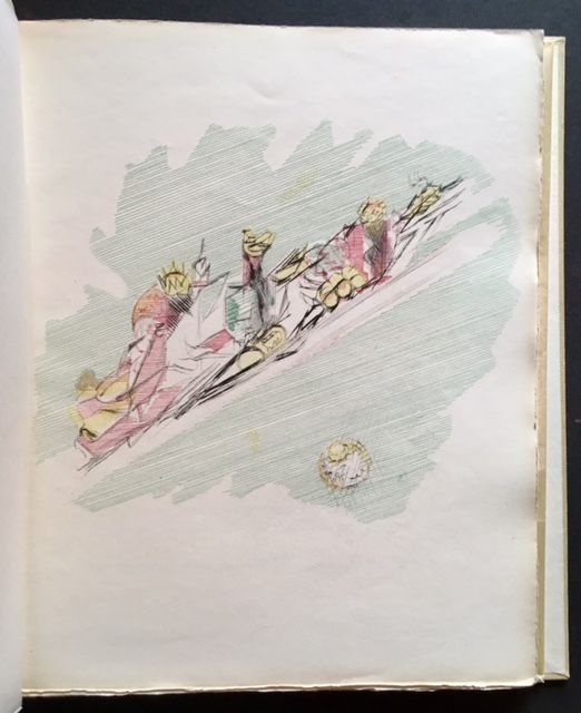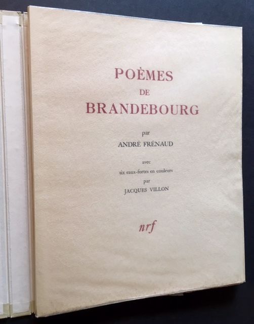 Paris: Librairie Gallimard, 1947. Original wraps. Near Fine/Near Fine. Jacques Villon. INSCRIBED IN PENCIL BY JACQUES VILLON on the half-title. A superb copy to boot of the 1947 1st edition. #168 of 190 copies issued "sur velin de pur fil, a la forme, des papeteries du marais". Clean and Near Fine to Fine in its printed beige wrappers. And in a crisp, exceptionally well-preserved, Near Fine to Fine example of the glassine dustjacket. Quarto, loose signatures (as issued) laid-in. 6 lovely Jacques Villon watercolors-- all with their accompanying tissue-guards and all beautifully reproduced-- complememt the Andre Frenaud text. Also includes a very impressive, easily Near Fine example of the publisher's printed chemise, which no doubt accounts for the wonderful condition of the book.