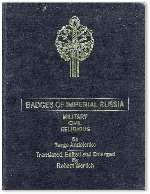 Washington DC: Quaker Press, 1983. Second Printing. Quarto (28.5cm x 22.5cm). Black leather boards (hardcover) with titling embossed in gold on cover and spine; 216pp; illus. Very Good copy; slightly bumped corners; slight soiling to top cover, else tight. Catalogue of military, civil, and religious badges of Imperial Russia. 765 items with images and descriptions.