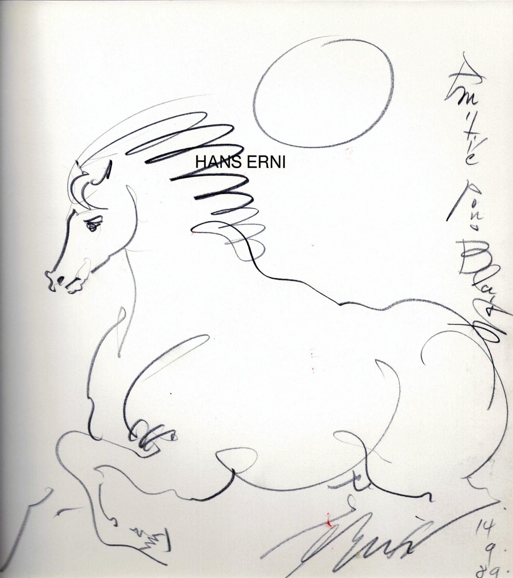 Martigny: Fondation Pierre Gianadda, 1989. First edition. Stiff Wraps. Orig. pictorial stiff black wrappers decorated in blue, red and white. Fine. Erni, Hans. 159 pages. 24 x 22 cm. Text by Pierre-Francis Schneeberger. Commentary by Leonard Gianadda, Claude Richoz and Jura Bruschweiter. 140 illustrations mostly in color of his paintings and lithographs, plus his sculptures. Black and white photographs in the text (French). With an original pencil drawing on a horse on the half-title and signed by Erni.