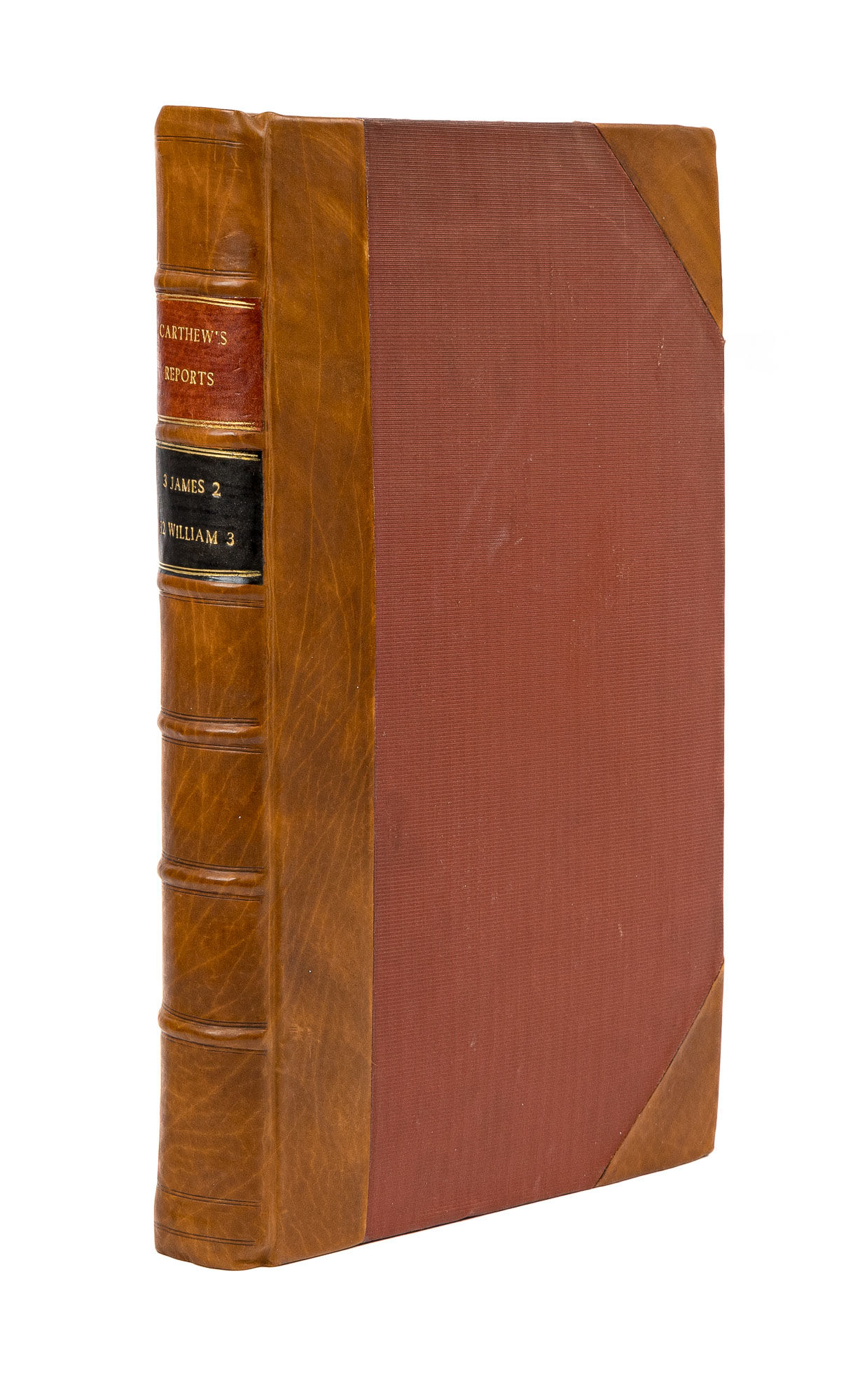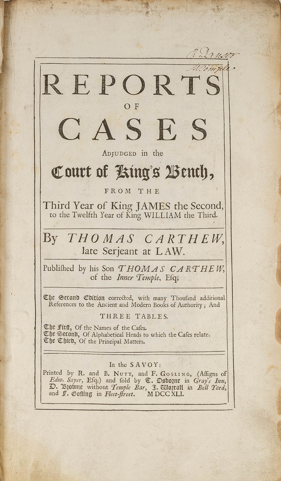 1741. London, 1741. 2nd and final ed.. London, 1741. 2nd and final ed. "A Reporter of Acknowledged Accuracy" Carthew, Thomas. Reports of Cases Adjudged in the Court of King's Bench, From the Third Year of King James the Second, To the Twelfth Year of King William the Third. Published by His Son Thomas Carthew, Of the Inner Temple, Esq. Corrected, With Many Thousand Additional References to the Ancient and Modern Books of Authority; And Three Tables. The First, Of the Names of the Cases. The Second, Of Alphabetical Heads to Which the Cases Relate. The Third, Of the Principal Matters. [London]: Printed by R. and B. Nutt, and F. Gosling, 1741. [xxii], 520, [24] pp. Folio (13-3/4" x 8-1/2"). Recent period-style three-quarter calf over cloth, raised bands and lettering pieces to spine, endpapers renewed. Negligible light rubbing to boards, corners bumped, library stamps to foot of text block and head of p. [v]. Light toning to text, faint dampstaining to foot of text book along gutter, light browning and some crinkling to outer sections of margins along top and fore-edges of text block, worming to tips of corners of final 27 leaves, light foxing to a few leaves, small tear starting at head of imprimatur leaf, occasional brief early owner annotations, early owner signature ("R. Danser/ M. Temple," probably of Middle Templar Richard Danser [1756 or 1757-1823]) to head of title page. $450. * Second and final edition. That the Reports "passed to a second edition at a period when every new book was most closely scrutinized, would seem to show that the volume was in considerable favor with the profession generally" (Marvin). Wallace notes that Carthew was a "reporter of 'acknowledged accuracy.'" The first edition was published in 1728. The second edition was reissued in 1743. Marvin, Legal Bibliography 176-177. Wallace, The Reporters 397-398. English Short-Title Catalogue T97361.