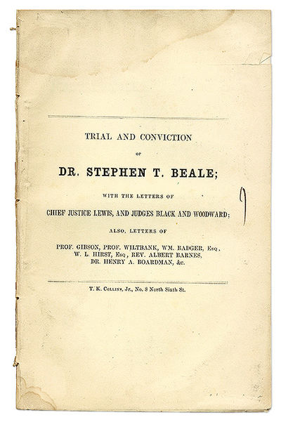 1855. Philadelphia: T.K. Collins, Jr., 1855.. Philadelphia: T.K. Collins, Jr., 1855. Raped Under Anesthesia by Her Dentist [Trial]. Beale, Stephen T., Defendant. Trial and Conviction of Dr. Stephen T. Beale; With the Letters of Chief Justice Lewis, And Judges Black and Woodward, On His Case. Interesting Ether Cases, And the Letters of Prof. Gibson, Prof. Wiltbank, Wm. Badger, Esq., W.L. Hirst, Esq. Rev. Albert Barnes, Dr. Henry Boardman, &c. Philadelphia: T.K. Collins, Jr., 1855. 30 pp. Octavo (9" x 5-3/4"). Stab-stitched pamphlet in printed wrappers removed from a volume, rear wrapper lacking. Faint dampstaining to head and lower corner at foot of spine through first half of text block, light soiling to exterior, minor tear and "9" in early hand to front wrapper, light toning to text. $500. * Only edition. This trial account reflects contemporary anxiety about ether, which was used for the first time in 1846. Narcissa Mudge claimed she was raped by her dentist, Dr. Beale while unconscious from ether during a procedure. Beale was convicted. This account of the trial is written by someone who characterizes the dentist as an innocent victim. He argues that Mudge's accusation was based on false memory, a side-effect induced by ether. His case is supported by the testimony concerning the effects of ether by a group of dentists and other authorities. Cohen, Bibliography of Early American Law 13774.
