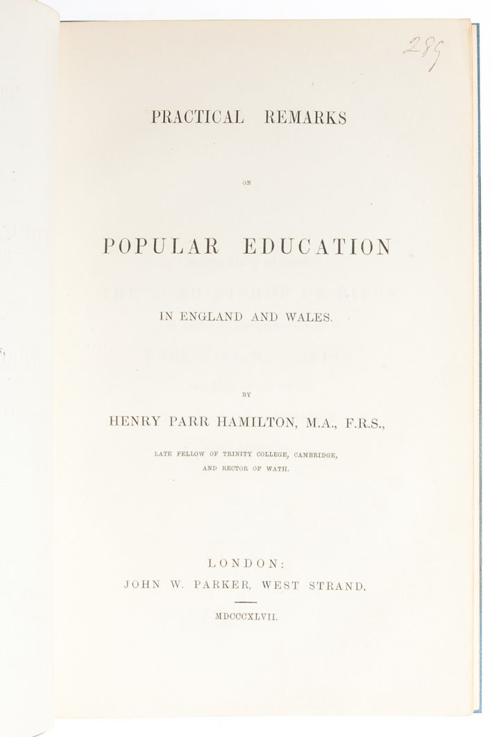 "The public mind is at length fully awakened to the necessity of educating the people...Ignorance is no longer considered safe or creditable." On this premise, educational activist Hamilton argued that while England had firmly established the important of education for citizens, it had not yet succeeded in fully enacting it. "His Practical Remarks on Popular Education (1847) pointed to the inadequate provision of elementary education in England. He advocated additional state support for the existing school societies, an enlarged curriculum, more attention to teaching girls...and improvements in the training, status, and stipends of teachers" (ODNB). Urging readers to look to the Continent for more effective school models, he notes that "in most of the existing primary schools, the improved methods of reading and writing...are still neglected. The same may be said of the improved methods of teaching arithmetic, geography, and other branches." These subjects are critical for all English children, he asserts, regardless of class or gender. And he specifically posits the need to expand girls' access to schooling. "The education of females is a subject of paramoutn importance." Not only are women the first educators encountered by infants, but just like men, women themselves cannot be expected to properly contribute in other areas of labor in or out of the home if they lack instruction. Toward the end of his paper, Hamilton outlines his ideas for improving the education system generally, with schools running class options during day and night sessions, and teachers being given sufficient training programs and compensation. An important moment in the expansion of education in England. Fine.