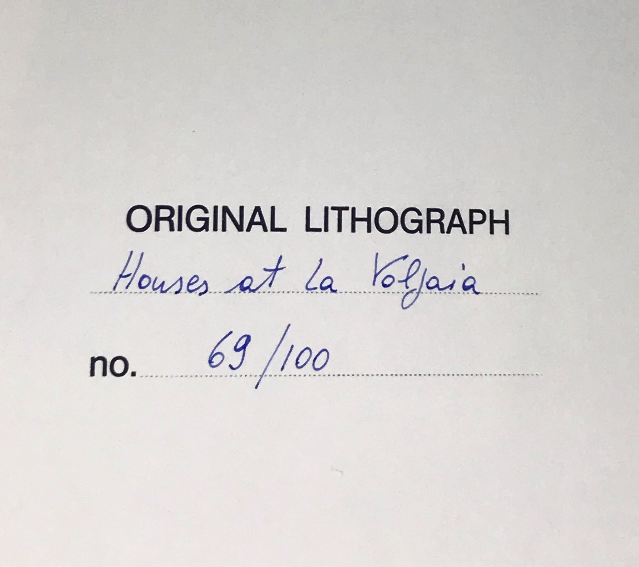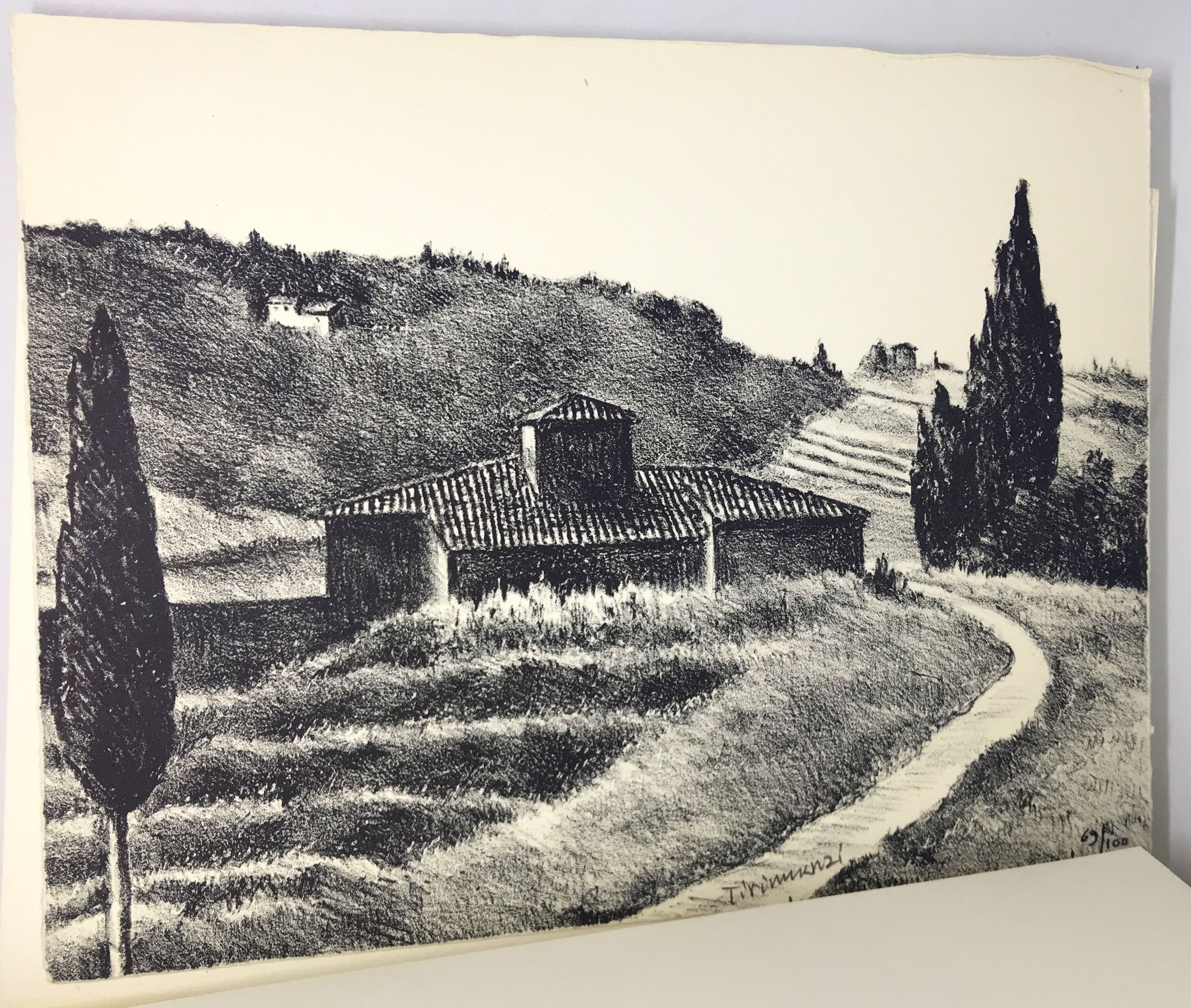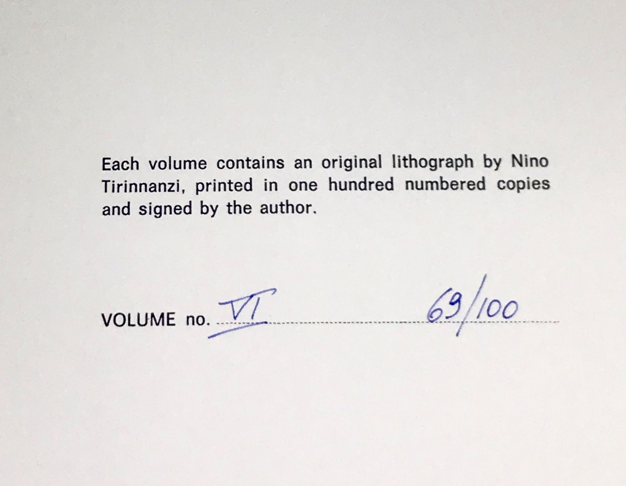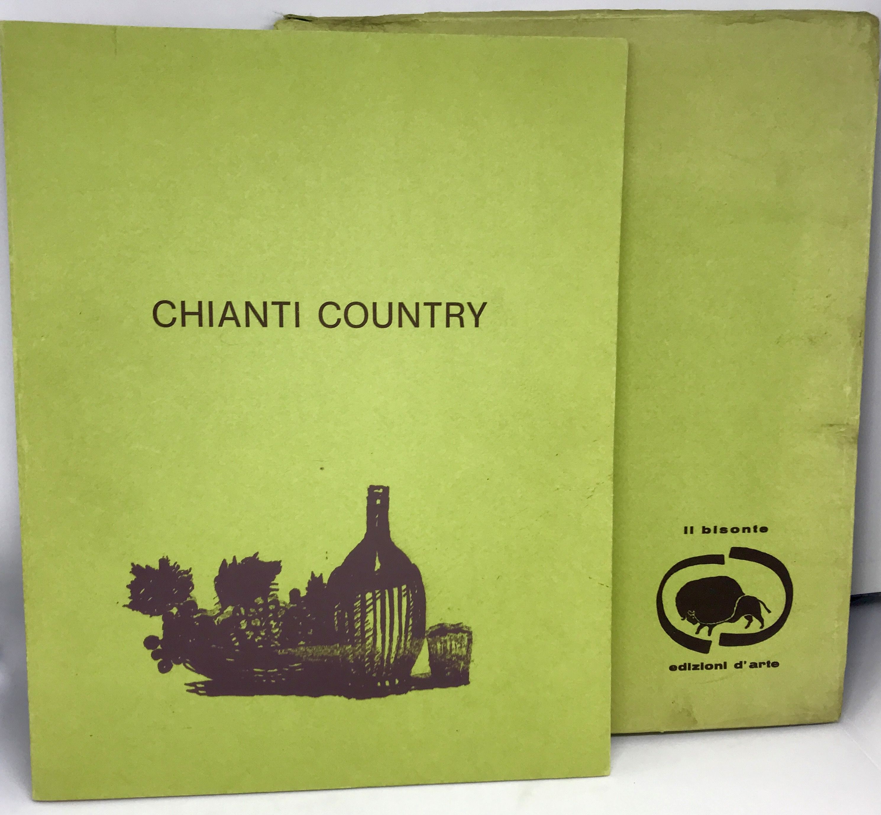 Florence: Il Bisonte - Edizioni d'arte, 1974. Cardboard covers. Green illustrated cardboard wraps. Very good, in good slip case. 103 pages. 25 x 31. Copy 69 of 100. Volume VI. Published in the summer of 1974 by the Consorzio del Vino Classico, two thousand copies, 1500 in Italian and 500 in English, numbered 1/1-100 to xx/100-100. Roman numerals correspond to the reference number of the original lithograph contained in each volume. This copy contains the original lithograph - Houses at La Volpia. Each separate lithograph has been printed by hand on a stellar press at the ateliers of Il Bisonte. Four parts: 1. Homage to Chianti by Carlo Betocchi 2. Chianti Past and Present by Giuseppe Conti 3. Seven plates in colour by Nino Tirinnanzi 4. Twenty plates in black-and-white by Nino Tirinnanzi. Owners gift presentation on half title page. Crisp, clean copy. Slip case toned, expertly repaired and intact. Housed in custom made acid free portfolio