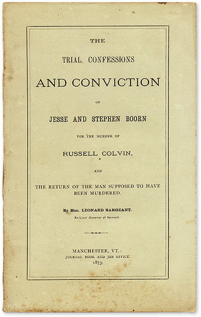 1873. A Constant Reminder that Innocent Persons Can Be Convicted" [Trial]. Boorn, Stephen, Defendant. Boorn, Jesse, Defendant. Sargeant, Leonard [1793-1880], Reporter. The Trial, Confessions and Conviction of Jesse and Stephen Boorn for the Murder of Russell Colvin, And the Return of the Man Supposed to Have Been Murdered. Manchester, VT: Journal Book and Job Office, 1873. 48 pp. Octavo (9" x 5-3/4"). Stab-stitched pamphlet in printed wrappers, publisher advertisement to rear wrapper. Light soiling to wrappers, light foxing to front wrapper, light toning to text. A well-preserved copy. $150. * As noted by McDade, this famous case is a "constant reminder that innocent persons can be convicted. Russell Colvin, the alleged victim, had married a sister of the Boorns and had several children by her. He was mentally deficient and disappeared in 1812. Local gossip credited the Boorns with having disposed of him, presumably because he was a burden on the family. In the spring of 1819 the Boorns were arrested and, either from fear or mental weakness, they told stories involving each other in the death of Colvin--Stephen's amounting to a confession of murder. They were tried and sentenced to be hanged; the state legislature, however, commuted Jesse's sentence to life imprisonment. As a last resort a notice was placed in the papers requesting information about Colvin. A farmer in Monmouth County, New Jersey, believed he recognized a hired man in the vicinity from the description. This man, who was mentally deranged, was enticed to Manchester, arriving...six weeks before the day set for Stephen's execution. It was definitively established that he was the missing Colvin; he had apparently wandered off on his own volition (annotation to Entry 111). Though published fifty-four years after the event, the pamphlet was prepared by one of the defense counsellors and contains important information on the discovery and return of Colvin." McDade, The Annals of Murder 113.