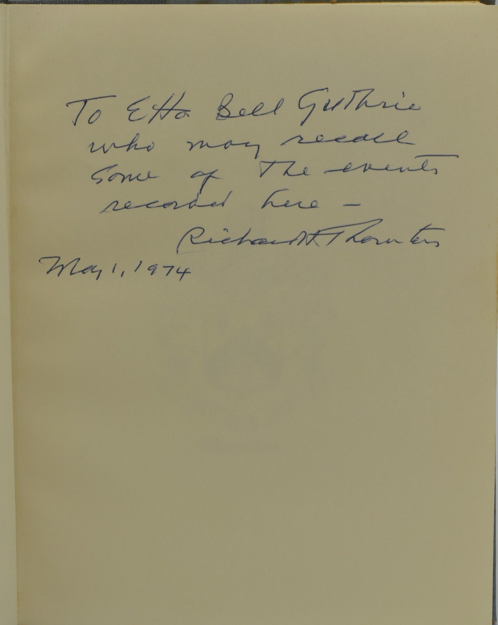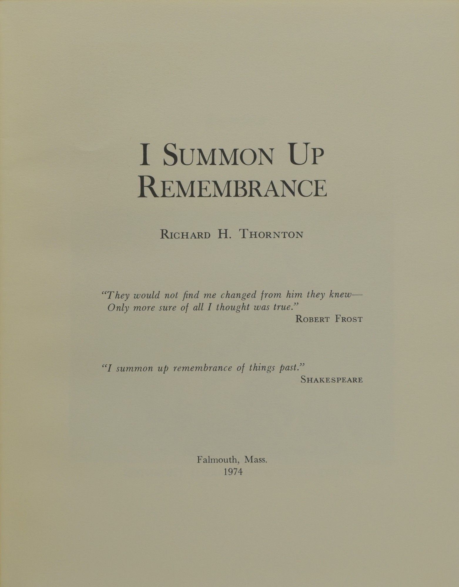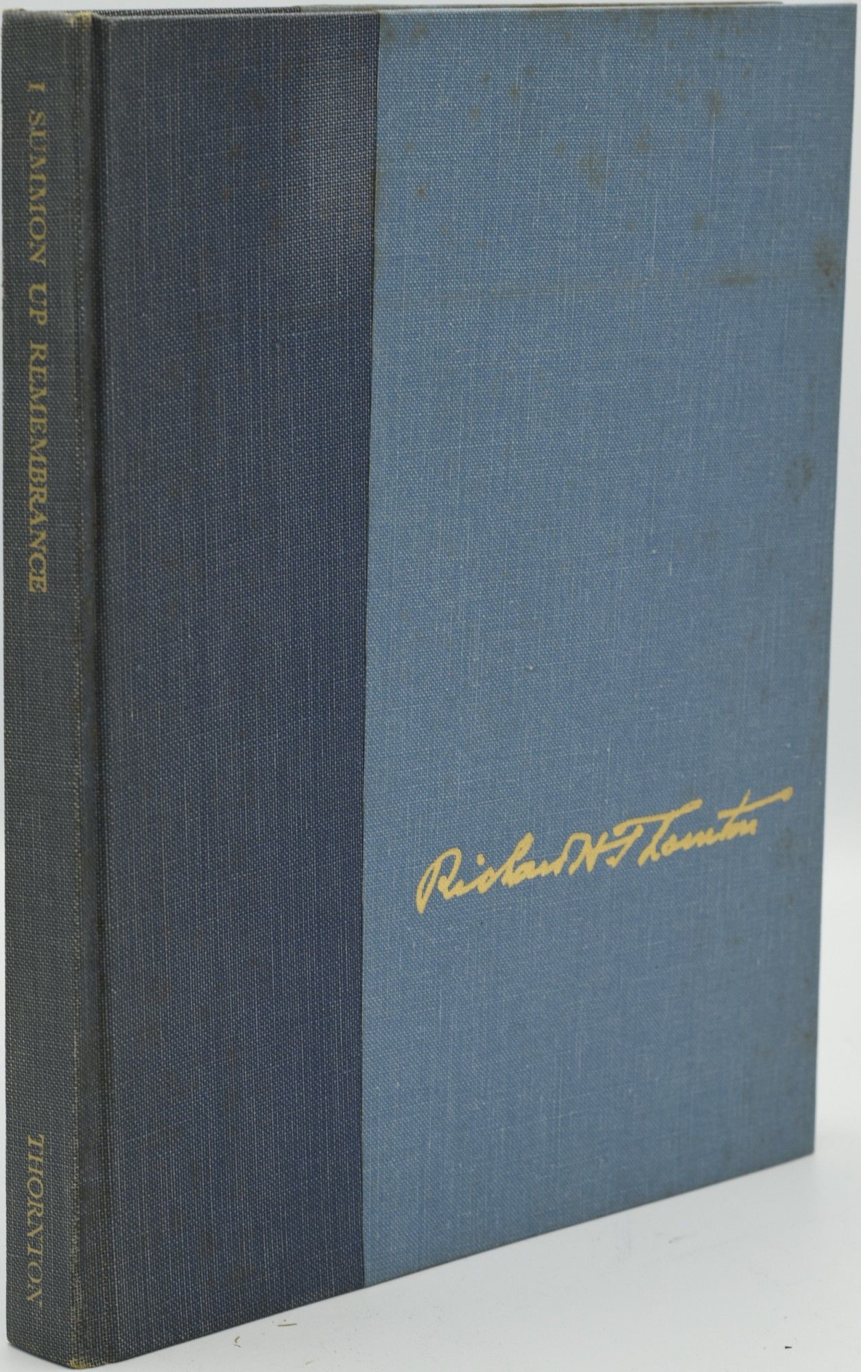 Falmouth, Mass: Richard H. Thornton, 1974. First Edition. Hard Cover. Very Good binding. Signed. First Edition of Richard H. Thornton's autobiographical I Summon Up Remembrance. Signed with a personal inscription by the author on the front endpaper. In text illustrations; with no marks of any kind. Foxing on the boards, and minor shelfwear. Quarter blue cloth over lighter blue cloth, with gilt lettering. Very Good. Very Good binding.