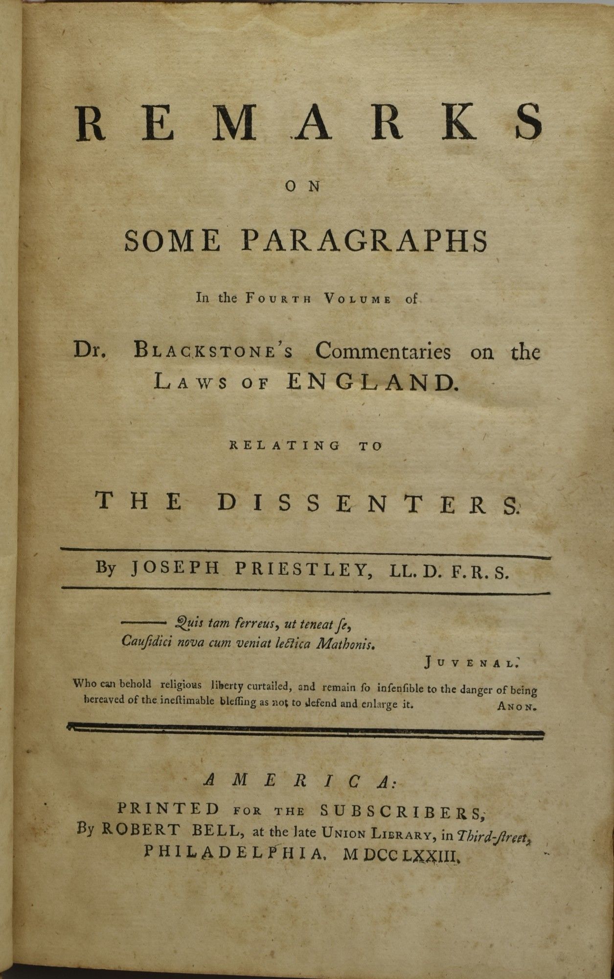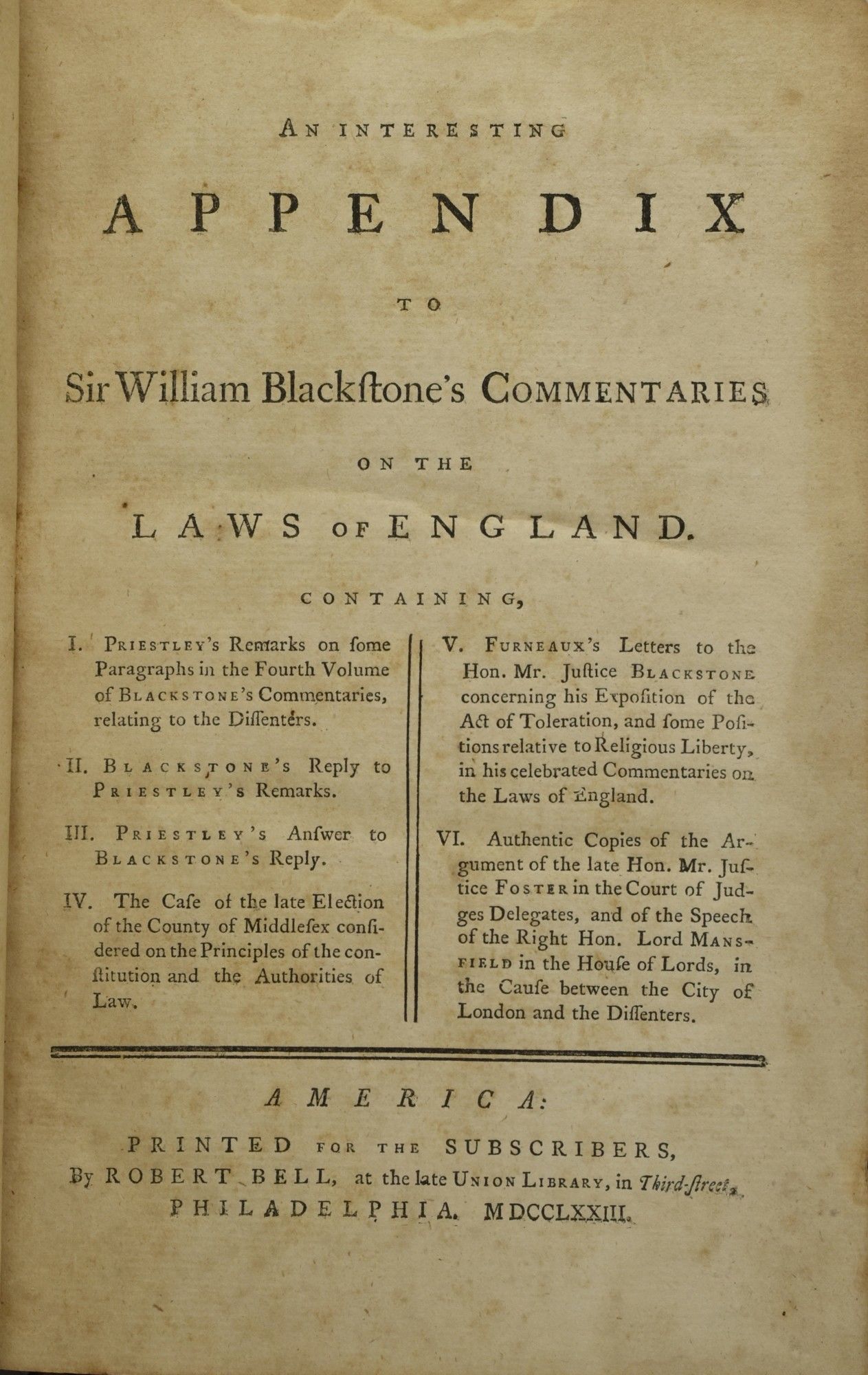 AN INTERESTING APPENDIX TO SIR WILLIAM BLACKSTONE'S COMMENTARIES ON THE LAWS OF ENGLAND. CONTAINING, I. PRIESTLEY'S REMARKS ON SOME PARAGRAPHS IN THE FOURTH VOLUME OF DR. BLACKSTONE'S COMMENTARIES ON THE LAWS OF ENGLAND. RELATING TO THE DISSENTERS. II. BLACKSTONE'S REPLY TO PRIESTLEY'S REMARKS. III. PRIESTLEY'S ANSWER TO BLACKSTONE'S REPLY. IV. THE CASE OF THE LATE ELECTION OF THE COUNTY OF MIDDLESEX CONSIDERED ON THE PRINCIPLES OF THE CONSTITUTION AND THE AUTHORITIES OF LAW. V. FURNEAUX'S LETTERS TO THE HON. MR. JUSTICE BLACKSTONE CONCERNING HIS EXPOSITION OF THE ACT OF TOLERATION, AND SOME POSITIONS RELATIVE TO RELIGIOUS LIBERTY, IN HIS CELEBRATED COMMENTARIES ON THE LAWS OF ENGLAND. VI. AUTHENTIC COPIES OF THE ARGUMENT OF THE LATE HON. MR. JUSTICE FOSTER IN THE COURT OF JUDGES DELEGATES, AND OF THE SPEECH OF THE RIGHT HON. LORD MANSFIELD IN THE HOUSE OF LORDS, IN THE CAUSE BETWEEN THE CITY OF LONDON AND THE DISSENTERS