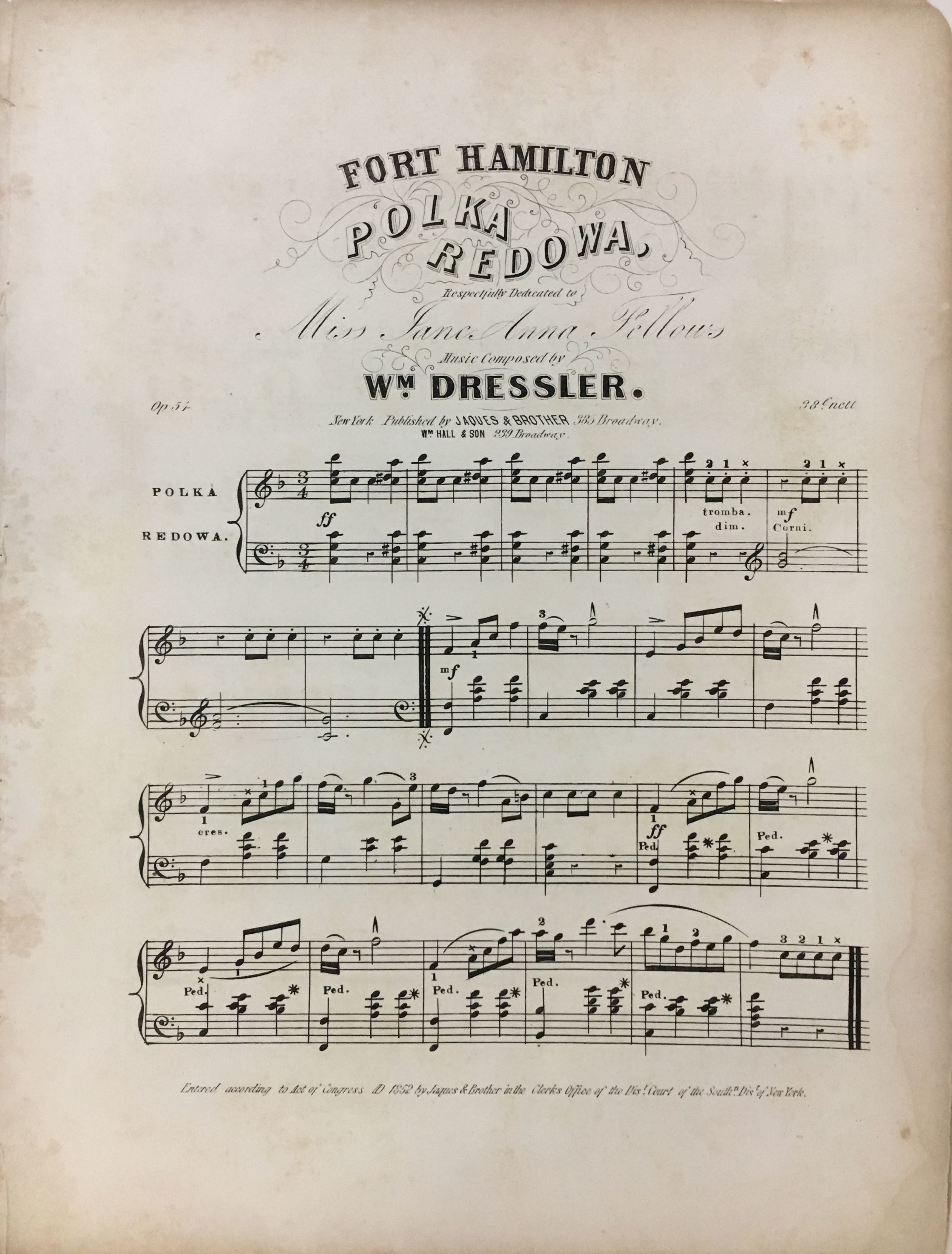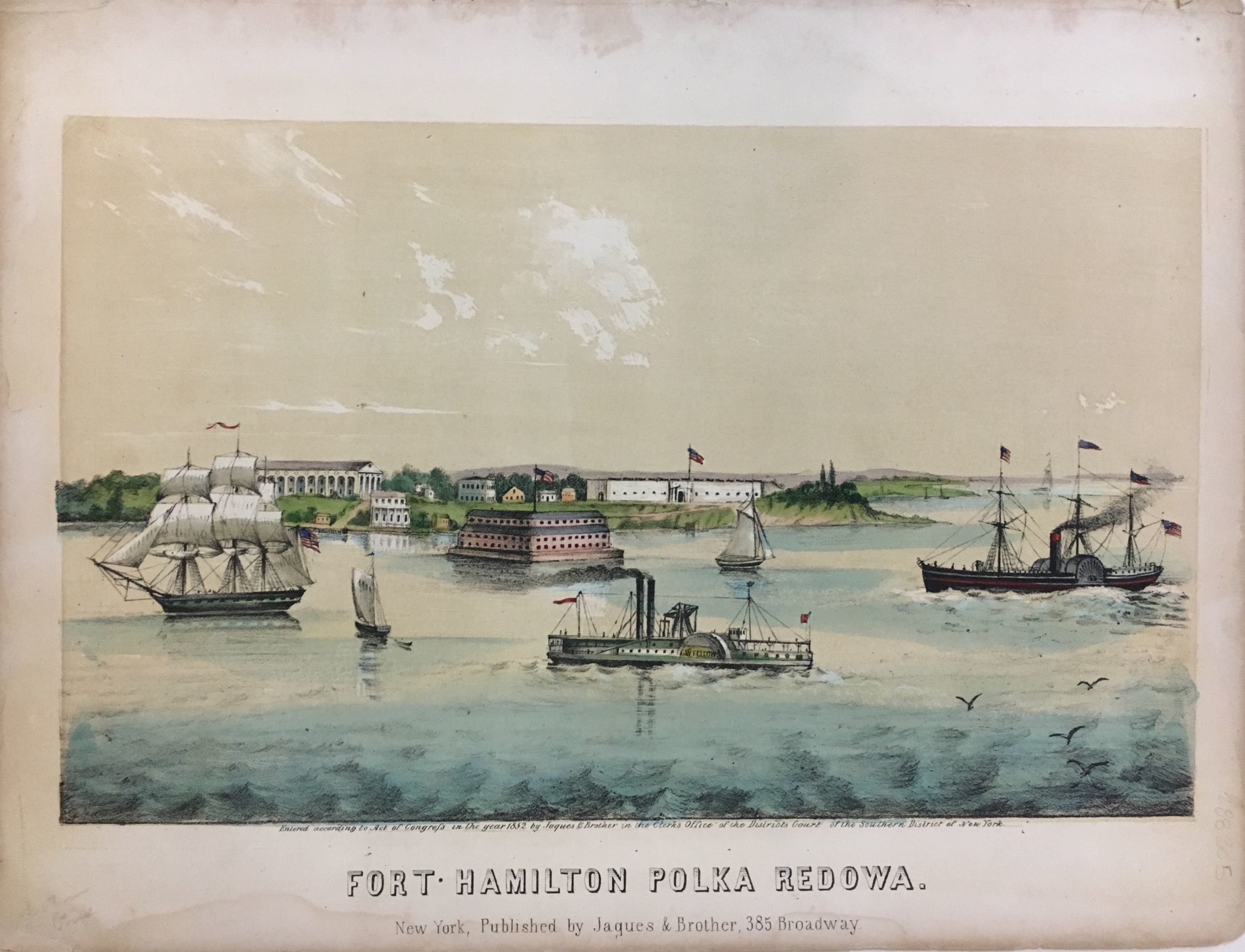Sheet music for solo piano, William Dressler's "Fort Hamilton Polka Redowa, Respectfully Dedicated to Miss Jane Anna Fellows". The image on the front cover shows two steamships, two small sailboats, and a three masted tall ship on the water in front to Fort Hamilton near Bay Ridge in Brooklyn.