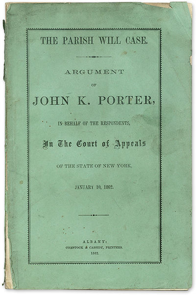 1857. A Notable Nineteenth-Century Will Case Involving Codicils and Questions of Sanity [Trial]. [Parish Will Case]. Parish, Henry [1787-1856]. Porter, John K. [1819-1892]. Parish Will Case. Argument of John K. Porter, In Behalf of the Respondents in the Court of Appeals of the State of New York, January 10, 1862. Albany: Comstock & Cassidy, 1862. 98 pp. Octavo (8-3/4" x 5-1/2"; 22.2 x 14 cm). Stab-stitched pamphlet in printed wrappers, front wrapper detached. Light soiling and moderately edgewear to wrappers, moderate wear to spine ends, moderate toning to text, corners of some leaves dog-eared. $450. * Only edition. Henry Parish, a New York merchant, died in 1856 at age 69. He had made his will in 1842 but subsequently amended it with three codicils signed after he had suffered a paralyzing stroke in 1849. These codicils were contested by James and Daniel Parish, residuary devisees in the will, on the grounds of mental impairment. The New York Surrogate's Court (and subsequently, the state Court of Appeals) ultimately rejected their argument and upheld the codicils. This trial attracted a good deal of attention, and both legal teams were comprised of talented, prominent lawyers. Porter, a lawyer for the contestants, was a highly ranked member of the New York Bar and was involved in state politics. He went on to hold a seat on the New York Court of Appeals before returning to private practice; he was also one of the prosecutors of Charles Guiteau for the assassination of President James Garfield in 1881. Catalogue of the Library of the Harvard Law School (1909) II:1159.