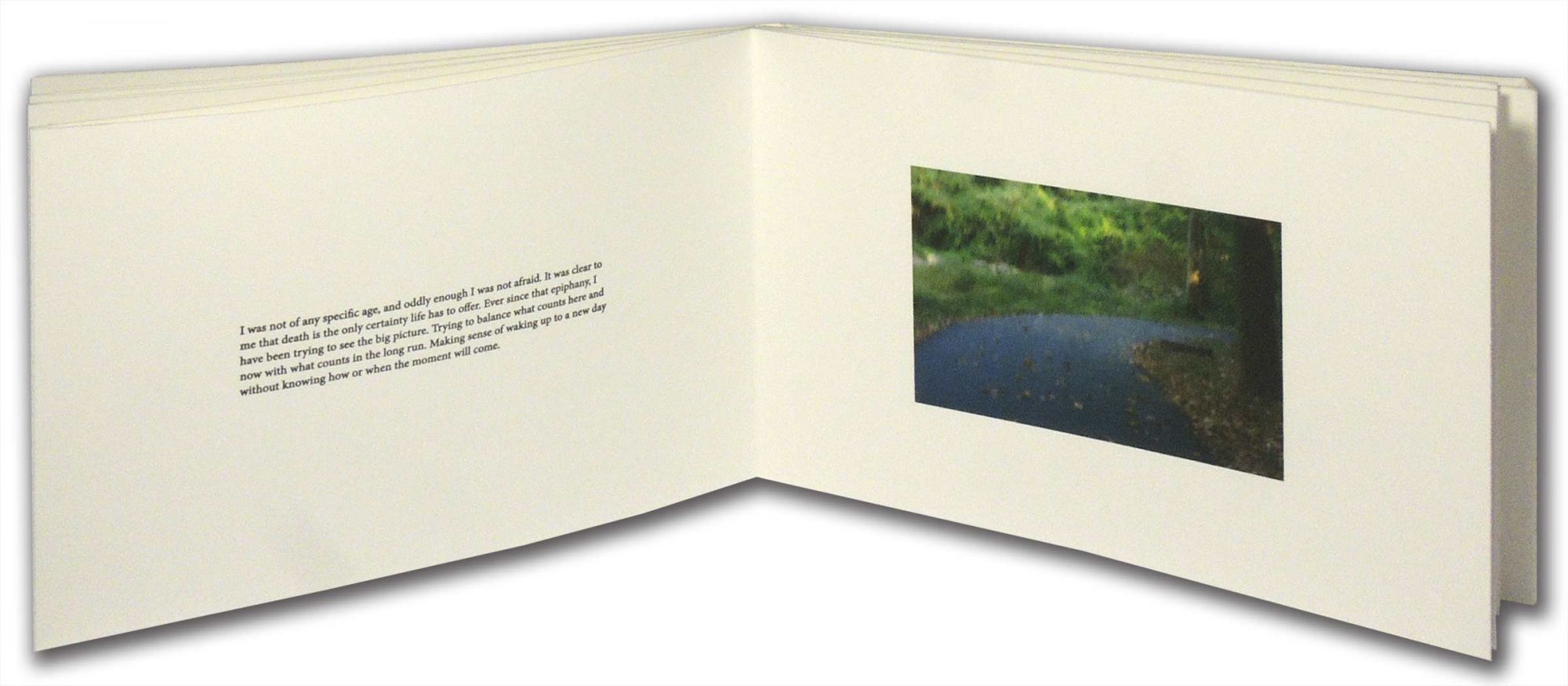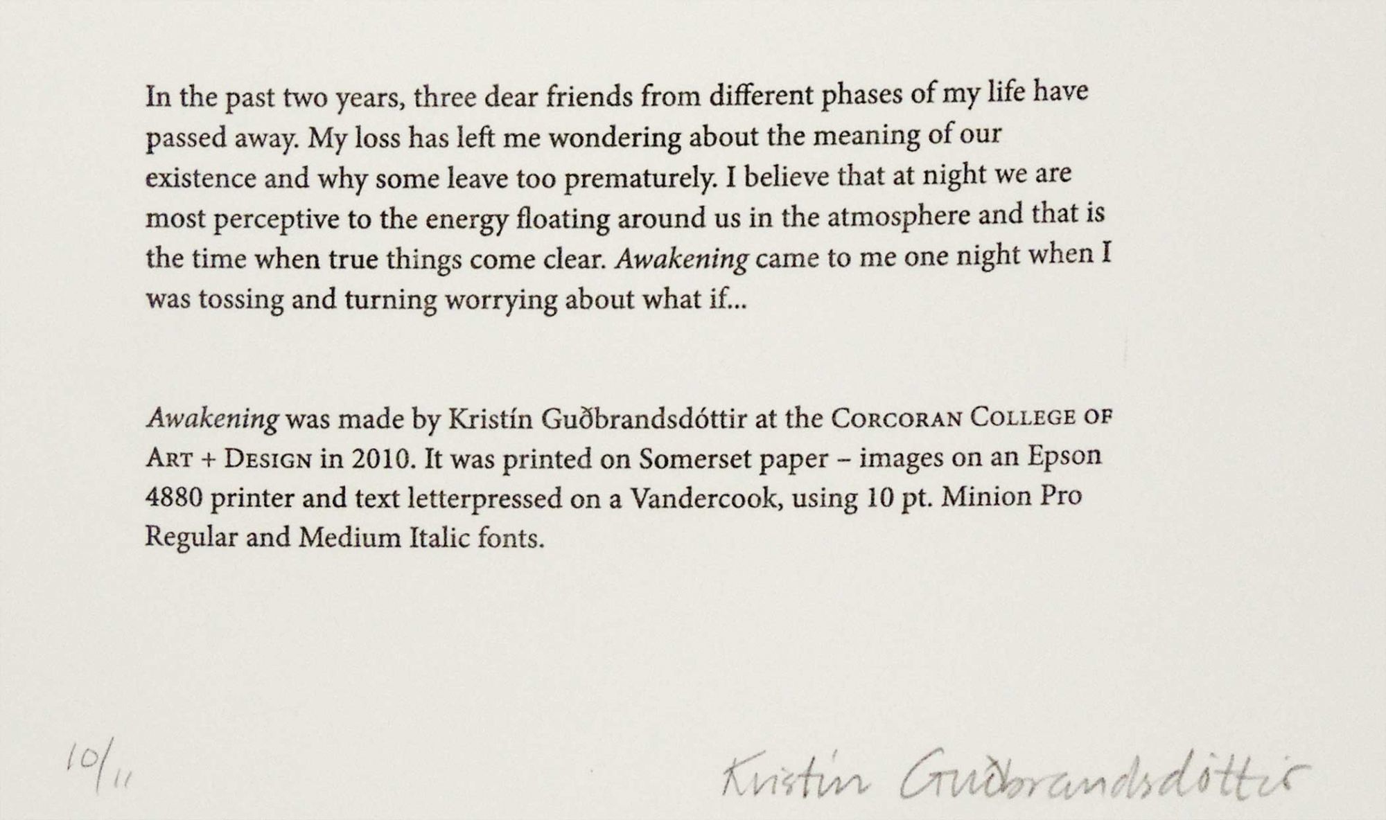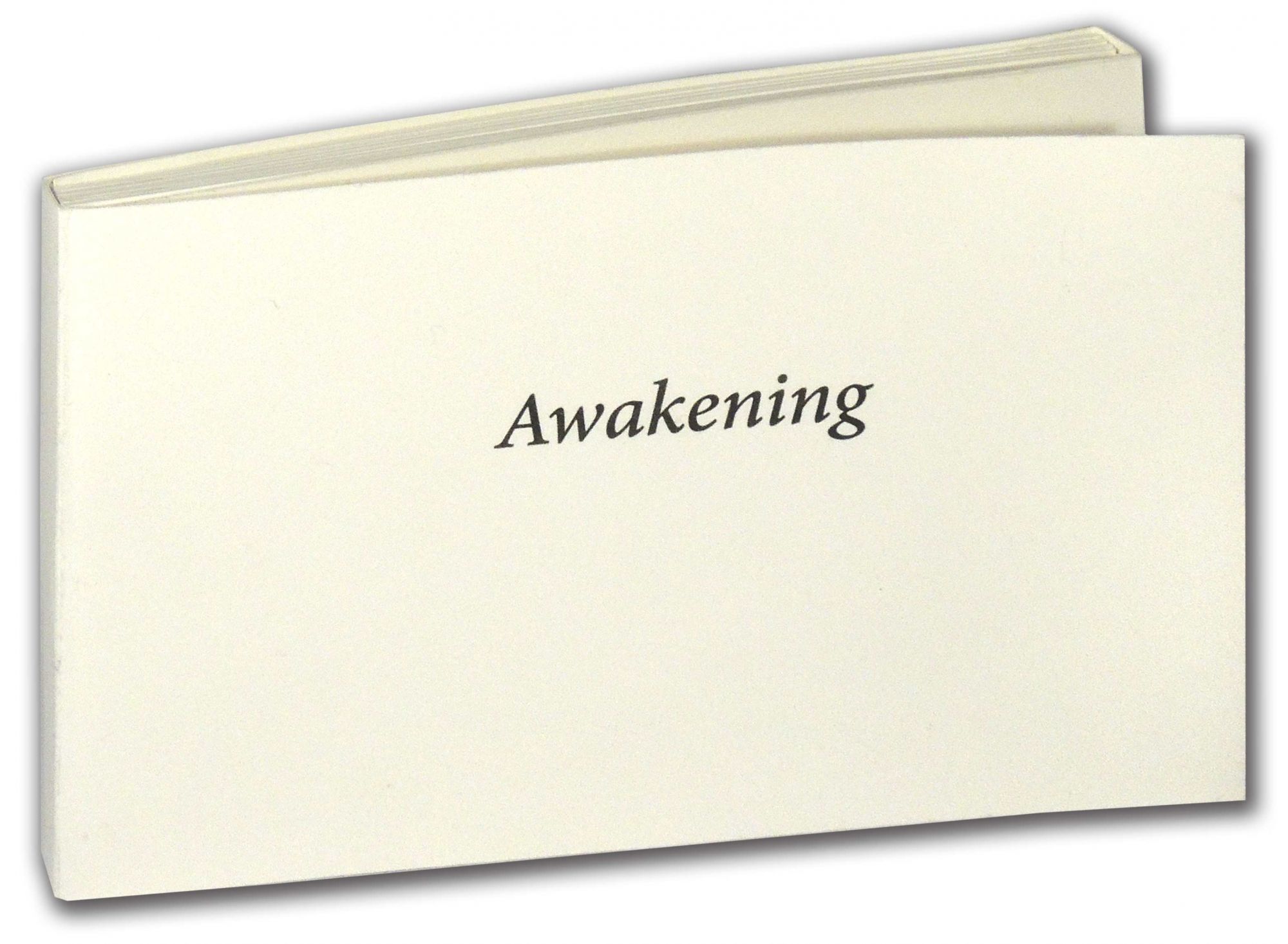 Washington DC: Kristin Gubrandsdottir, 2010. Soft cover. Fine. Soft cover. Number 10 of 11 copies signed and numbered by the book artist. Kristin is a book artist, furniture maker, and teacher from Iceland. Her works typically address feelings, memory, and experience. She studied book arts at the Corcoran College of Art + Design in Washington DC where she made this book. She currently resides in Brussels. Awakening is a powerful photobook done in response to the loss of friends that "left me wondering about the meaning of our existence and why some leave too prematurely." The photographs and text address these questions and the strange feelings that arose in her at night that left her waking up "knowing that one day I will die." The twelve evocative color photos are reproduced in an oblong accordion style book and juxtaposed with letter press text. Printed on Soberest paper using Minion Pro Regular and Medium Italic fonts. Bound in white stiff paper with titling on front cover. In fine condition. Unpainted. PRI/022119.