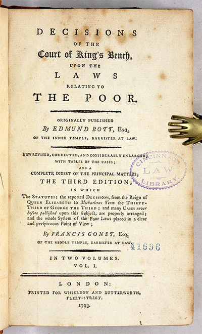 1770. London, 1770. 1st ed. London, 1770. 1st ed. An Authority on the Poor Laws of England [Bott, Edmund]. A Collection of Decisions of the Court of King's Bench Upon the Poor's Laws, Down to the Present Time. In Which are Contained Many Cases Never Before Published; Extracted from the Notes of a Very Eminent Barrister Deceased: The Whole Digested in a Regular Order. By a Barrister at Law of the Inner Temple. To Which are Prefixed, Extracts from the Statutes Concerning the Poor. London: Printed by W. Strahan and M. Woodfall, [c.1770]. [xxxviii], LXXIII, 291 [i.e.292], [3] pp. Octavo (8-1/4" x 5-1/4"). Contemporary sheep, rebacked and re-cornered, blind rules to boards, blind fillets along joints, raised bands, gilt fillets and lettering piece to spine, endpapers renewed. A few nicks and light scuffs to boards, moderate rubbing to extremities. Moderate toning to text, some edgewear to front endleaf facing title page. Early owner annotations and signatures to front endleaf and head of preface, interior otherwise clean. $450. * First edition. This well-indexed and annotated collection of cases and statutes was a well-regarded authority that went through five later editions, the last in 1827. The ESTC conjectures 1770 as the publication date, others suggest 1771. Despite its popularity, all editions of this book are scarce. OCLC locates 9 copies of the first edition in North American law libraries (Columbia, Harvard, LA County, Library of Congress, State of Oregon, UC-Berkeley, University of Georgia, University of Michigan, University of Pennsylvania). English Short-Title Catalogue T184869.