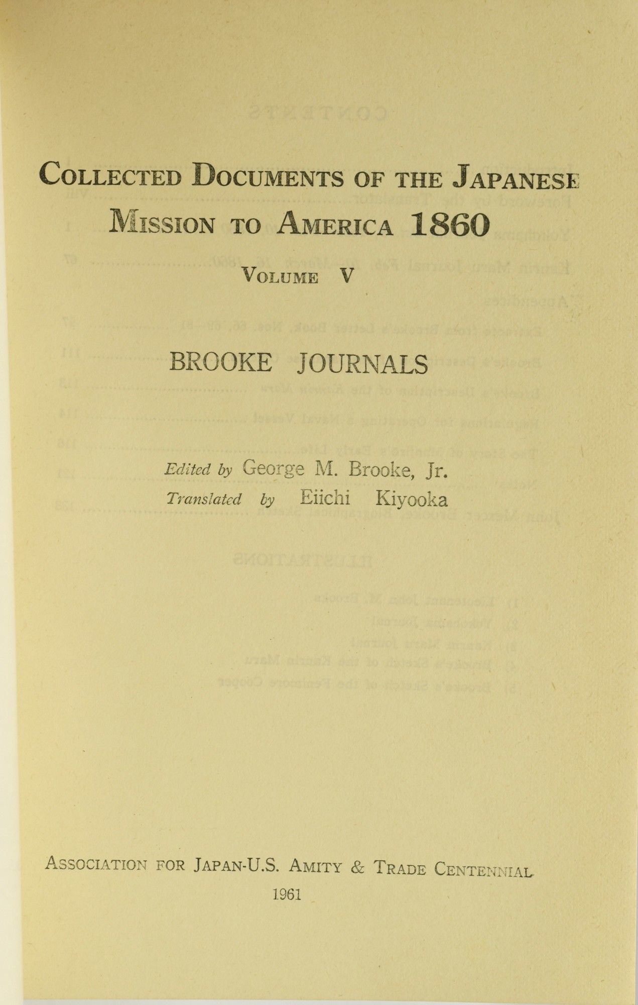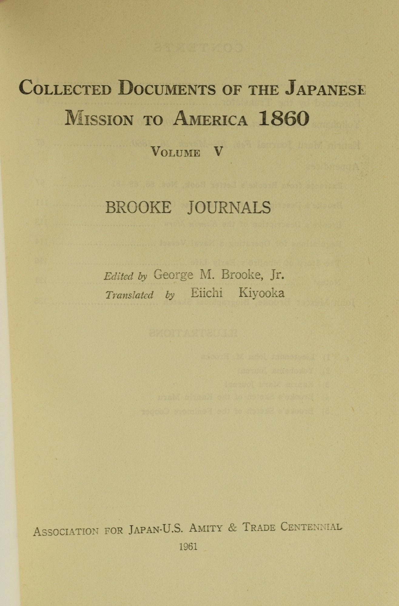 [Tokyo]: Association for Japan-U.S. Amity & Trade Centennial, 1961. First Bilingual Edition. Hard Cover. Near Fine binding. Volume V only of the First Bilingual Edition of the Collected Documents of the Japanese Mission to America, 1860: Brooke Journals. With text in English and Japanese, and three leaves of five photographic plates. John Mercer Brooke sailed with the Kanrin Maru, the Japanese warship accompanying the 1860 Japanese Embassy to the U.S. Bookplate on the front pastedown of the editor, George M. Brooke, Jr. Else no marks of any kind. Blue cloth with gilt Japanese lettering on the spine. Near Fine. Near Fine binding.
