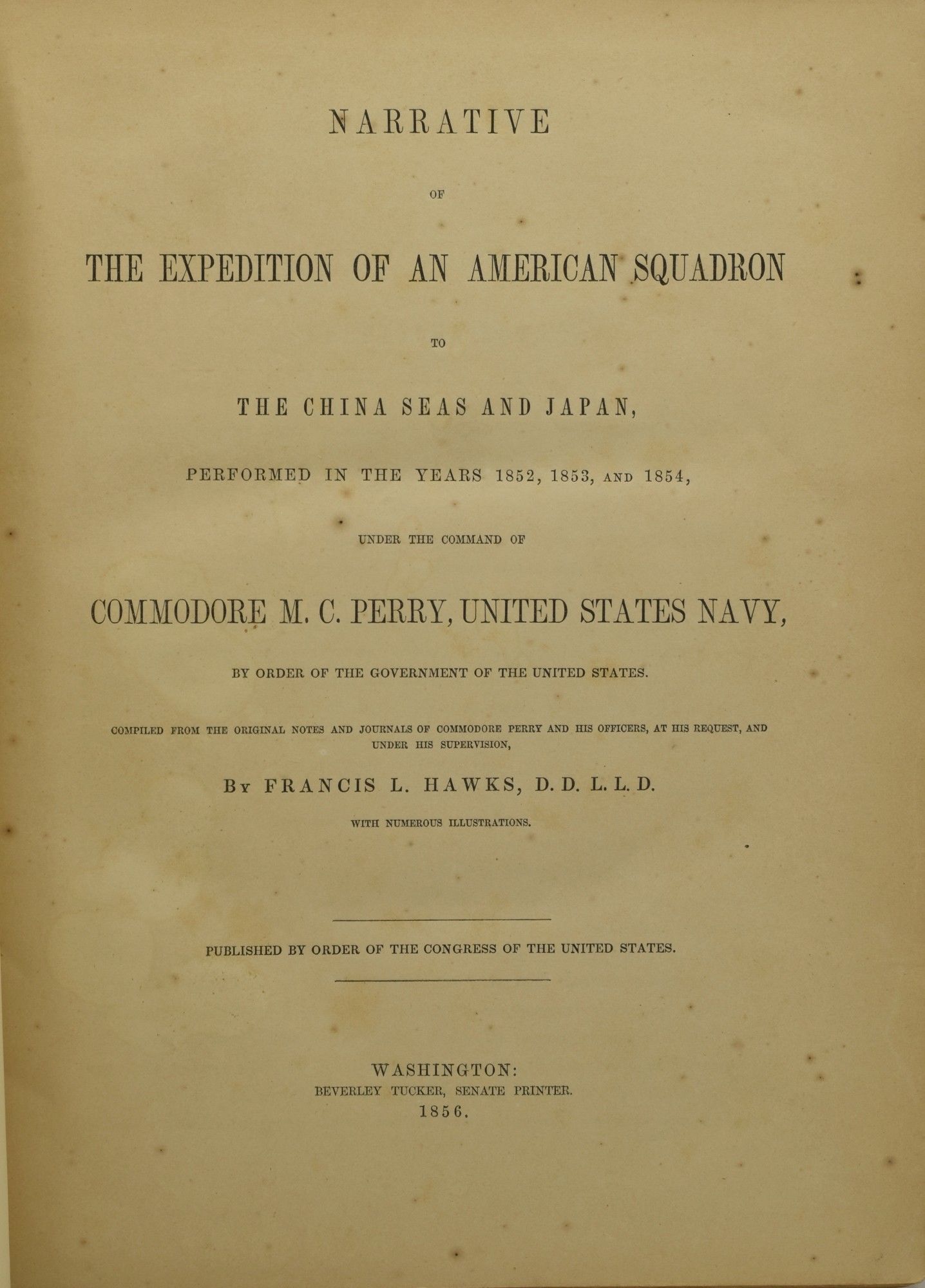 NARRATIVE OF THE EXPEDITION OF AN AMERICAN SQUADRON TO THE CHINA SEAS AND JAPAN, PERFORMED IN THE YEARS 1852, 1853, AND 1854, UNDER THE COMMAND OF COMMODORE M. C. PERRY, UNITED STATES NAVY, BY ORDER OF THE GOVERNMENT OF THE UNITED STATES. COMPILED FROM THE ORIGINAL NOTES AND JOURNALS OF COMMODORE PERRY AND HIS OFFICERS, AT HIS REQUEST, AND UNDER HIS SUPERVISION, BY FRANCIS L. HAWKS