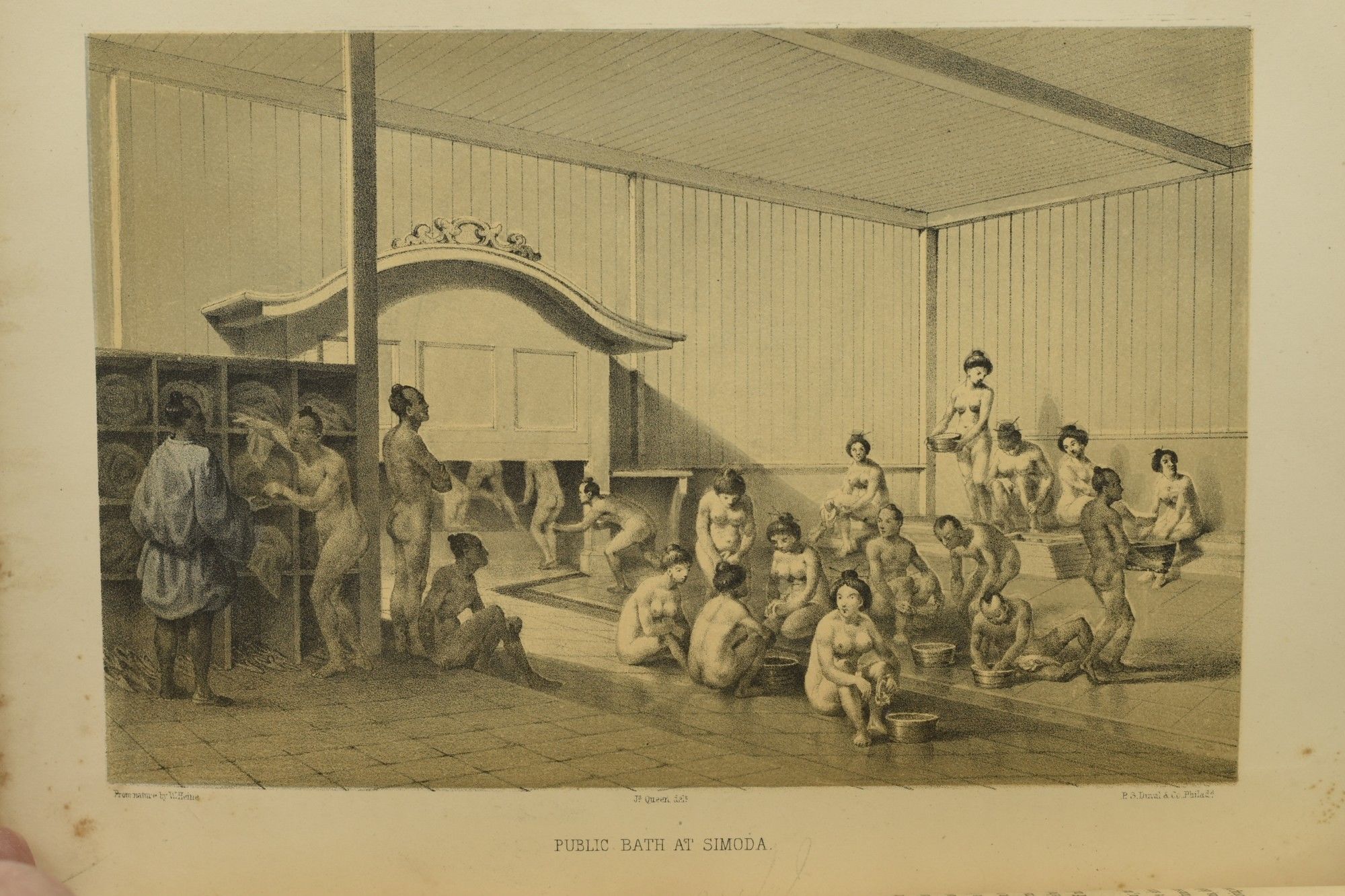 Washington: Beverley Tucker, Senate Printer, 1856. Second Edition. Hard Cover. Very Good binding. Second Edition of Vol. I and II only of Commodore Perry's Narrative of the Expedition of an American Squadron to the China Seas and Japan, compiled by Francis L. Hawks, with the suppressed "Public Bath at Simoda" plate which depicted men and women together in the nude (Vol. I, p. 408). This is the Senate Report, preceded by the House Report. Vol. I being the 'Narrative' and Vol. II the 'Natural History Reports' of the expedition. Lacking two plates of facsimile Japanese paintings in Vol. I, also the plate of the Temple of Hat-chi-man-ya-chu-ro; the plate of the First Landing at Goraham is bound in at p. 272 instead of 256. With 86 plates in Vol. I and 42 plates of 43 in Vol. II, many aquatint or hand colored. With three additional cartographic plates and two folding maps in Vol. I, and 16 large folding maps in Vol. II, with some paper reinforcements at the folds. Seven leaves of facsimile text, of the Japanese language version of the treaty signed during Perry's expedition. Modern rebinding with library style gray cloth, with gilt lettering on the spine. Very Good. (Sabin 30958). Very Good binding.