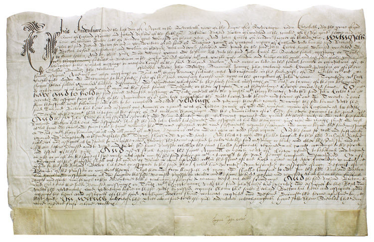 England, 1575. Ink on parchment, 330x525cm. Old folds, parchment hanging tab with partial wax seal. Verso stained and darkened from folded storage, with legible contemporary annotations. Ink on parchment, 330x525cm. This indenture, between Richard Briton of Woodford and Henrie or William Berton late of London, Thomas Christie, and John Entes of London relates to property in the capital messuage or mansion house of Richard Breton, just outside "steplegate," London.