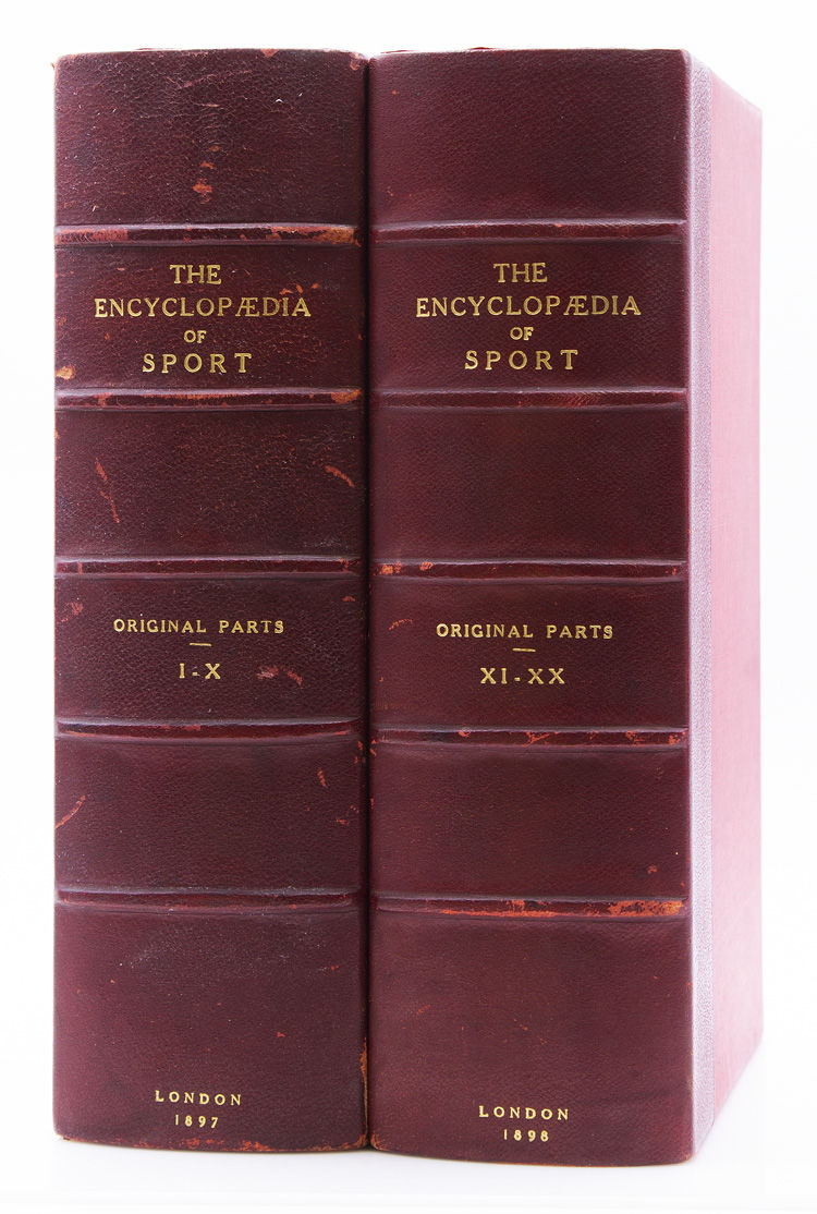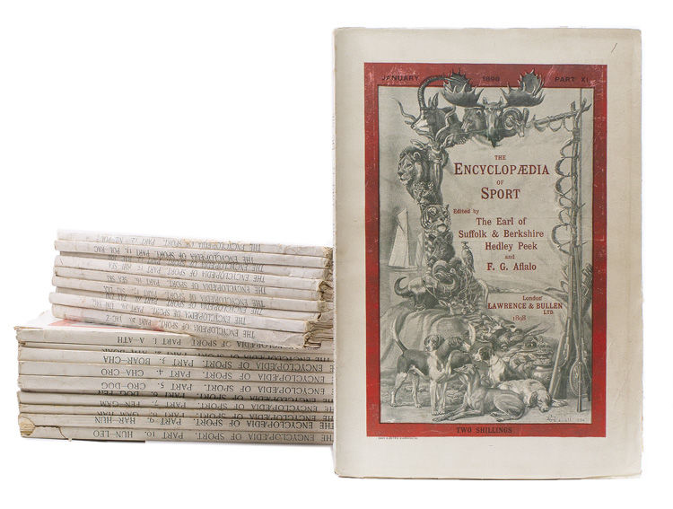 London: Lawrence and Bullen Ltd. 16 Henrietta Street, Covent Garden, 1898. First edition. 40 full-page photogravures and other illustrations throughout. Original parts issue, each with 2 photogravure plates, numerous advertising inserts. 2 vols. 4to. Original pictorial wrappers with design by E. Caldwell. Largely unopened. In two half red morocco boxes. First edition. 40 full-page photogravures and other illustrations throughout. Original parts issue, each with 2 photogravure plates, numerous advertising inserts. 2 vols. 4to. From Aardvark to Zebra, a very beautifully produced and useful reference, here in its rarest state. Includes Angling, Big Game, Coursing, Dogs, Football, Golf, Hunting, Shooting, Wrestling, etc.