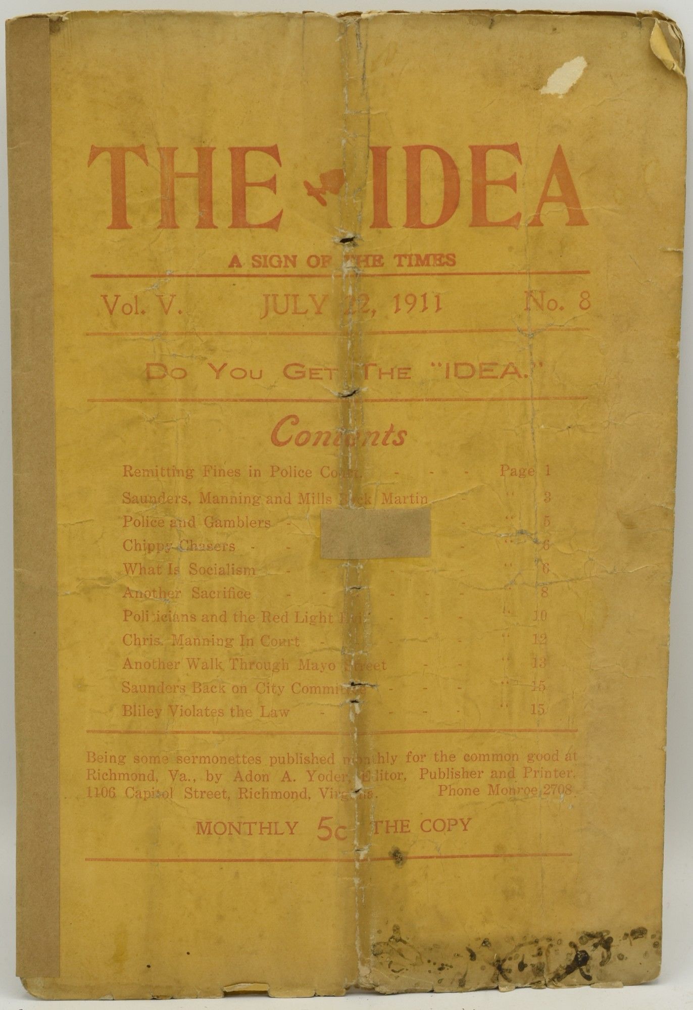 Richmond, VA: Adon A. Yoder, 1911. Original Wrappers. Good binding. THE IDEA, edited by Richmond's muckraking socialist writer, Adon Yoder, quite uncommon, and consisting of "Sermonettes Published Weekly for The Common Good". Yoder indeed raked the muck of Richmond, taking on the saloons, the red-light districts, the police, and the City Fathers. No one was safe from his caustic pen, and he agitated plenty, ultimately ending up in jail for his efforts.~From Christian's History of Richmond: "Adon A. Yoder came to the city and began the publication of a weekly pamphlet called THE IDEA. He wielded a caustic pen, and began a criticism o many of the city officials, charging them with the responsibility of abuses that existed in the city. Several bought suit against Yoder and his publisher and obtained a judgment. He was also charged with libel, and not being able to prove his statements, he was convicted and punished. With the exception of reconstruction, this is the second time a writer has been sent to jail in Richmond..." (p. 521). See Harry Kollatz' RICHMOND AND RAGTIME, for extensive recounting of some of Yoder's exploits in the fair City of Richmond in the early years of the last century. This copy creased from being folding in half, and reinforced with paper tape at the spine. Good binding.