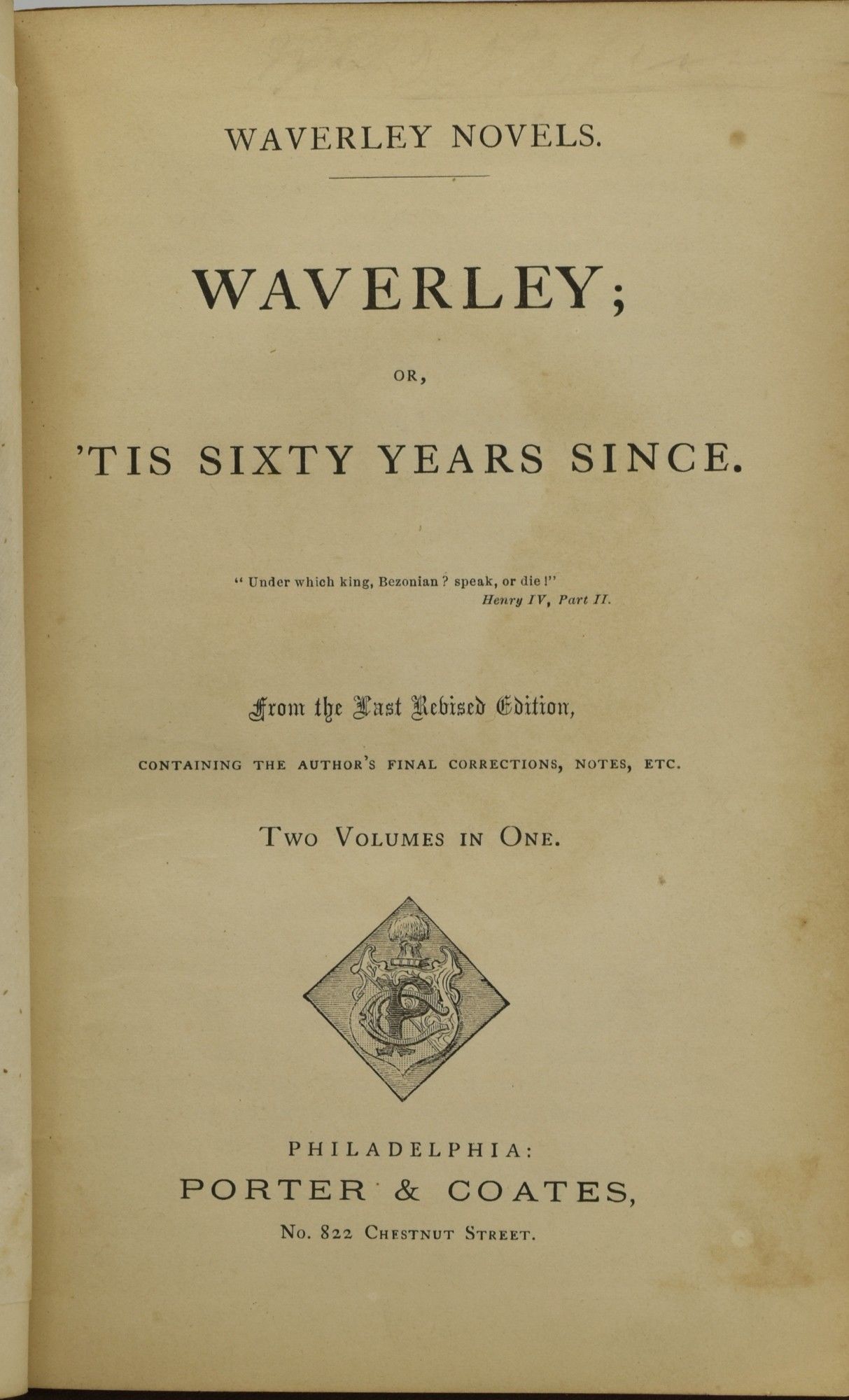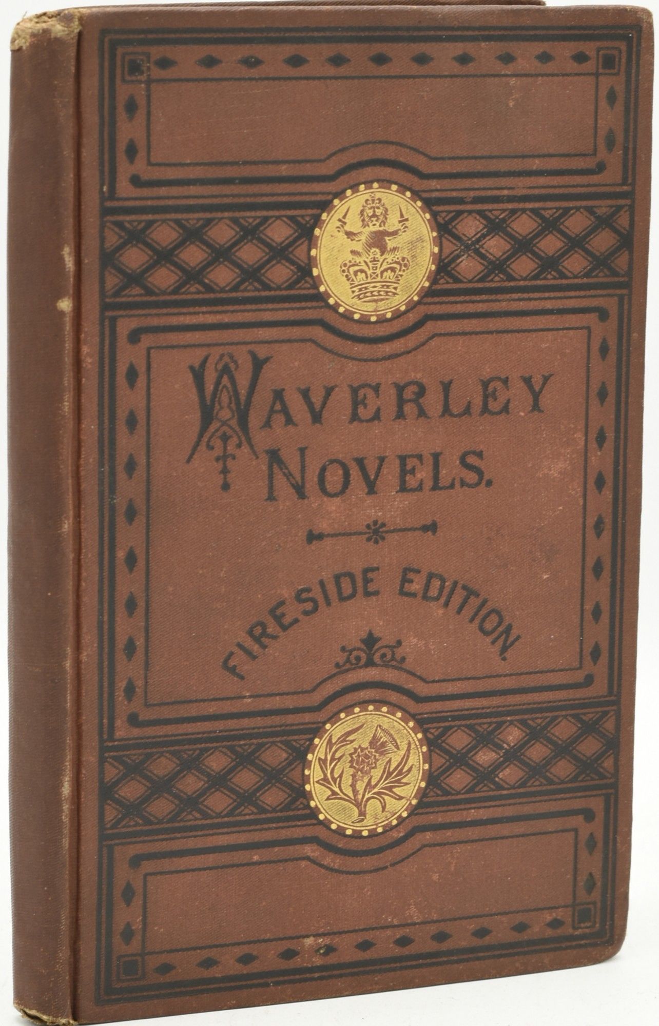 Philadelphia: Porter & Coates. Salesman Sample. Hard Cover. Good binding. A salesman sample of Sir Walter Scott's Waverley; Or, 'Tis Sixty Years Since, published by Porter & Coates. With portrait frontispiece, title page, pp. 213-244 of the text, and eighteen engraved plates. Publisher's sample spine pasted onto the front pastedown. Faded personal inscription on the front flyleaf. Salesman order pages lacking, torn from the rear. Brick colored cloth, with lettering and decoration in gold and black. Good. Good binding.