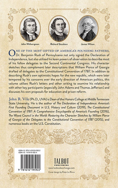 2019. ISBN-13: 9781616195922. ISBN-10: 1616195924. Vile, John R. A Constellation of Great Men: Exploring the Character Sketches by Dr. Benjamin Rush of Pennsylvania of the Signers of the Declaration of Independence. xix, 261 pp. Clark, New Jersey: Talbot Publishing (an imprint of The Lawbook Exchange, Ltd.), 2019. ISBN-13: 9781616195922. ISBN-10: 1616195924. Hardcover. New. $75. * One of the most gifted of America's founding fathers, Dr. Benjamin Rush of Pennsylvania not only signed the Declaration of Independence, but also utilized his keen powers of observation to describe most of his fellow delegates to the Second Continental Congress. His character sketches thus complement later descriptions that William Pierce of Georgia drafted of delegates to the Constitutional Convention of 1787. In addition to describing Rush's own optimistic hopes for the new republic, which were later tempered by his concerns over the early direction of American politics, this volume utilizes Rush's letters and other writing to examine his relationship with other key participants (especially John Adams and Thomas Jefferson) and discusses his own proposals for education and prison reform. John R. Vile (Ph.D., UVA) is Dean of the Honors College at Middle Tennessee State University. He is the author of The Declaration of Independence: America's First Founding Document in U.S. History and Culture (2019), The Constitutional Convention of 1787: A Comprehensive Encyclopedia of America's Founding (2016), The Wisest Council in the World: Restoring the Character Sketches by William Pierce of Georgia of the Delegates to the Constitutional Convention of 1787 (2015), and numerous books on the U.S. Constitution.