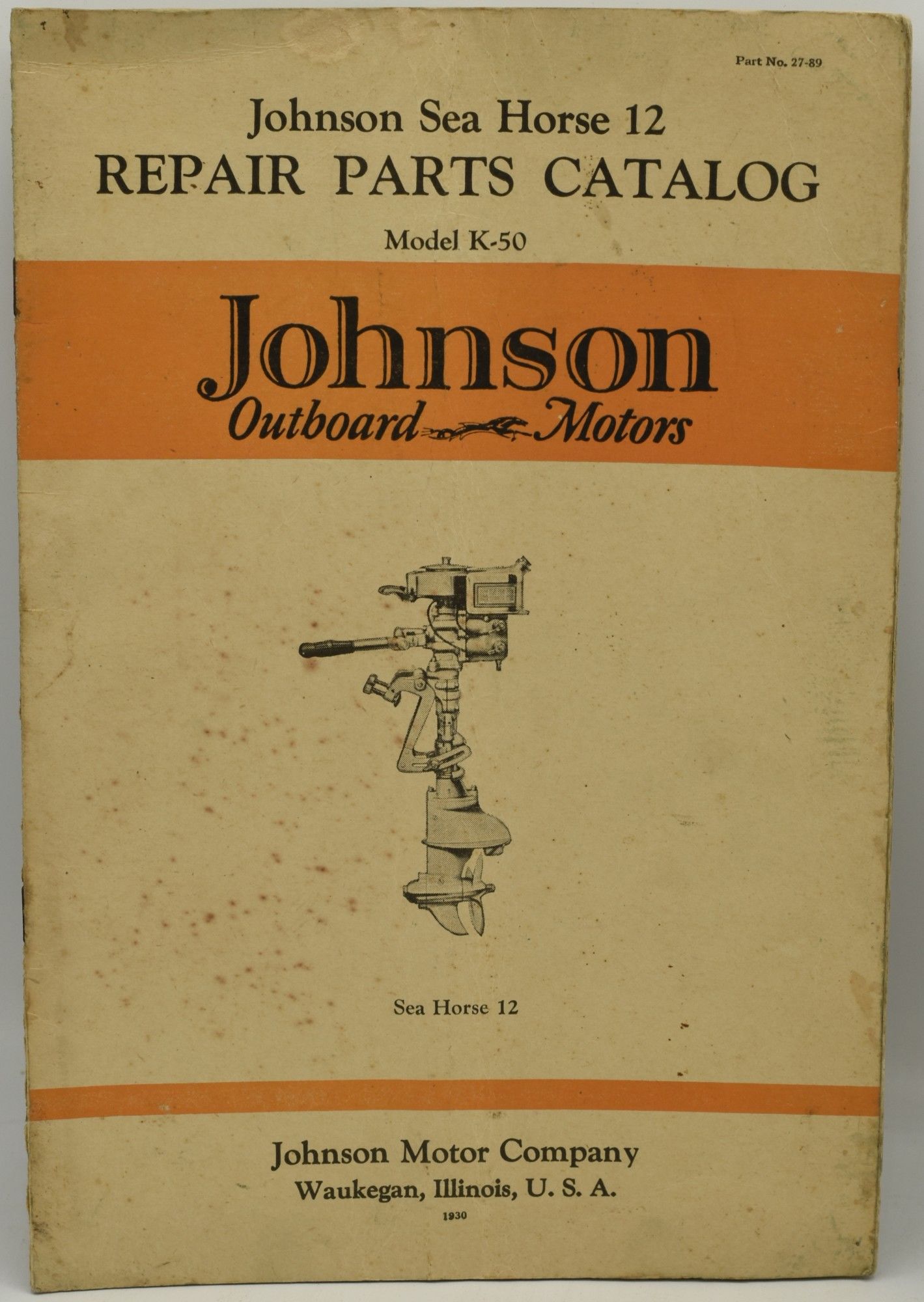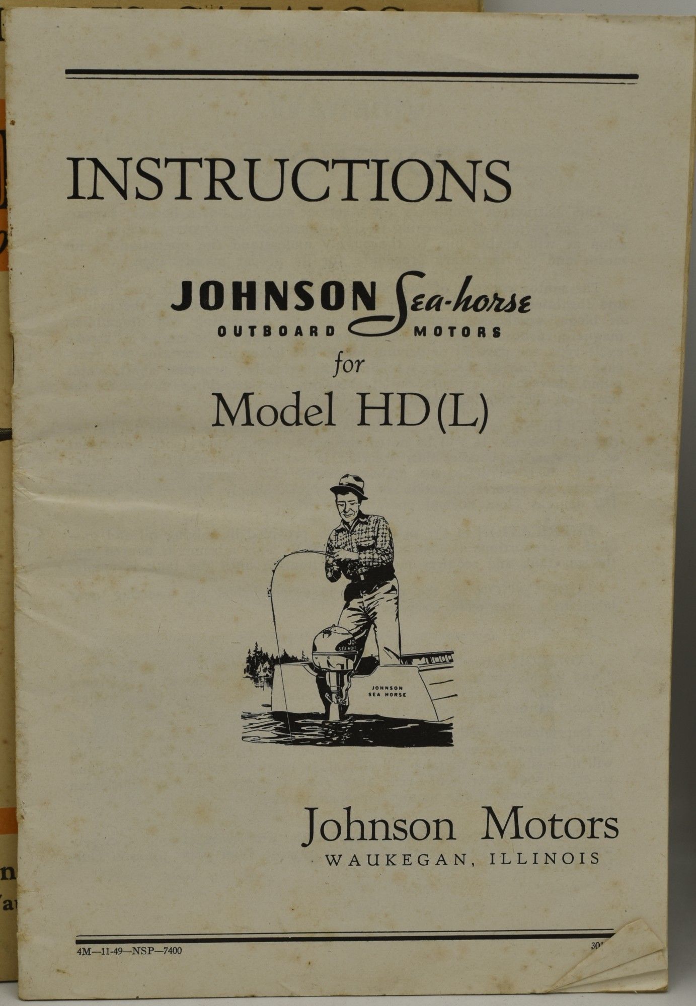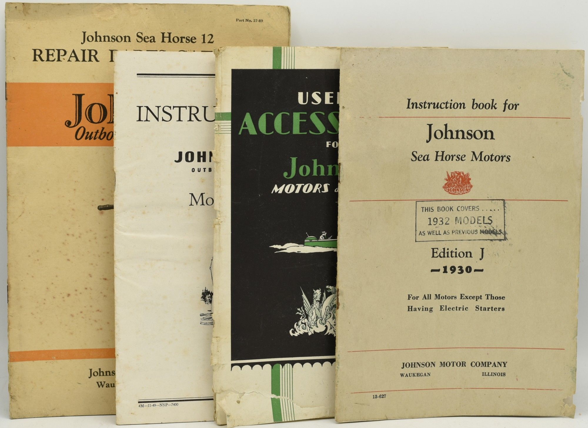 [4 JOHNSON SEA HORSE MOTORS REPAIR BOOKLETS] INSTRUCTIONS; JOHNSON SEA-HORSE OUTBOARD MOTORS, FOR MODEL HD(L). | INSTRUCTION BOOK FOR JOHNSON SEA HORSE MOTORS, [THIS BOOK COVERS 1932 MODELS AS WELL AS PREVIOUS MODELS] EDITION J 1930. FOR ALL MOTORS EXCEPT THOSE HAVING ELECTRIC STARTERS. | JOHNSON SEA HORSE 12 REPAIR PARTS CATALOG. MODEL K-50. | USEFUL ACCESSORIES FOR JOHNSON MOTORS AND BOATS. (FOUR VOLUMES)