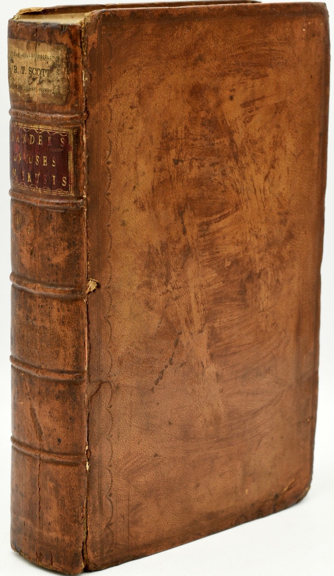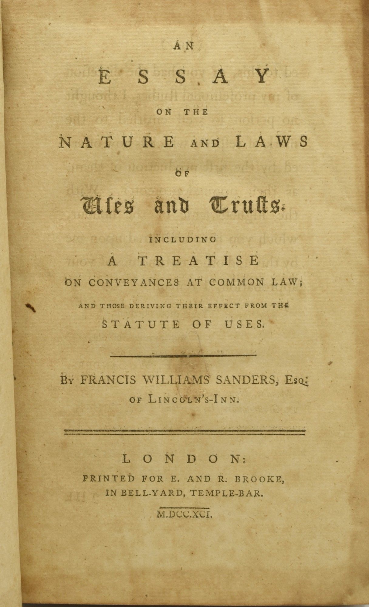 London: Printed for E. and R. Brooke, 1791. First Edition. Full Leather. Very Good binding. First Edition of Francis Williams Sanders' Essay on the Nature and Laws of Uses and Trusts. "A professional treatise of deservedly high repute" (DNB). Collates complete, with index and advertising leaf at the rear; [2], v, [3], 564, [16] pp. Joints cracked but holding well. Name label pasted on the spine. Contemporary full calf binding, with a red leather label. (ESTC T100936. DNB XVII, 747.). Very Good binding.