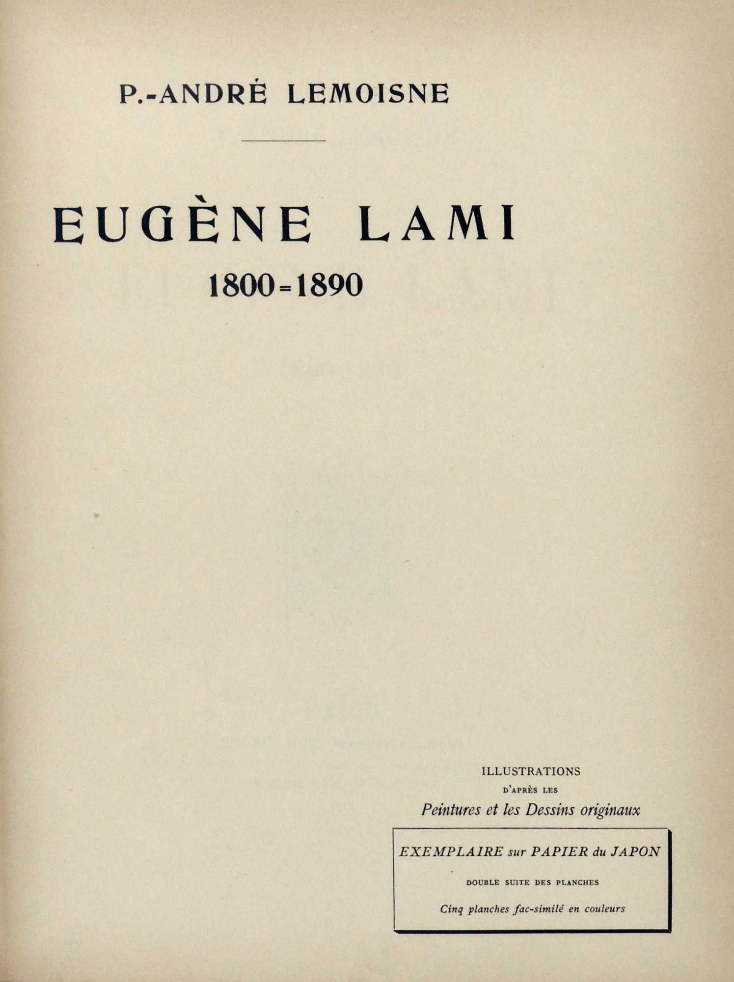 Paris: Goupil & Cie, 1912. Hardcover. Very Good -. Hardcover. Number 8 of 75 copies on Japanese paper. This sumptuous book recounts the life and work of Eugene Lami, the famed French painter, illustrator, and designer. It is extensively illustrated throughout with double plates of each of the works. Each is protected by a tissue guard. In full brown leather with ornate gilt ornaments decorating the covers. There are four raised bands on the spine with gilt decorations, author, and title. Light scuffing, bumping, and tear to top of spine along joint along with missing leather where label was removed. Unfortunately this heavy ex-library book's binding is detached from the text block. The free front endpaper is torn as is the half title. Ex-library although library markings are relatively unobtrusive, with an ownership stamp on the verso of the original cover bound in, small ink numbers on verso of title page and scraping to the rear free endpaper where sign-out card removed. The interior of the book is otherwise in very good condition. With the bookplate of Courtland Bishop (1870-1935) the pioneer U.S. aviator, autoist, traveler, and noted book collector. Price reflects flaws. In French. Folio volume with 206 pages plus plates. Heavy volume may require extra postage. ART/031419.