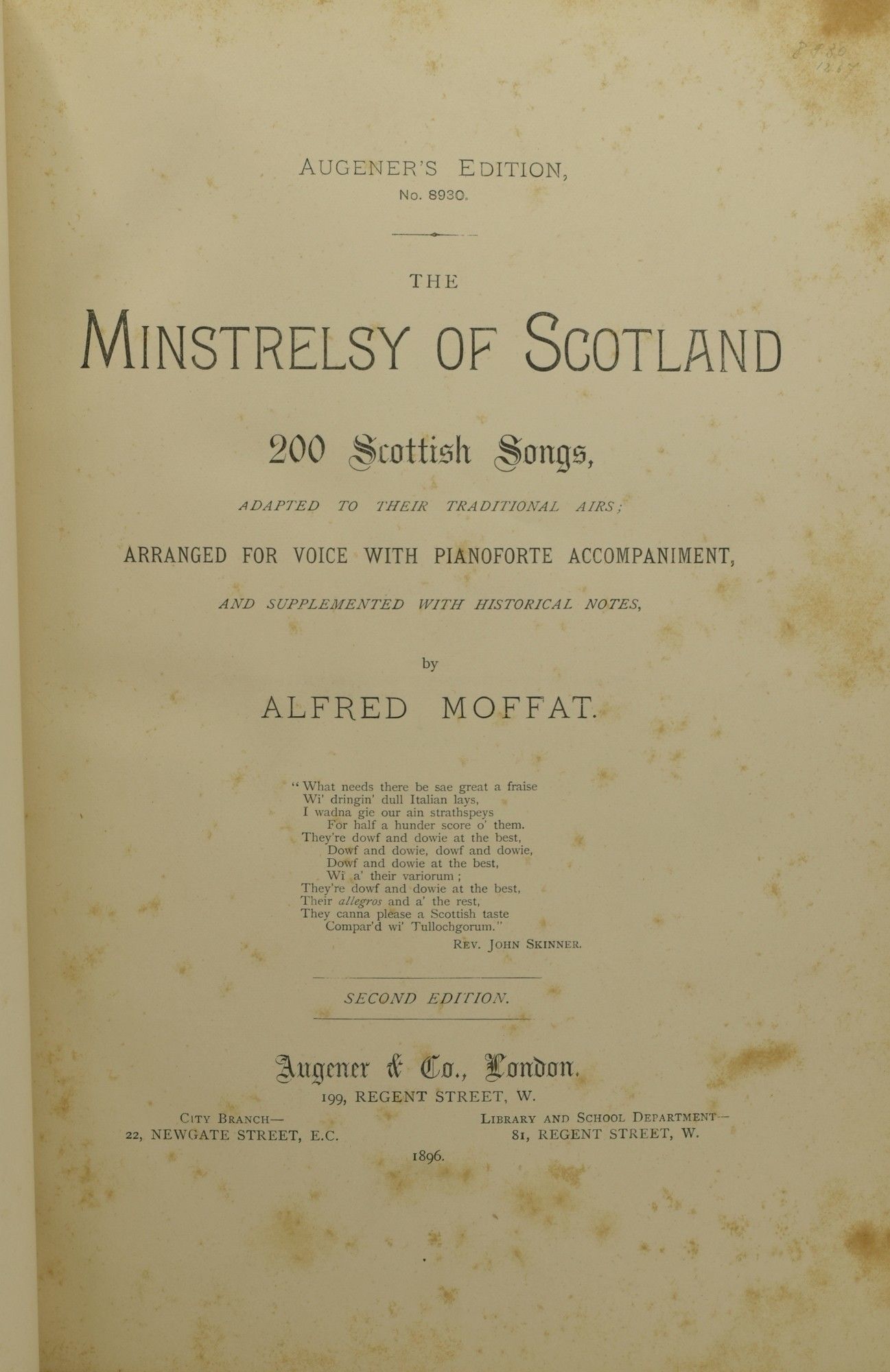 London: Augeneer & Co, 1896. Second Edition. Hard Cover. Very Good binding. Second Edition of Alfred Moffat's The Minstrelsy of Scotland, 200 Scottish Songs. Musical scores throughout. Previous owner's name on the front endpaper; foxing to the preliminaries. Green cloth with gilt lettering and borders. Very Good. Five institutional holdings found on OCLC. Uncommon. Very Good binding.