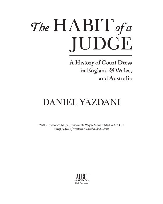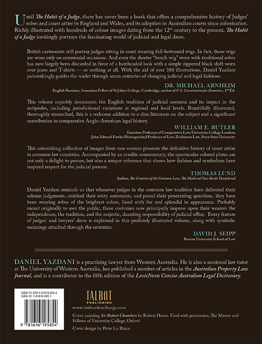 2019. ISBN-13: 9781616195854 ISBN-10: 1616195851. Yazdani, Daniel. The Habit of a Judge: A History of Court Dress in England & Wales, and Australia. xvii, 303 pp. 322 color illustrations. Clark, New Jersey: Talbot Publishing (an imprint of The Lawbook Exchange, Ltd.), 2019. ISBN-13: 9781616195854. ISBN-10: 1616195851. Hardcover. New. $95. * Until The Habit of a Judge, there has never been a book that offers a comprehensive history of Judges' robes and court attire in England and Wales, and its adoption in Australian courts since colonisation. Richly illustrated with hundreds of colour images dating from the 12th century to the present, The Habit of a Judge invitingly portrays the fascinating world of judicial and legal dress. "This astonishing collection of images from rare sources presents the definitive history of court attire in common law countries. Accompanied by an erudite commentary, the spectacular colored plates are not only a delight to peruse, but also a unique reference that shows how fashion and symbolism have inspired respect for the judicial process." --Thomas Lund, author, The Creation of the Common Law. "British cartoonists still portray judges sitting in court wearing full-bottomed wigs. In fact, those wigs are worn only on ceremonial occasions. And even the shorter `bench wig' worn with traditional robes has now largely been discarded in favor of a bareheaded look with a simple zippered black shift worn over jeans and T-shirt--or nothing at all. With the aid of over 300 illustrations, Daniel Yazdani painstakingly guides the reader through seven centuries of changing judicial and legal fashions." --Dr. Michael Arnheim, St John's College. "Judicial costume, just as courthouse and courtroom architecture, symbolizes the foundations of a legal system, the position of a judge in the judicial hierarchy and vis-a-vis the general public. This volume superbly documents the English tradition of judicial costume and its impact in the antipodes, including jurisdictional variations at regional and local levels. Beautifully illustrated, thoroughly researched, this is a welcome addition to a slim literature on the subject and a significant contribution to comparative Anglo-American legal history." --William E. Butler, Penn State University. Daniel Yazdani is a lawyer in Western Aus.