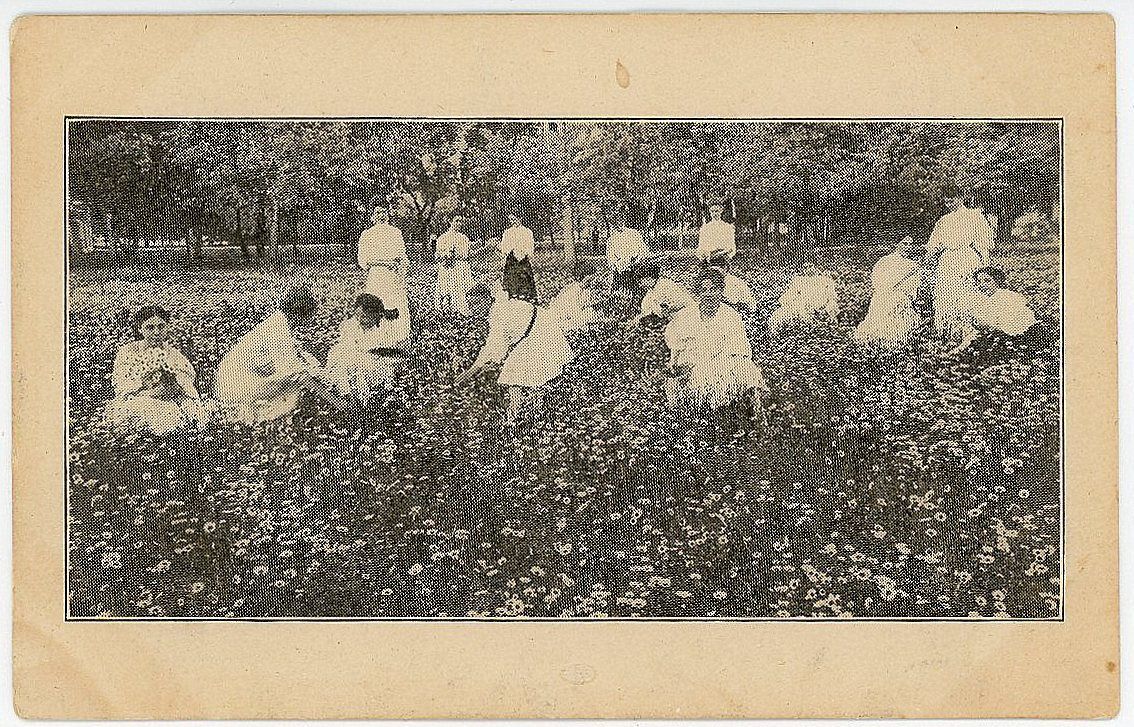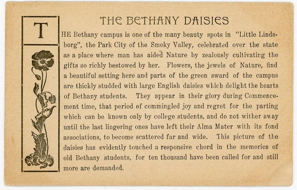 Lindsborg, KS: Bethany College, 1910. A 3 1/2" x 5 1/2" card with an image from a photograph of young women graduates in a field of daisies gathering the ephemeral flowers. The reverse has a stylized, art nouveau influenced daisy at left. The narrative describes the Bethany Campus as one of the beauty spots in "Little Lindsborg" the Park City of the Smoky Valley. It describes the flowers, the jewels of Nature, appearing in their glory during Commencement time, that period of commingled joy and regret for the parting which can be known only by college students, and do no wither away until the last lingering ones have left their Alma Mater..."This picture of the daisies has evidently touched a responsive chord in the memories of old Bethany students, for ten thousand have been called for and still more are demanded." Bethany College was established by Swedish Lutheran immigrants in 1881. A liberal arts college.