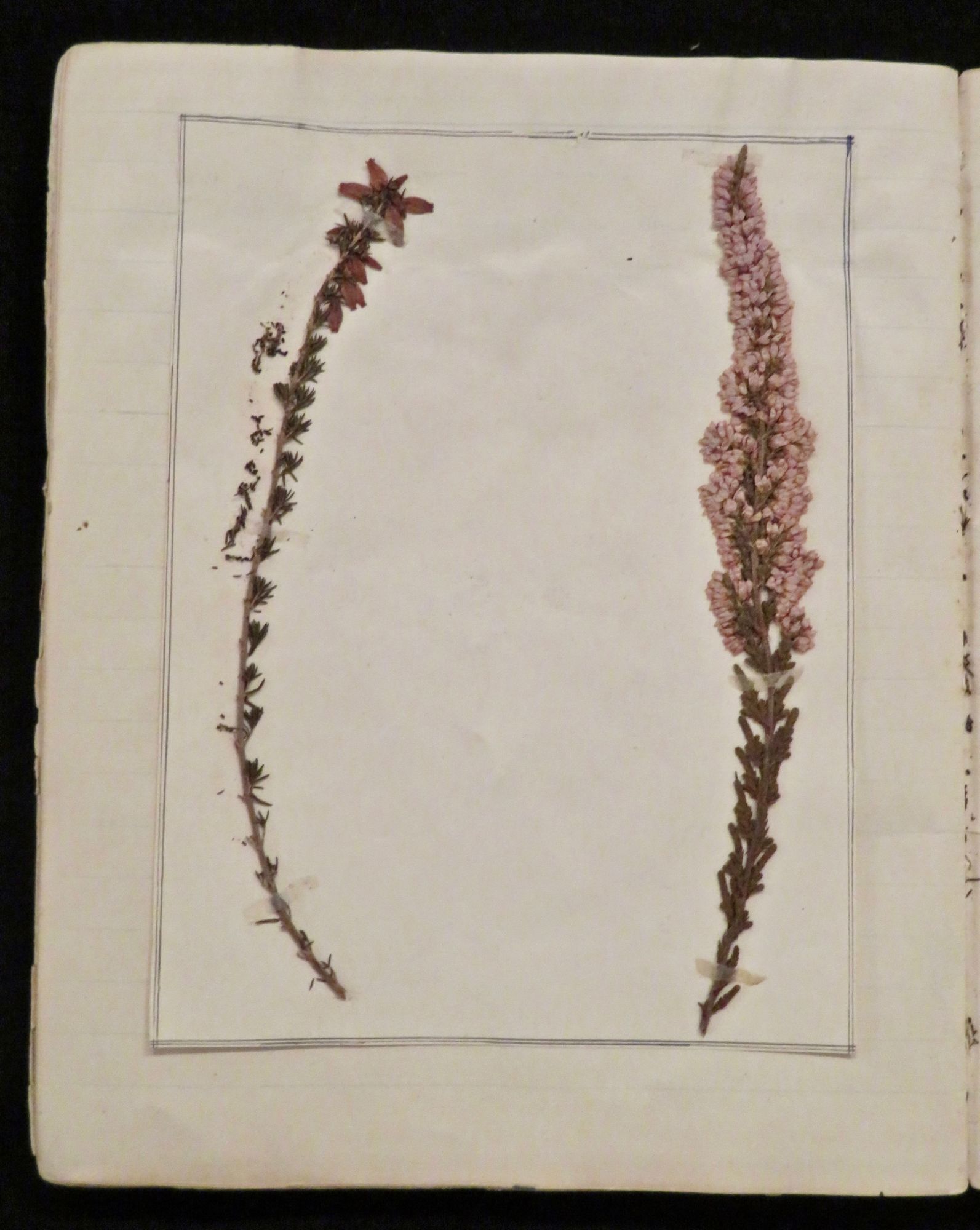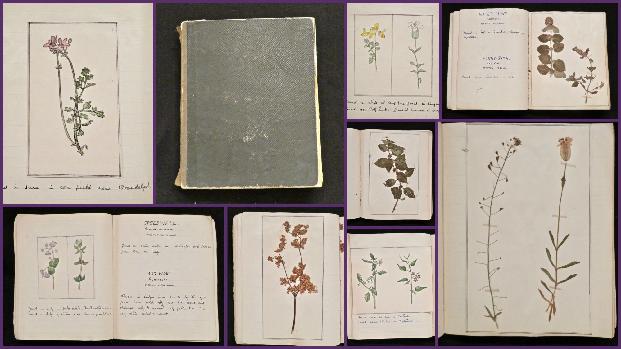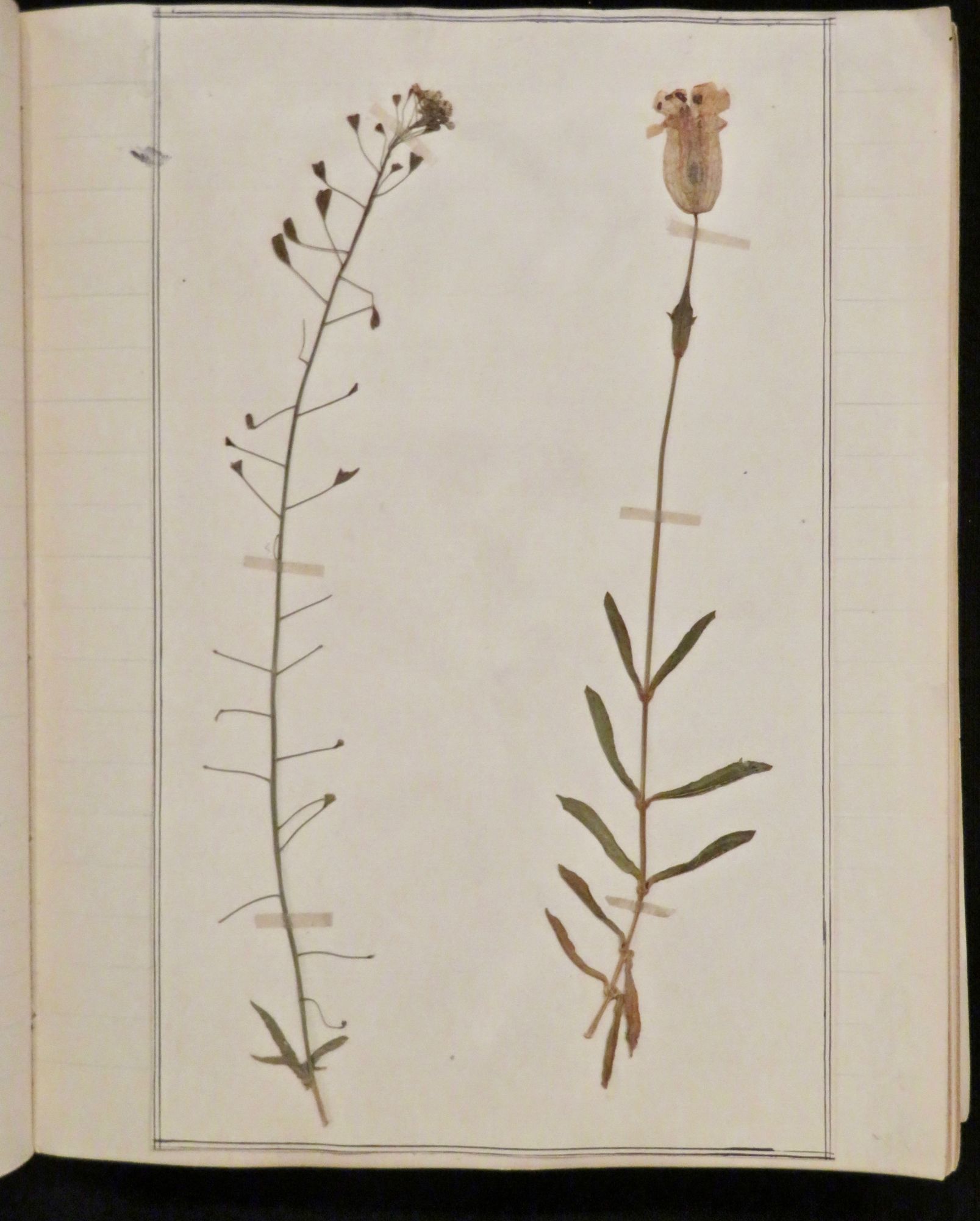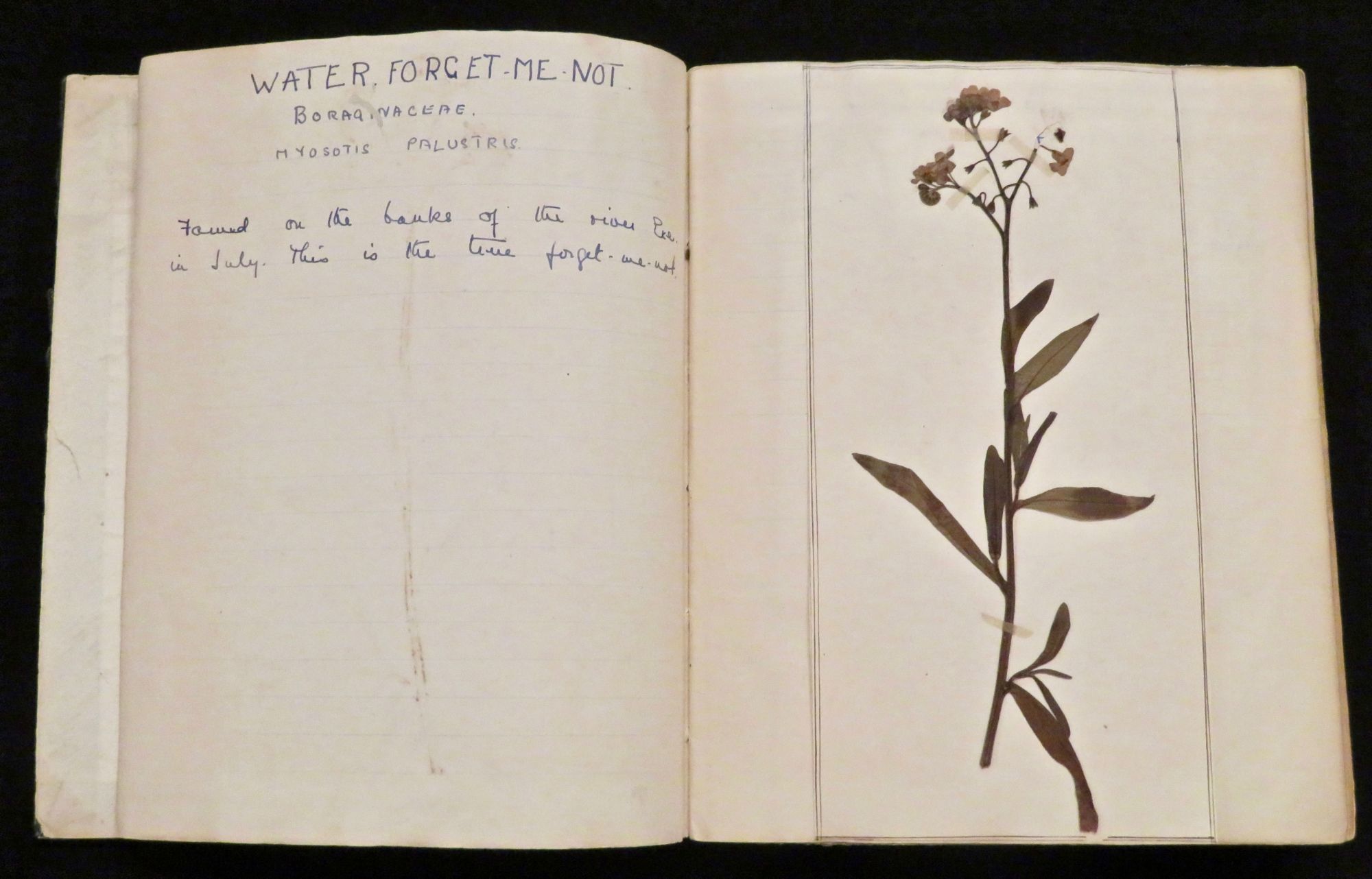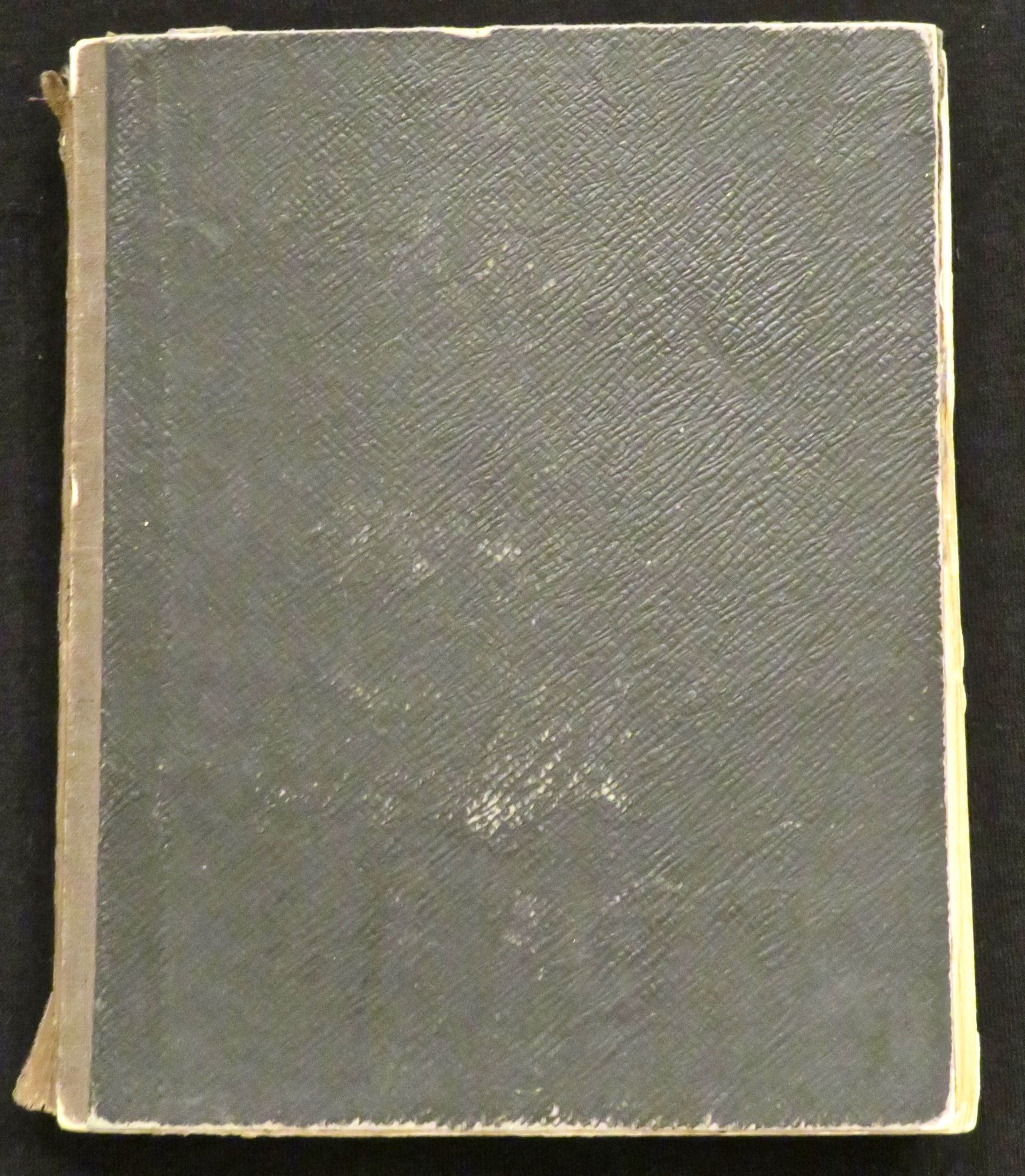 England, 1900. Back Cover lacking. One of the specimens is loose from where it was pasted in. Two specimens are missing from the book. Staining due to the specimens. A charming herbarium journal that can be read in two different directions. If you open the book one way, the reader finds a herbarium with 59 pressed specimens, mainly flowers, taped to the pages. When the reader flips the book and reads it in the opposite direction, instead of specimens, there are watercolors illustrating each entry. There are 43 entries in this section, however only 33 pages of watercolors, because in 10 instances the artist doubled- up on a single page. With each specimen/illustration the author lists the plants common name, scientific name, family genus, a brief description and where and when (month only) the author found the plant. The owner of the journal most likely lived in England, as several of the descriptions of the locations the flowers were found mention the River Exe which is near Devon, England on the Bristol Channel Coast. The water colors were done first on a sketch paper which was then pasted into the journal. Similarly the specimens were pressed and dried and then secured by several small pieces of tape on a separate sheet of paper before being pasted into the journal. Of the 59 specimens, 3 have been inserted loose into the blank pages between the two sides of the journal with no identifying information. Additionally, there is 1 specimen pasted in with no description and 2 descriptions of flowers with no corresponding specimen (the latter of which was not included in the count). Some of the flora illustrated are: Primrose, Speedwell, Lady's Smock, and Hedge Wound Wort. Some of the specimens included are: Water Forget Me Not, Penny Royal, Long Stalked Crane's Bill, and Scarlet Pimpernel.