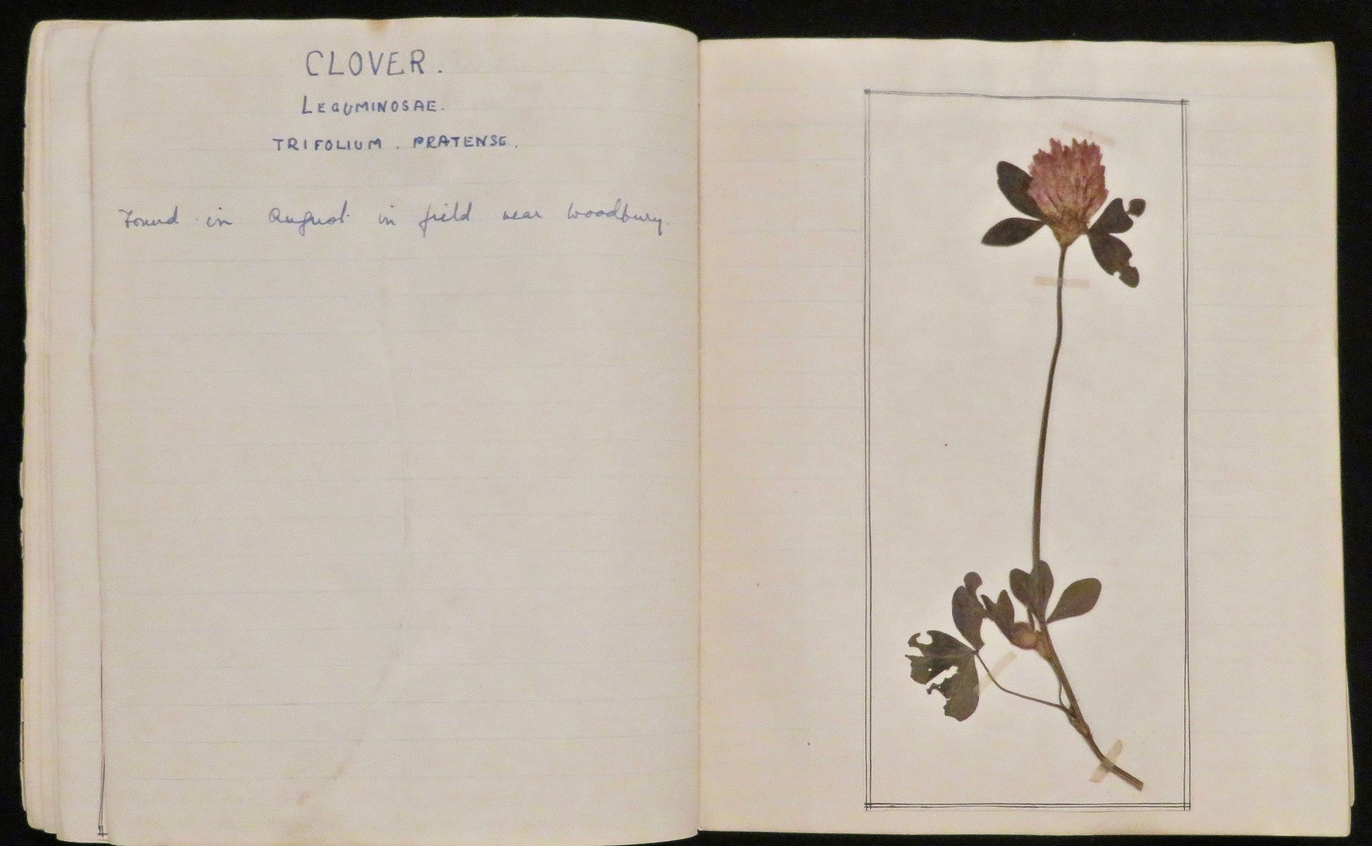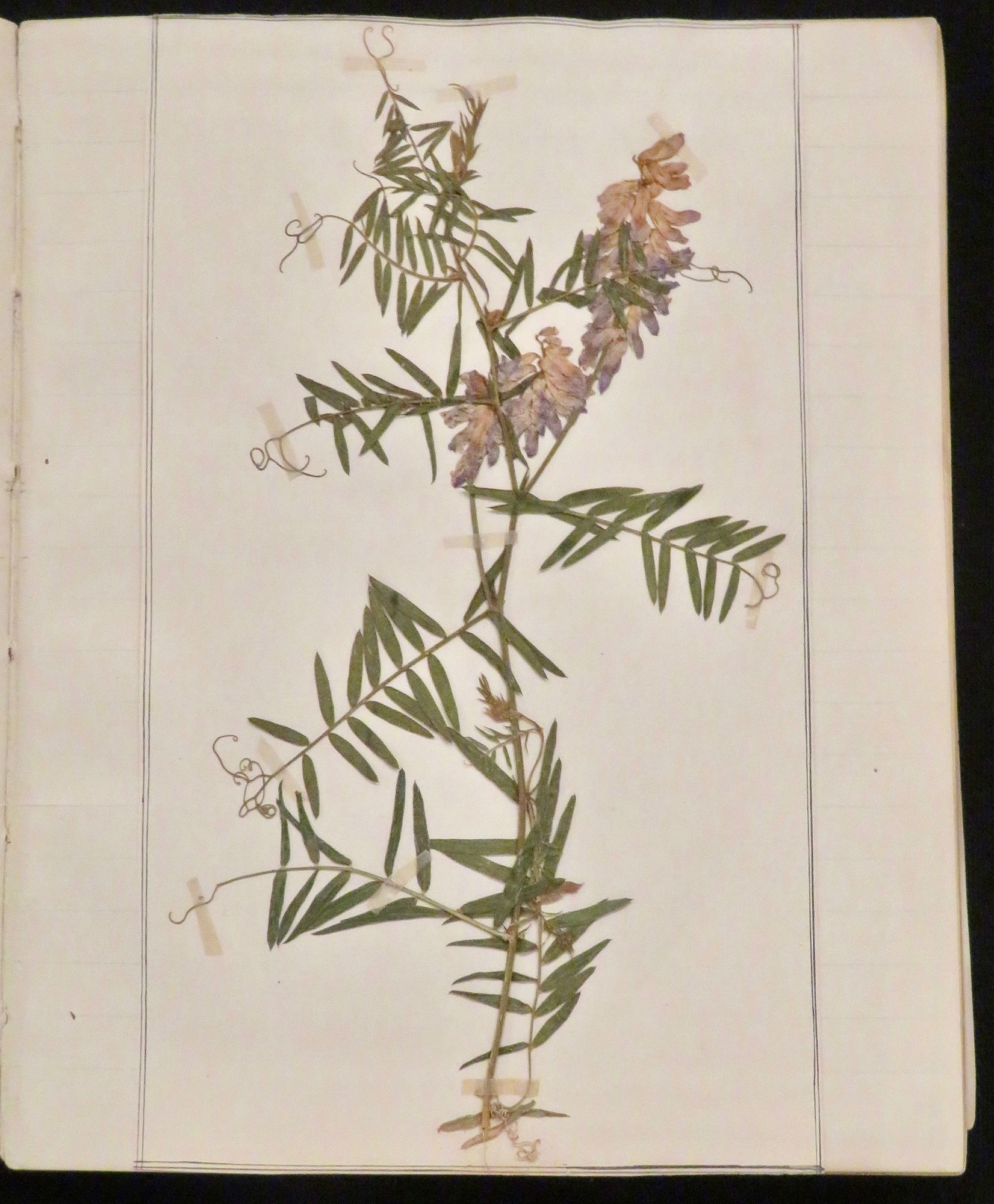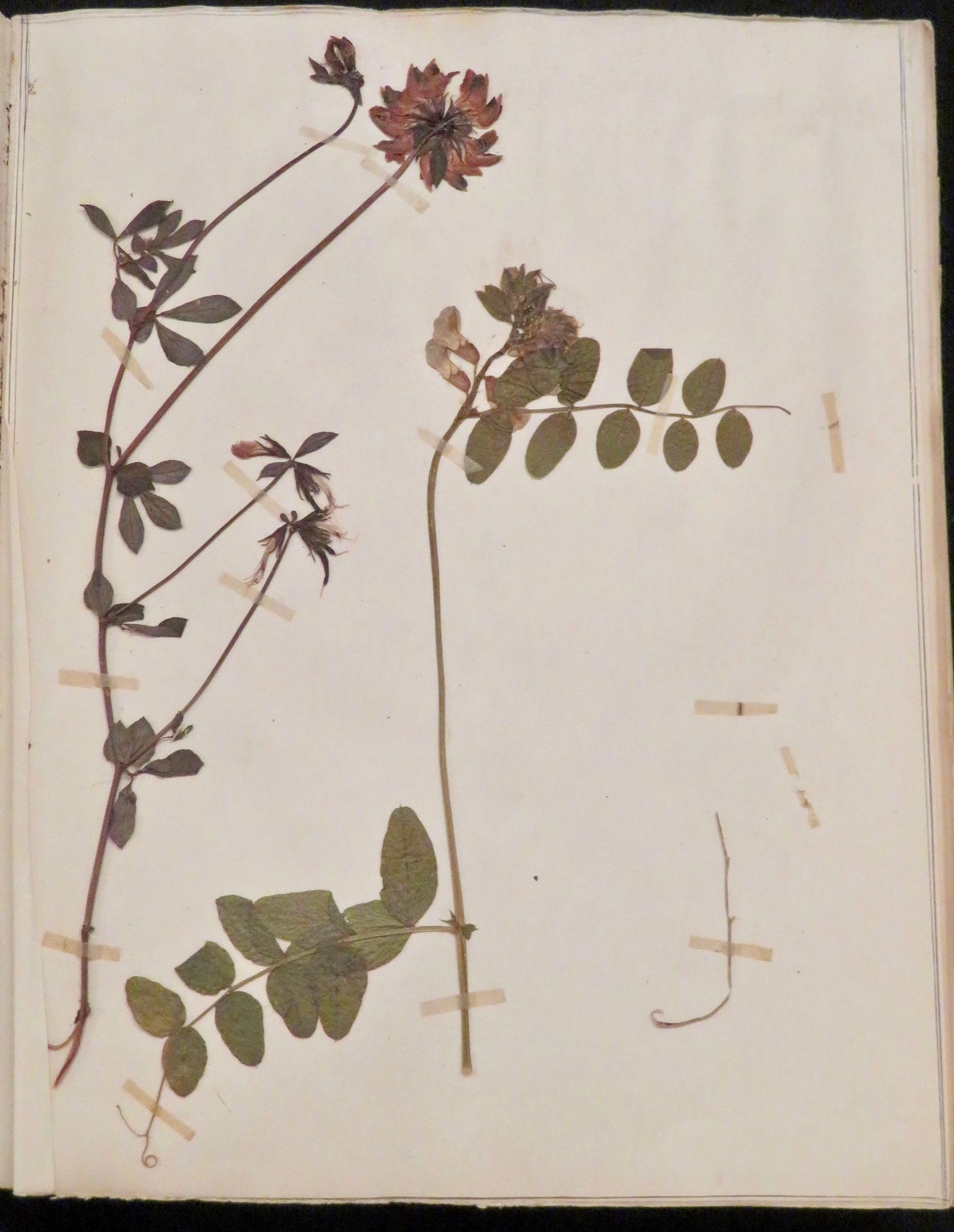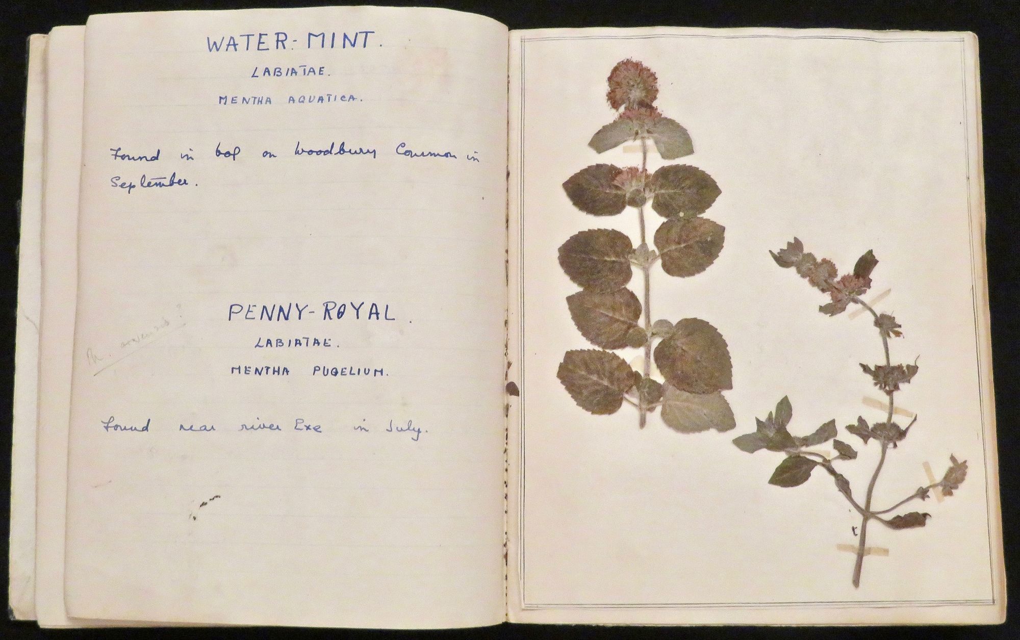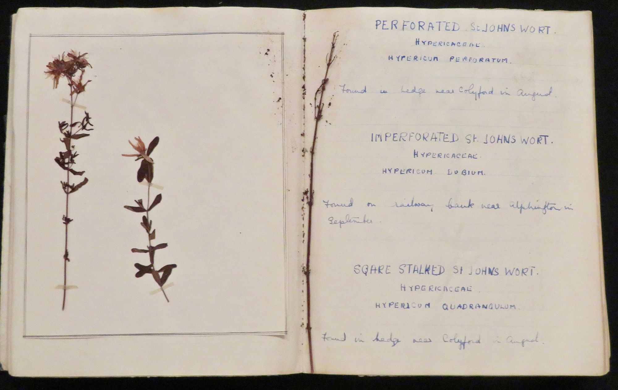 England, 1900. Back Cover lacking. One of the specimens is loose from where it was pasted in. Two specimens are missing from the book. Staining due to the specimens. A charming herbarium journal that can be read in two different directions. If you open the book one way, the reader finds a herbarium with 59 pressed specimens, mainly flowers, taped to the pages. When the reader flips the book and reads it in the opposite direction, instead of specimens, there are watercolors illustrating each entry. There are 43 entries in this section, however only 33 pages of watercolors, because in 10 instances the artist doubled- up on a single page. With each specimen/illustration the author lists the plants common name, scientific name, family genus, a brief description and where and when (month only) the author found the plant. The owner of the journal most likely lived in England, as several of the descriptions of the locations the flowers were found mention the River Exe which is near Devon, England on the Bristol Channel Coast. The water colors were done first on a sketch paper which was then pasted into the journal. Similarly the specimens were pressed and dried and then secured by several small pieces of tape on a separate sheet of paper before being pasted into the journal. Of the 59 specimens, 3 have been inserted loose into the blank pages between the two sides of the journal with no identifying information. Additionally, there is 1 specimen pasted in with no description and 2 descriptions of flowers with no corresponding specimen (the latter of which was not included in the count). Some of the flora illustrated are: Primrose, Speedwell, Lady's Smock, and Hedge Wound Wort. Some of the specimens included are: Water Forget Me Not, Penny Royal, Long Stalked Crane's Bill, and Scarlet Pimpernel.