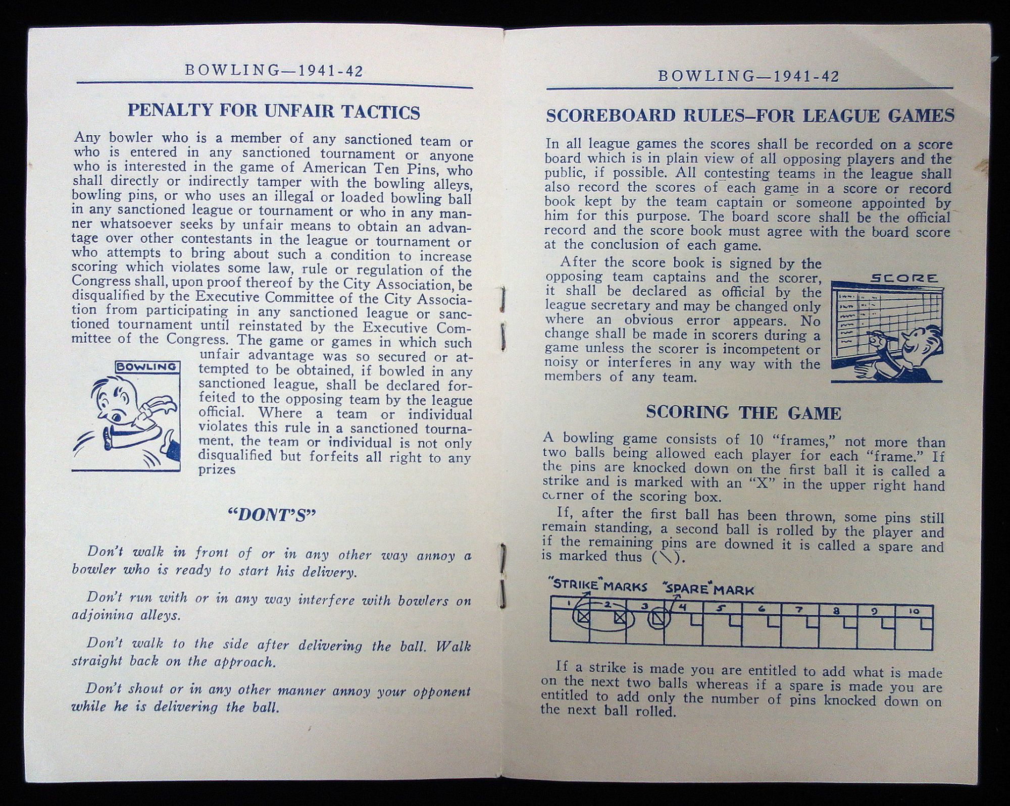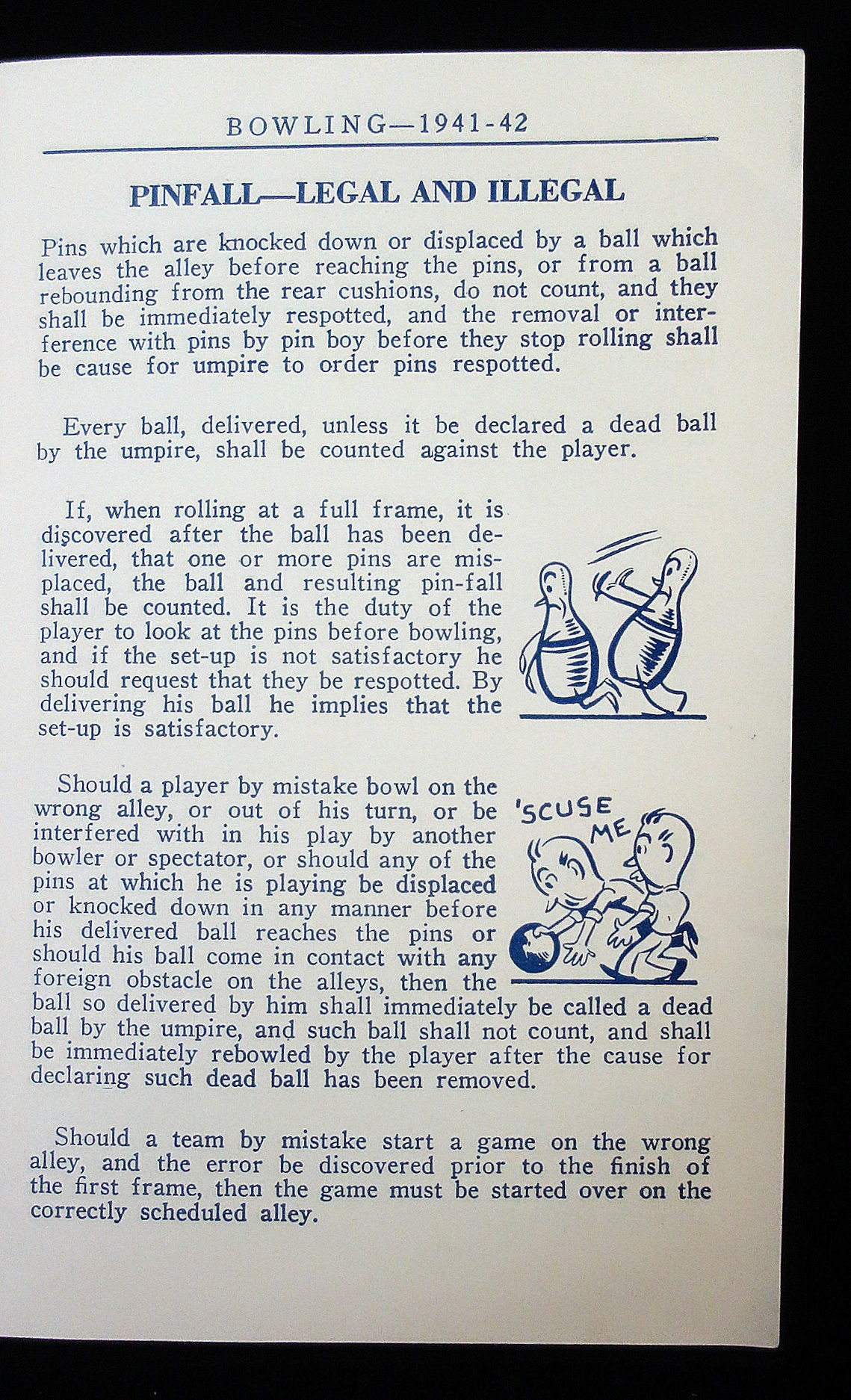 1942. Overall condition is good.. The booklet, as promised, gives an overview to the rules and regulations of bowling for the 1941-42 season. 13 pp. wrappers with stapled binding. Some of the topics discussed are "Pinfall - Legal and Illegal" "Scoring the Game" Foul - Definition Of" and other general rules, as well as some advice for the newer bowler. Each topic has a description which varies in length, along with some small, generally humorous illustrations. There is also a section on the greatest bowling match in history, which is Jimmy Blouin vs Jimmy Smith. The back cover advertises "the famous 'Jimmy Blouin' bowling shoe" with an illustration and guide to the various features of the shoe that make it so great. Measures 6" x 3 1/2" Published by Permission of American Bowling Congress.