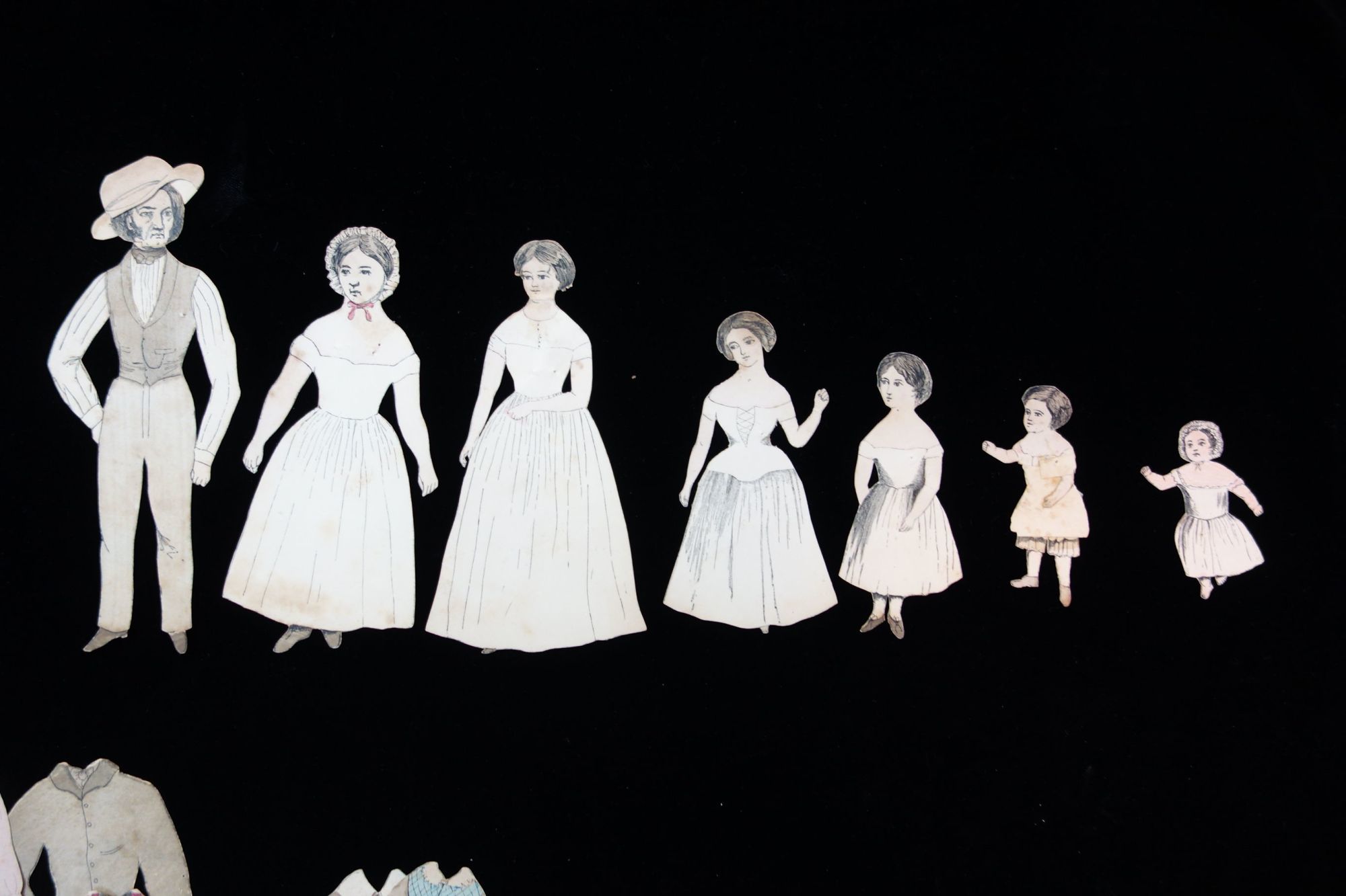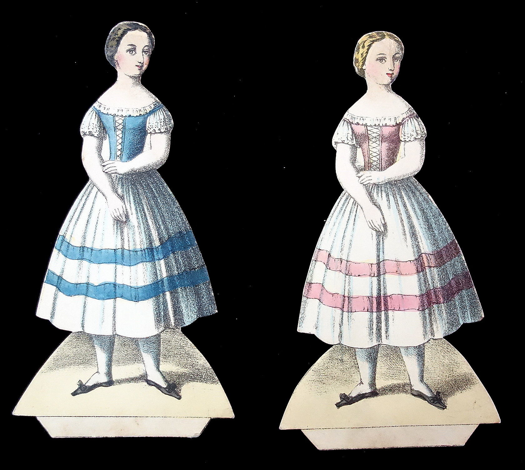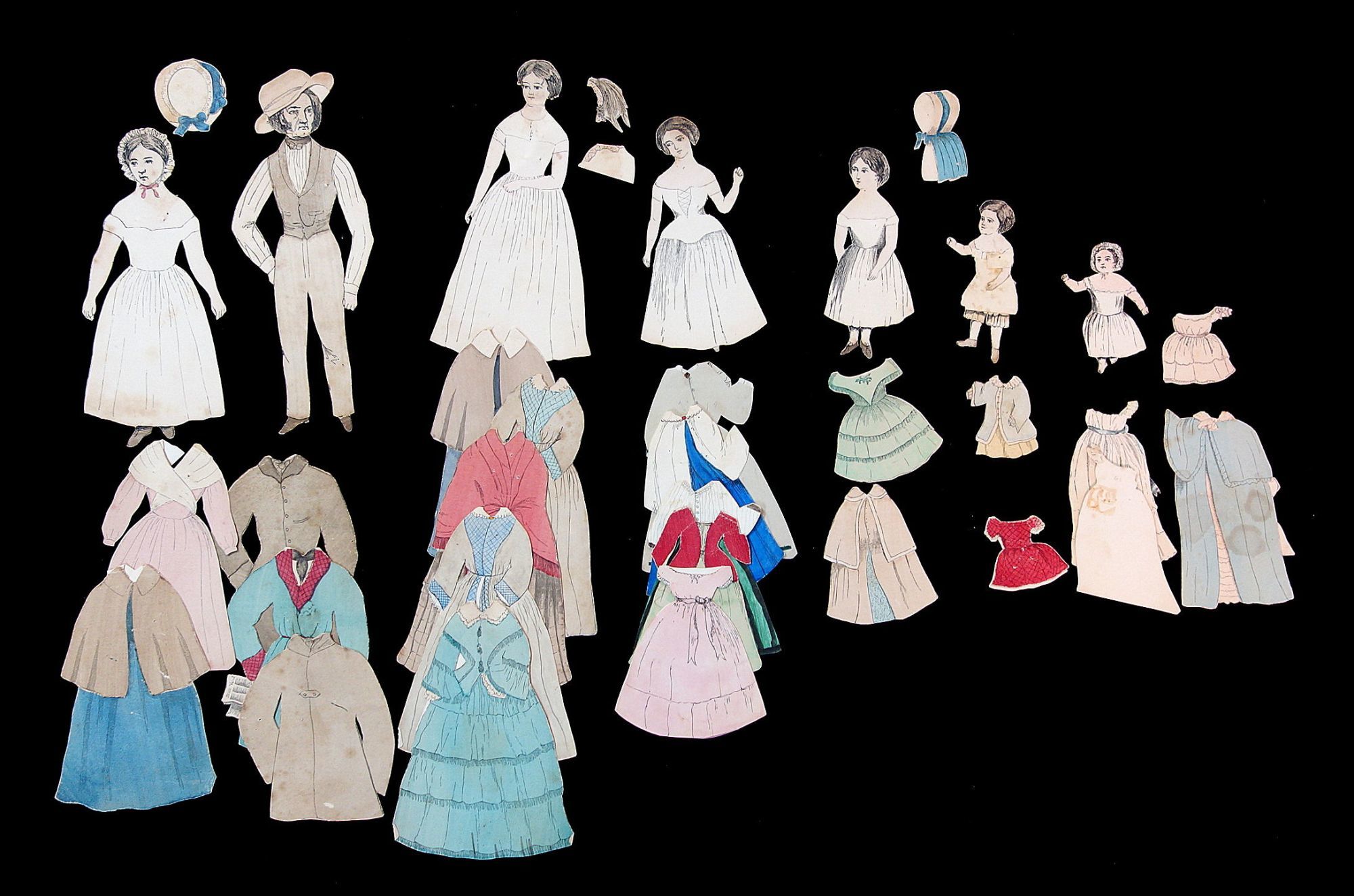 New York: Anson D.F. Randolph, 1857. Overall condition is fine. Some costumes have creases, as well as show some wear.. The family is all together with the seven members: Father, Mother, Miss Adelaide, Clara, George, Baby, and Bridget the Nurse. Each doll has multiple hand- colored costumes that match with their age and character. Most with three costumes, two with two costumes, Miss Adelaide has two extra hand made dresses. Few hats. Sizes of the doll vary, the father is largest at 6 1/2