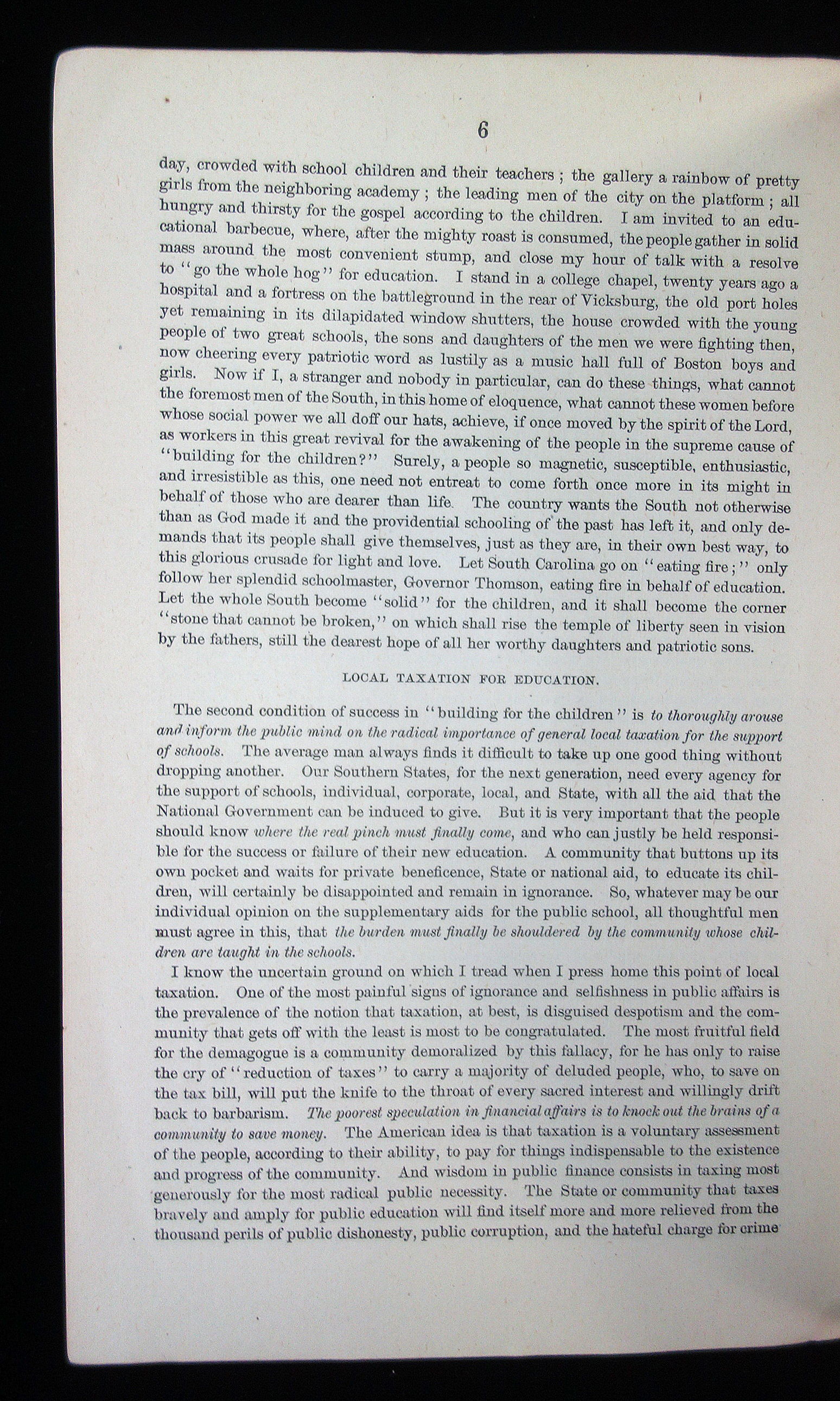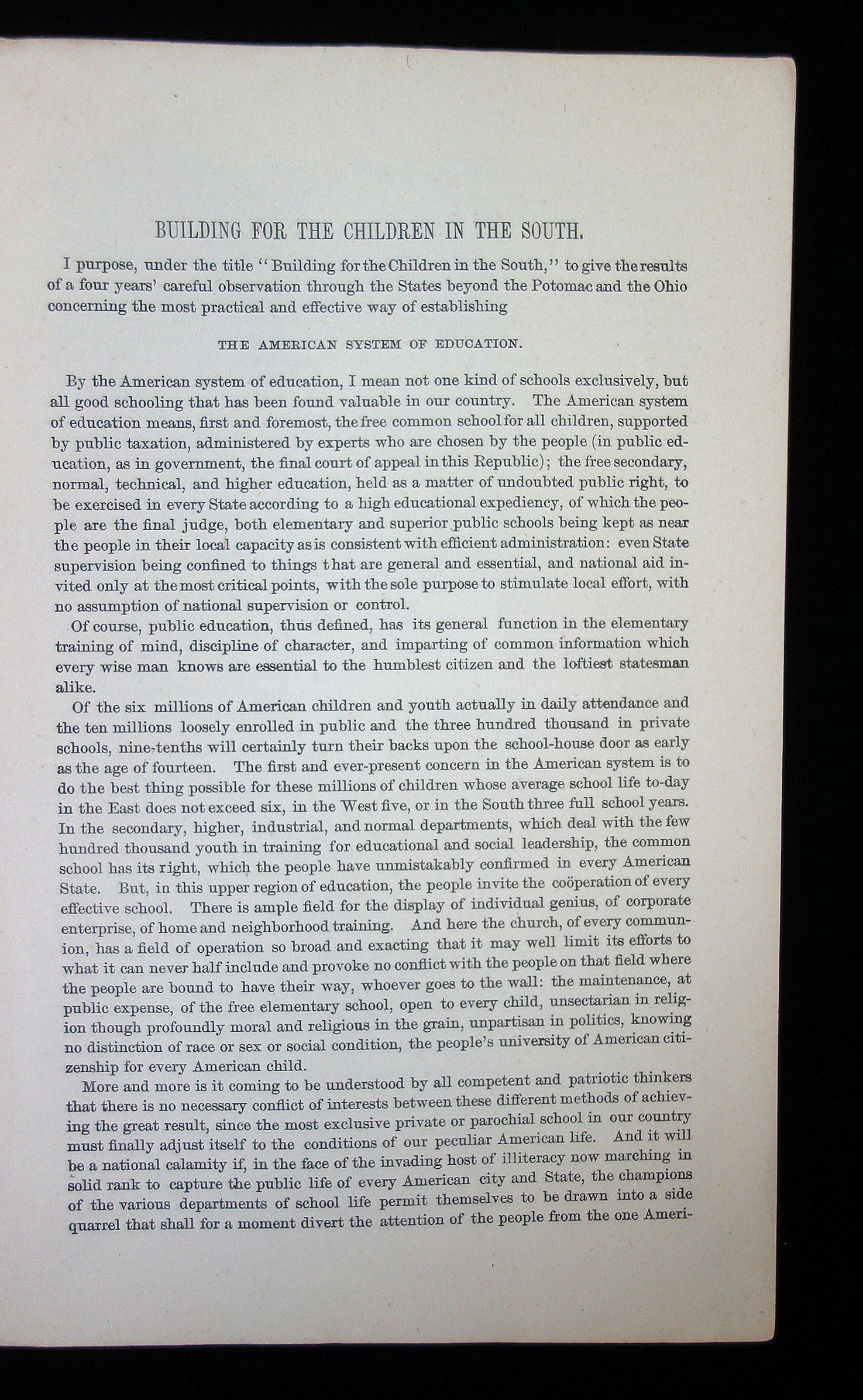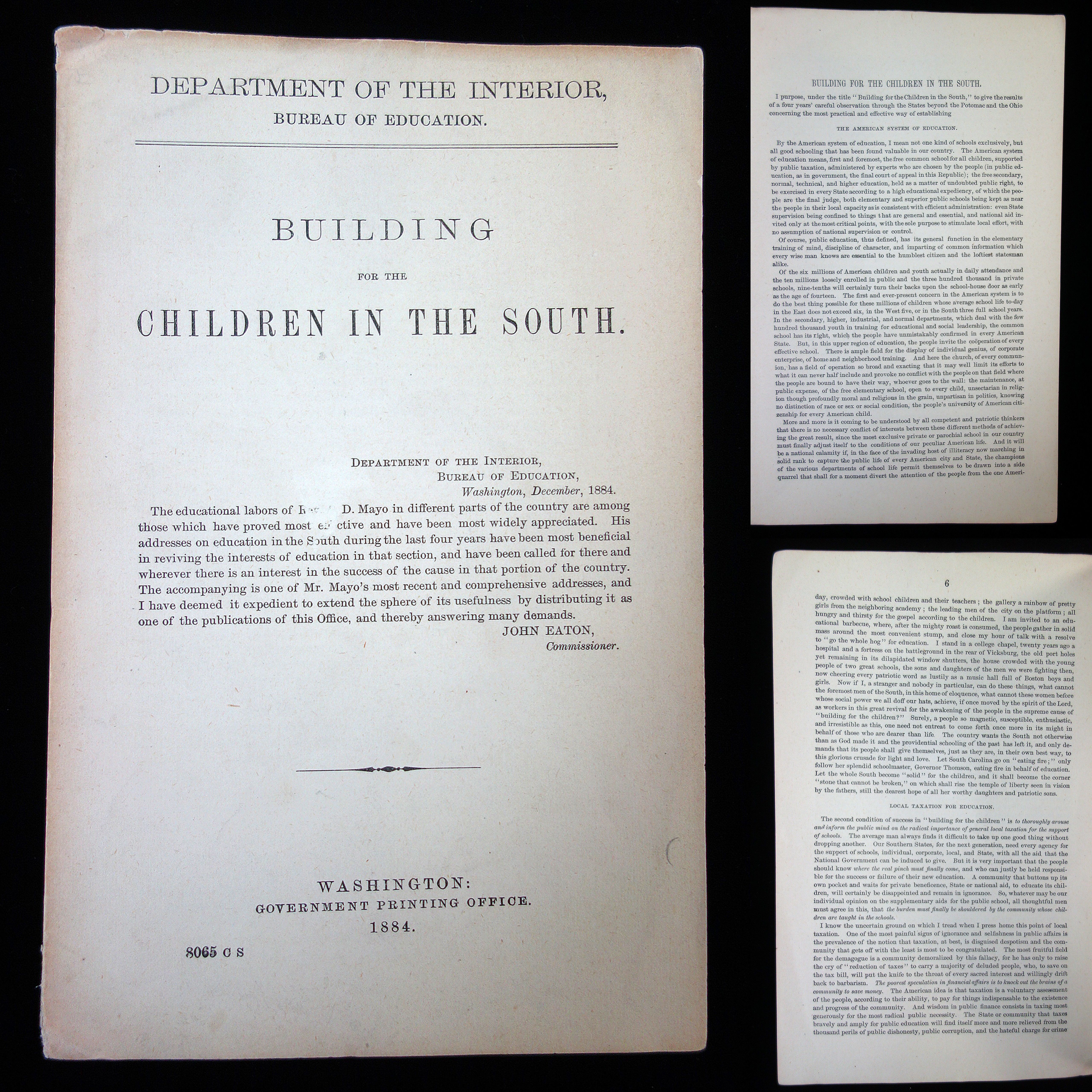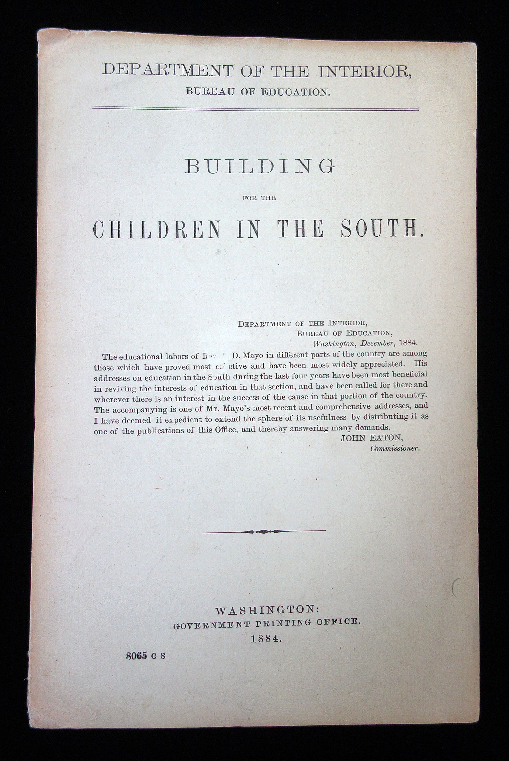 Washington D.C.: Bureau of Education, 1884. 16 pages, paper wrappings. Mayo's main topic in this booklet is about providing the structural needs and means for establishing quality education for all. He believes that taxation should be used in order to truly support public schools, and that it is a priority. Teachers also should be of good quality and educated in the profession in order to make schooling effective. In this address he makes it very clear that he truly believes that a good, solid education for everyone could improve not only the children's future, but the future of the country as a whole. As soon as the south started to implement his teachings that they would find their region becomes better for it. It is broken up into several subjects, such as "The Awakening of the People", "Local Taxation for Education" "National Aid for Education" and "The Free Library". Addressing aspects of his vision of a better American education system, Mayo believes he found the solution for the south. Although in segregated schools the need for higher education for African American children was emphasized as well. Measures 9" x 5 3/4". The Department of the Interior for the Bureau of Education felt that the information that Rev A.D. Mayo was both gathering and discussing, especially with his concentration of education in south, this publication would be a beneficial read and a useful resource.