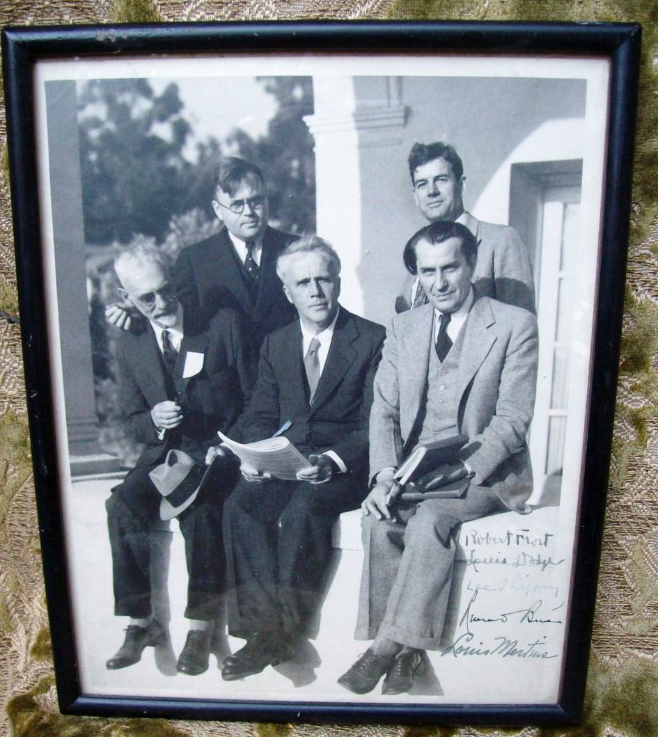 n.d.. Framed Photograph. Appears to be Fine, not examined out of frame. Vintage 8" x 10" photograph of Frost seated outdoors with four other writers SIGNED by all five in the lower right margin. The other writers include Louis Dodge, Lee Shippey, Frost friend and bibliographer Louis Mertins, and one name we are unable to decipher but we have been told is Occidental College president Remsen D. Bird. While not dated, the photograph had to be taken and signed before June 1952 which is when Dodge died.