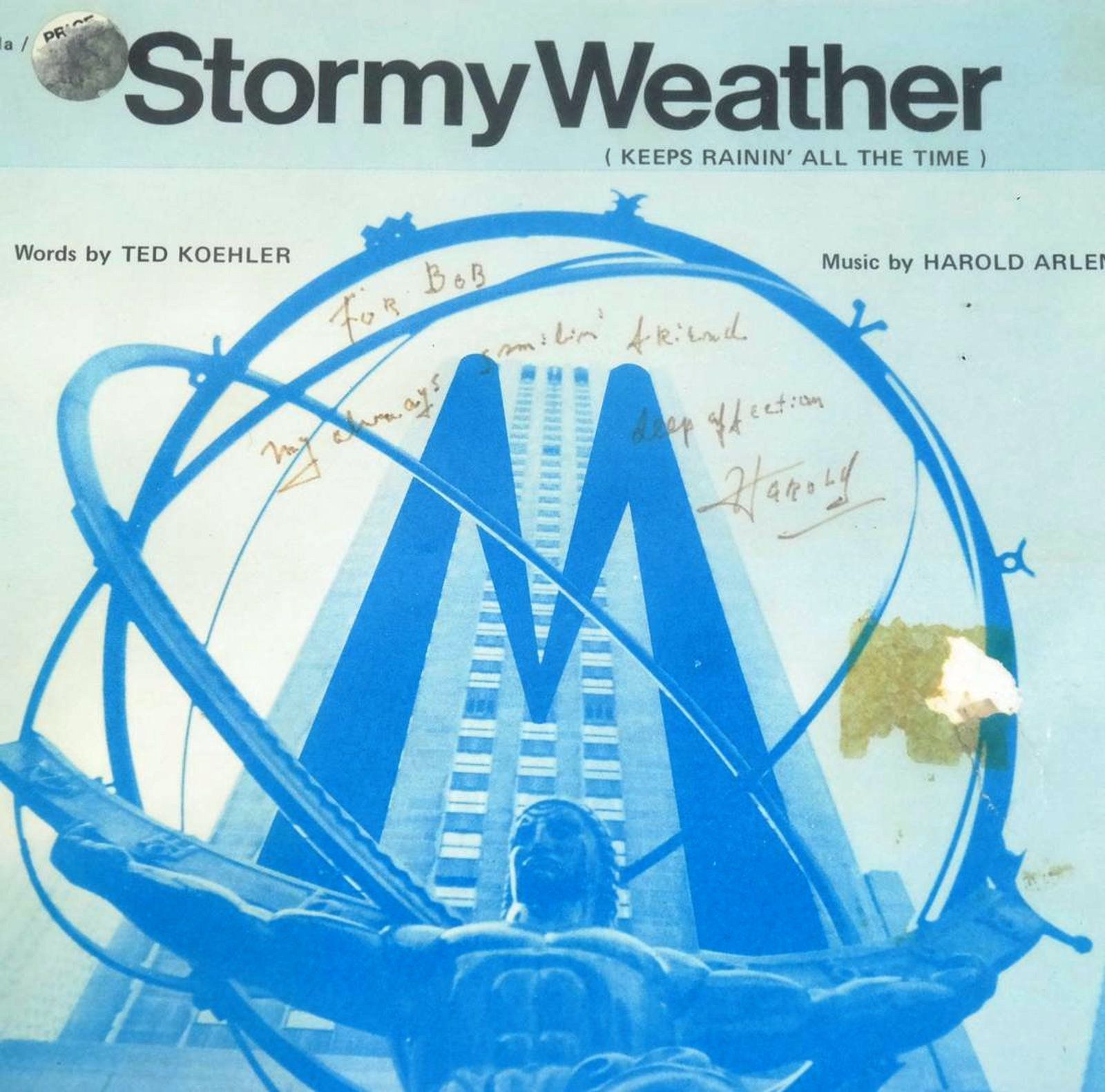 (New York): Edwin H. Morris & Company, Inc., (1961) but likely later. wraps. Skim mark and small tear on front cover not affecting the inscription. Small tape marks on front cover and a horizontal strip of loss of music on the rear cover. Still Very Good and attractive. Quarto (8-1/2" x 11") in illustrated wraps; 4 pages. Vintage sheet music with words by Ted Koehler and music by Harold Arlen. INSCRIBED and SIGNED by the Arlen on the front cover: "For Bob/My always smilin' friend/deep affection/Harold." In addition to this classic, which was featured in a film with the same name, Arlen and Koehler combined to write "Let's Fall in Love" and "Get Happy." Arlen is perhaps best known as the composer of the music for THE WIZARD OF OZ film, including the song "Over the Rainbow," voted the 20th century's No. 1 song by the Recording Industry Association of America (RIAA) and the National Endowment for the Arts (NEA).