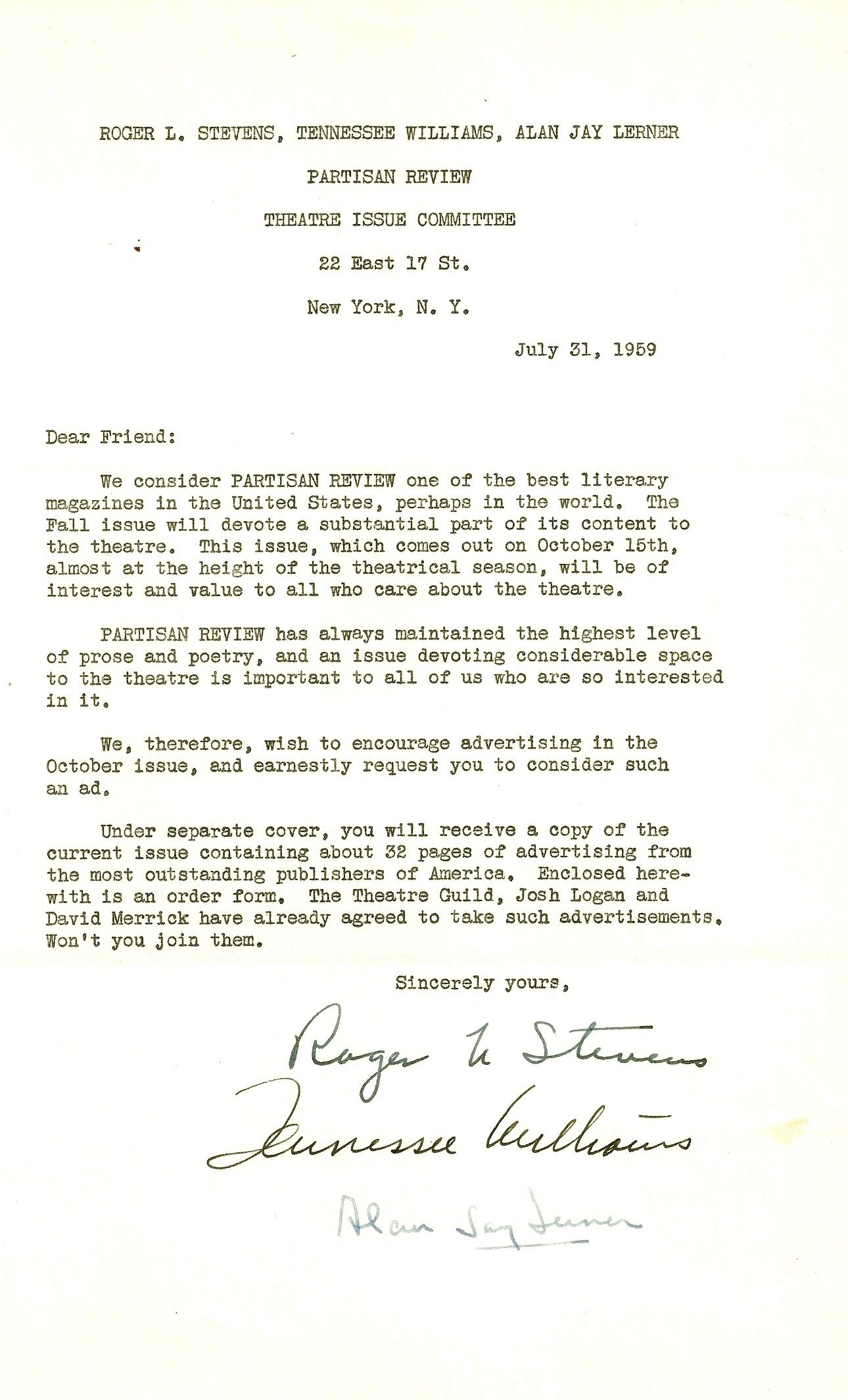 New York, 31 July 1959. Letter. Small staple holes in the upper right corner, faint folds from mailing, otherwise Fine with wonderful signatures. A one-page letter from the Theatre Issue Committee of the PARTISAN REVIEW to a potential advertiser for an issue mostly devoted to the theater SIGNED by Williams, Lerner, and Stevens. Williams won the Pulitzer Prize twice, first for A STREETCAR NAMED DESIRE and in 1955 for CAT ON A HOT TIN ROOF. Lerner won 3 Tony Awards and 3 Academy Awards. He wrote the lyrics to the songs in MY FAIR LADY, PAINT YOUR WAGON, CAMELOT, and many others. Stevens produced more than 100 plays and musicals including WEST SIDE STORY and CAT ON A HOT TIN ROOF.
