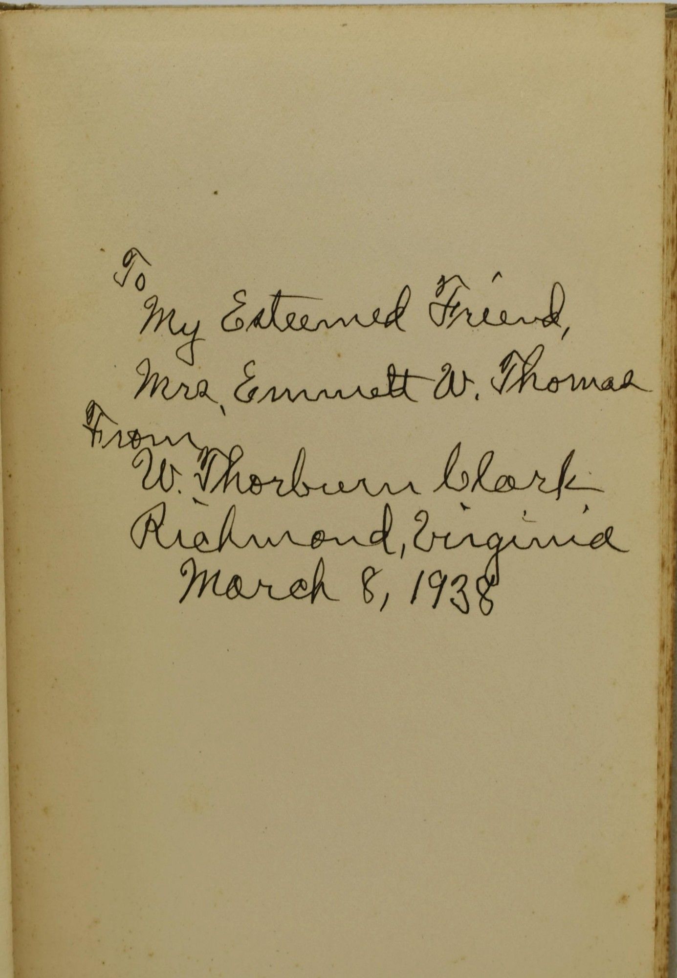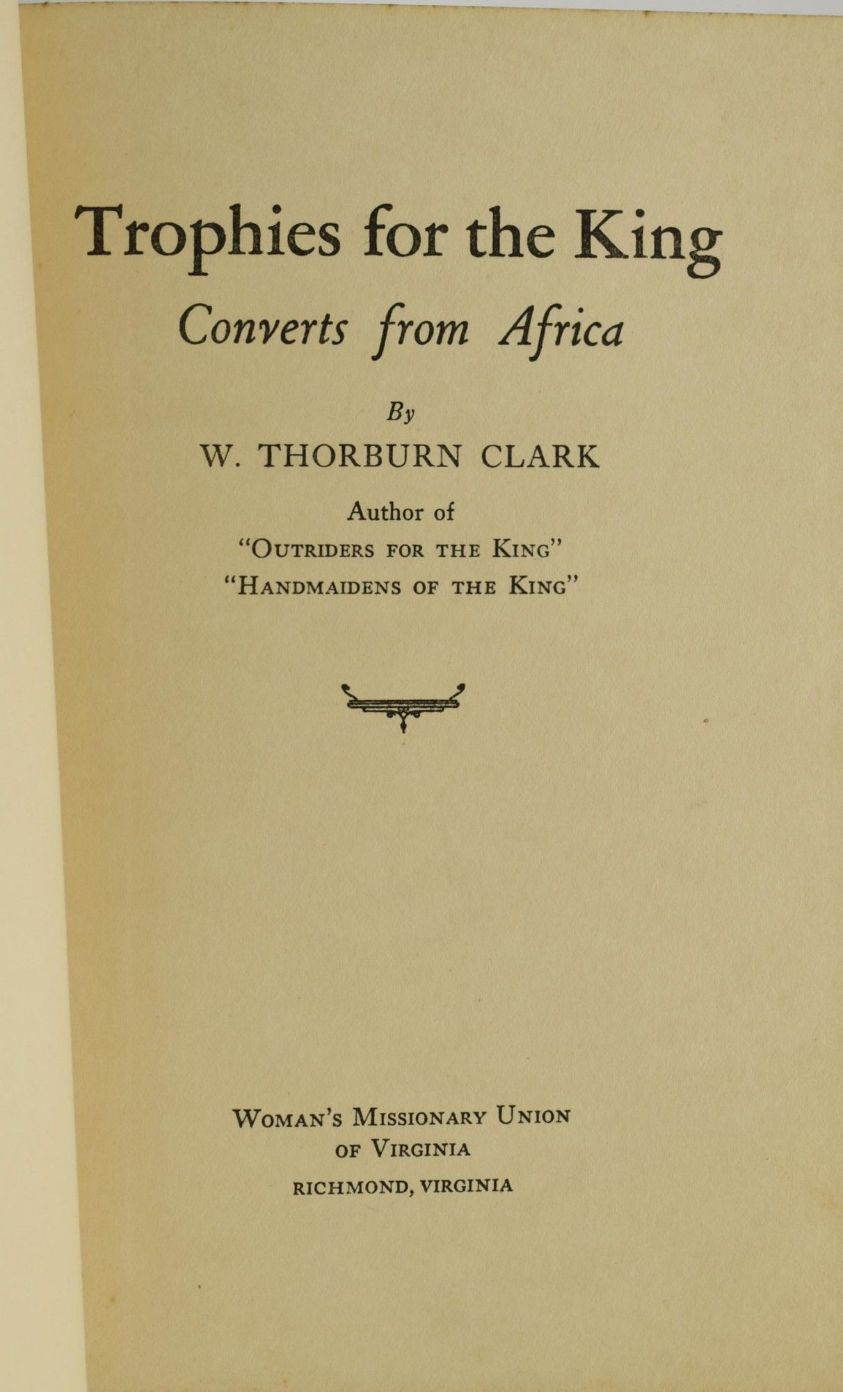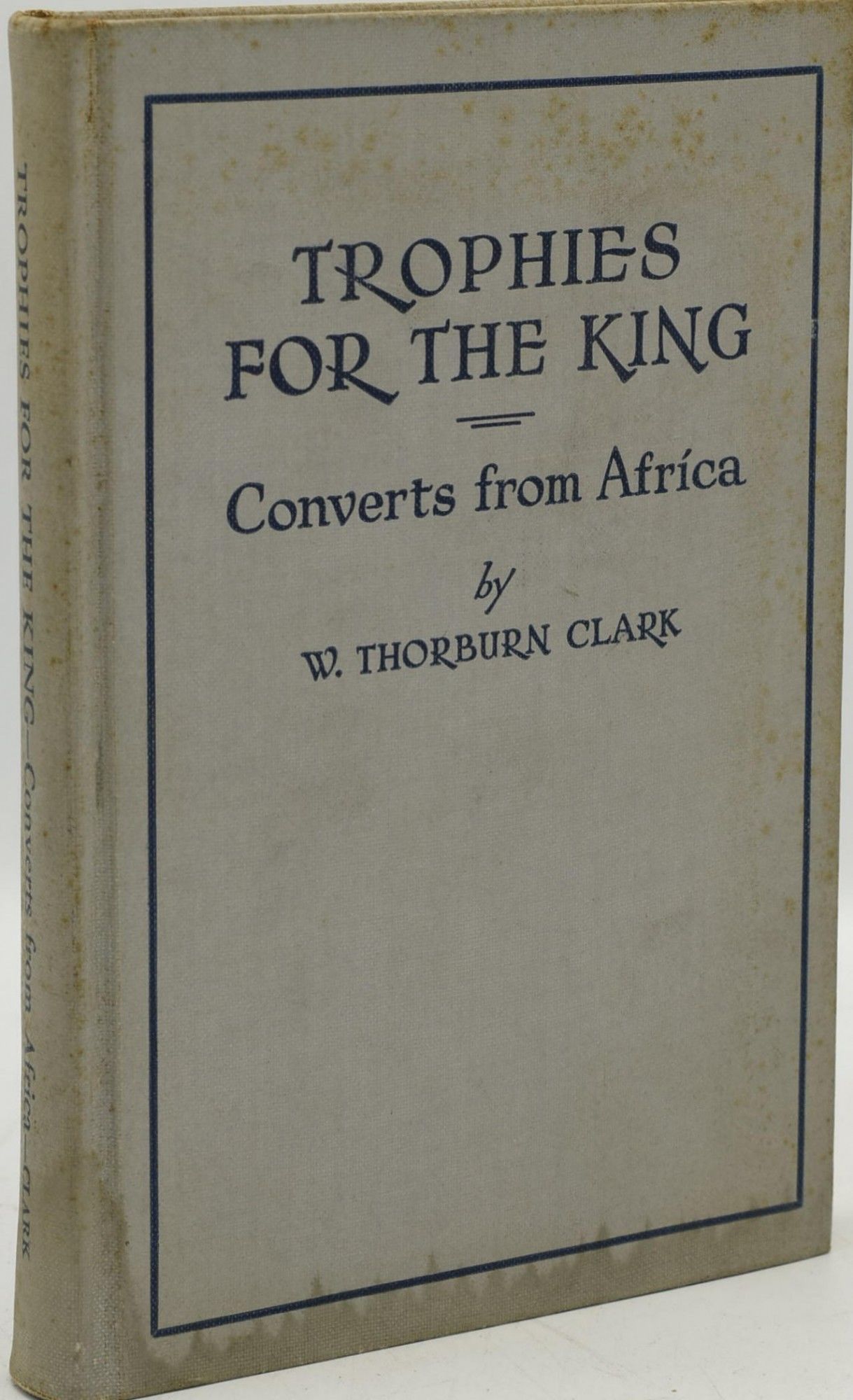 Richmond, Virginia: Woman's Missionary Union of Virginia, 1936. Hard Cover. Good binding. Signed. W. Thorburn Clark's Trophies for the King; Converts from Africa. Signed by the author with a personal inscription on the front endpaper. Foxing to the edges of the textblock and the binding. Gray cloth with dark blue lettering and rules. Good. Good binding.