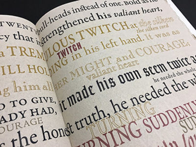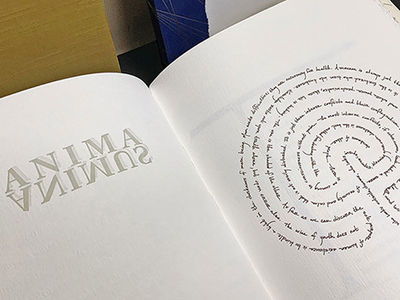 Released May 2018, A Golden Thread is a new tour de force edition from Intima Press. This livre d’artiste focuses on the classic Greek tragedy of Theseus, the brave son of King Aegeus, who ventures into Daedalus’ labyrinth with his sword at the ready, and a silken thread in hand held by the heroine, Ariadne, who awaits at the entrance to the maze. Composed of 100 original drawings, each page is meticulously designed and letterpress printed in multiple press runs with an elegant color palette. With inspiration from historic illuminated manuscripts, the pages in the first and third sections are adorned with hand drawn initial caps, ornate borders, and lively calligrams. A selection of the exquisite illustrations are hand painted with watercolor and gouache. Elegantly typeset in Adobe Garamond with additional type faces, the text comes alive, as it gradually becomes larger and more animated with each page, as Theseus bravely winds his way through the dreaded labyrinth to confront the bull-headed monster. The dynamic typographic designs of the middle section of the book become more frenzied and chaotic as the narrative describes the fight between the beast and the hero.