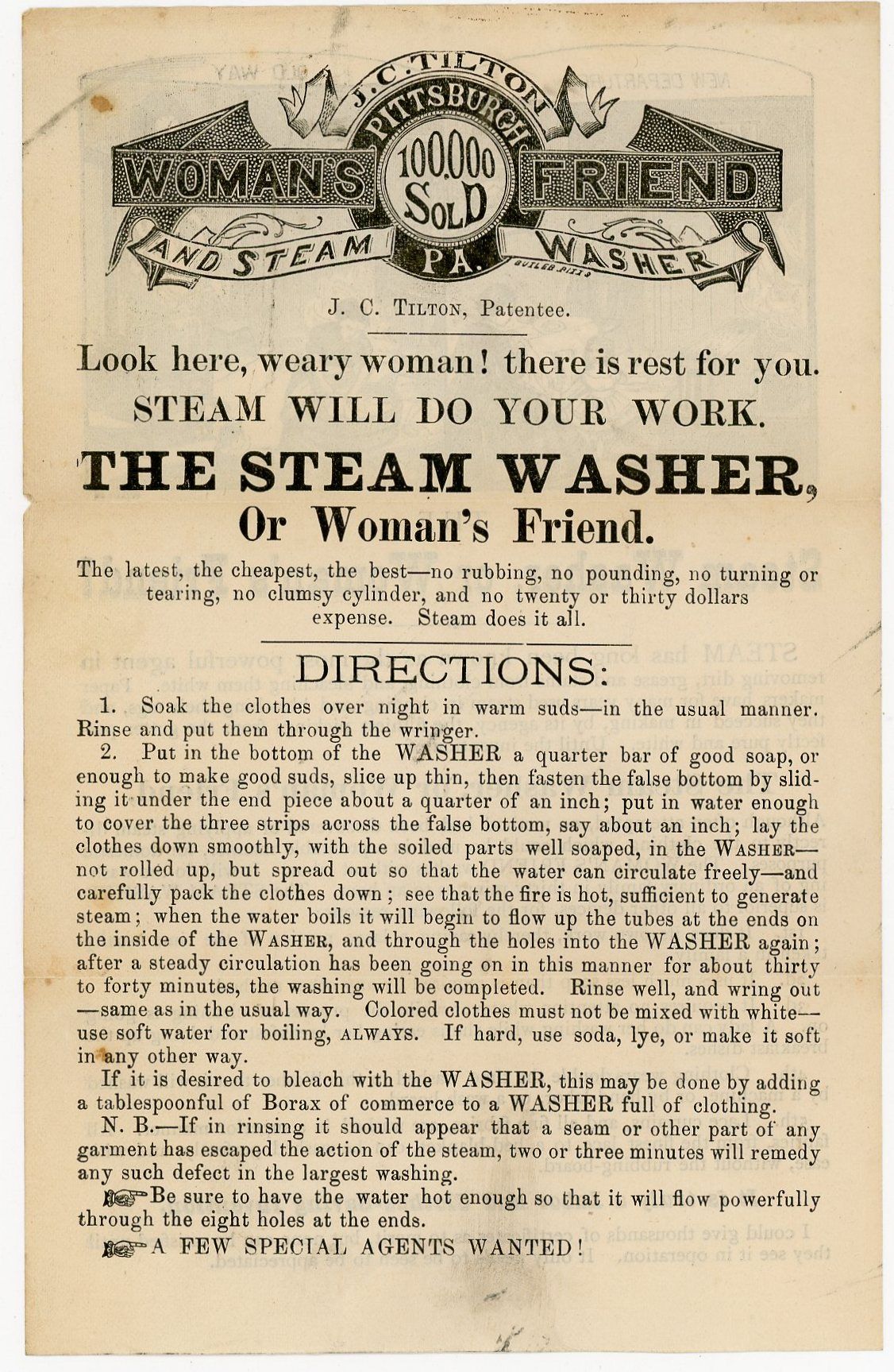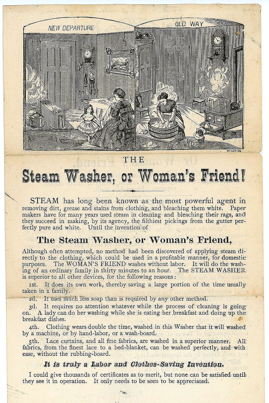 1880. An 8 1/2" x 5 1/2" illustrated two-sided flyer promoting the Women's Friend Steam Washer. "The latest, the cheapest, the best--no rubbing, no pounding, no turning or tearing, no clumsy cylinder, and no twenty or thirty dollars expense. Steam does it all. This is followed by instruction on use- essentially soaking the clothes overnight followed by an elaborate series of washes, rinses and steam. The reverse depicts before and after illustrations of the miserable life before and the life of leisure after acquiring a steam washer. This is followed by five reasons why the steam washer is a woman's friend including that lace curtains, and all fine fabrics, are washed in a superior manner...."It is truly a Labor and Clothes-Saving Invention.