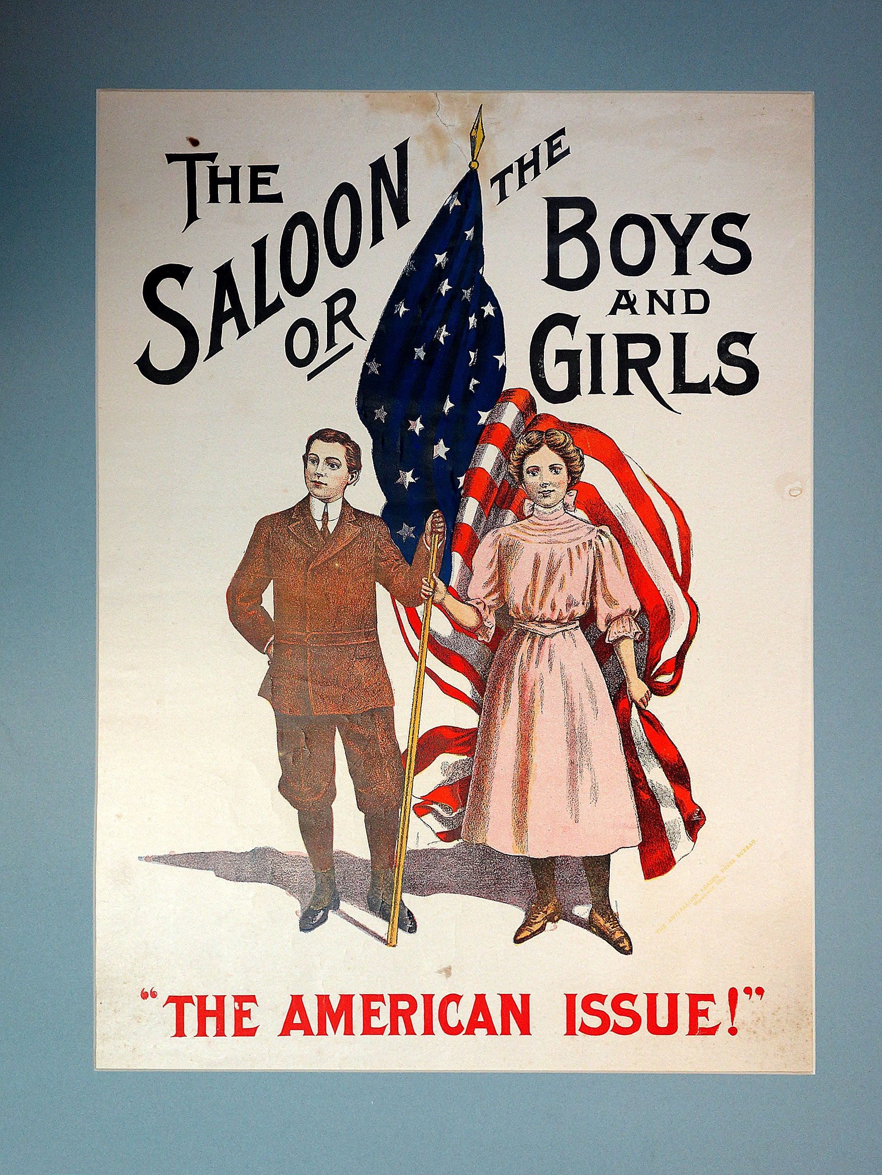 Westerville OH: American Issue Publishing Co., c1913. 3 1/2" intact tear upper center margin with repair. Light discoloration surrounding repair. Overall strong color light toning at base.. Chromolithograph poster of two young people holding an American flag, with following caption:The Saloon or the Boys and Girls "The American Issue". Measures 17 3/4" x 25" poster size. A poster produced by The American Issue Publishing Co., Westerville OH. The poster was available for purchase through the company.