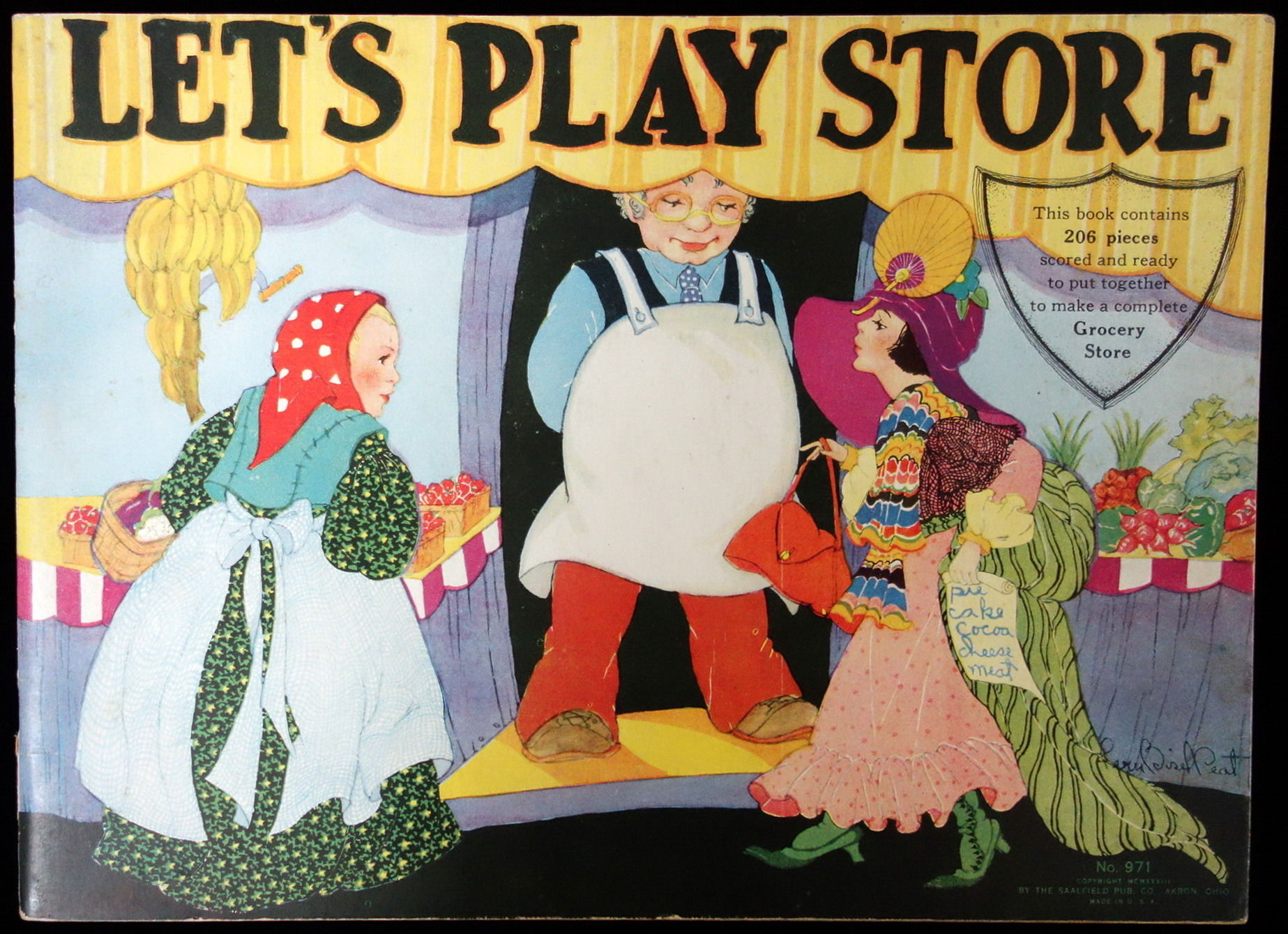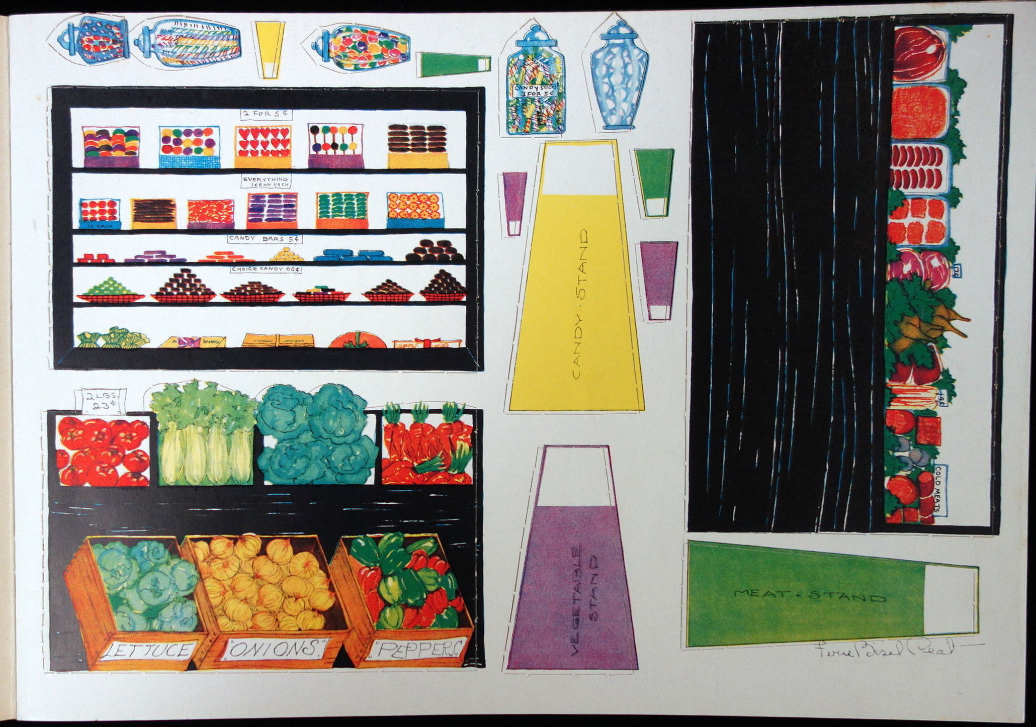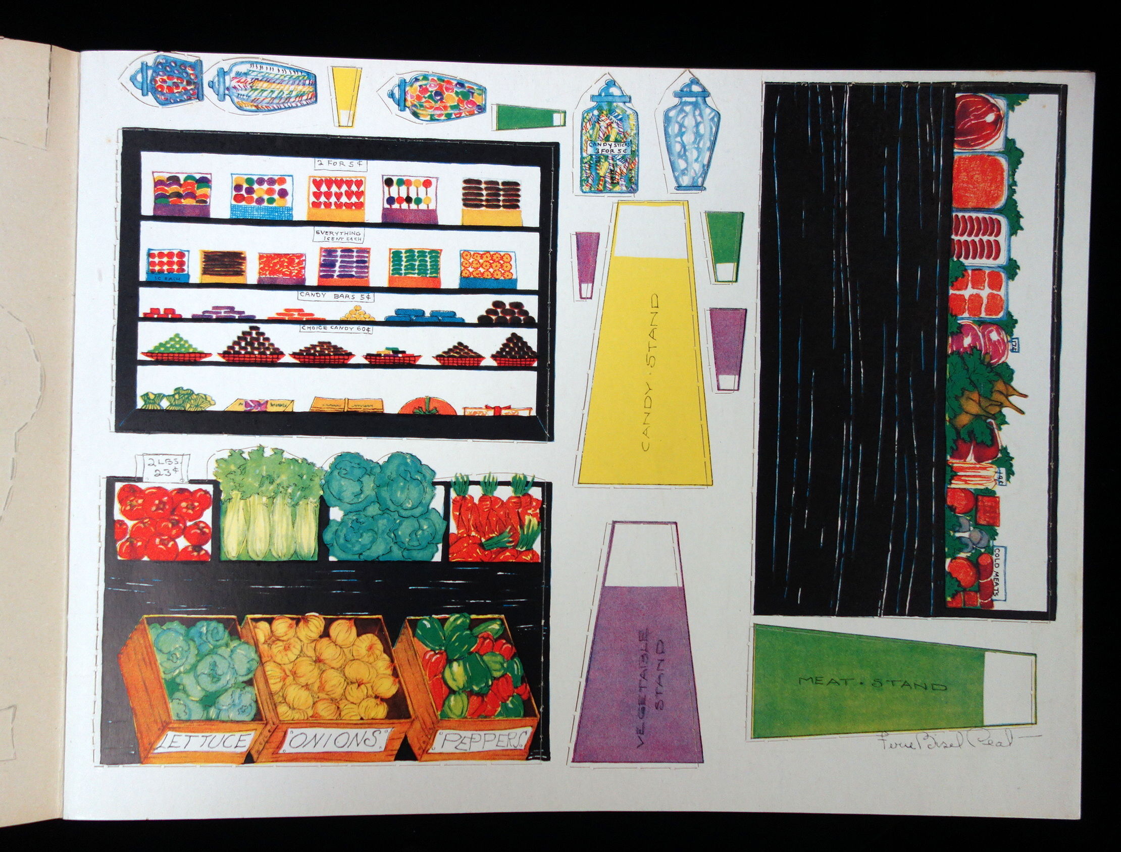 Akron, Ohio: Saalfield Pub. Co, 1933. Very light edge wear, otherwise in very good condition.. Grocery store themed punch out activity book. 7 pages of grocery store pieces and 206 total pieces that, when assembled, create a complete grocery store including produce, shelves, money, customers, and more. Each character and food stand has a corresponding easel back stand. Characters include the Store Keeper, a child with a hat, a boy, and a woman. A myriad of tiny display pieces help develop fine motor skills including a tiny box, a jar and a bundle of facsimiles to be placed on shelves. Measures 10" by 13.5