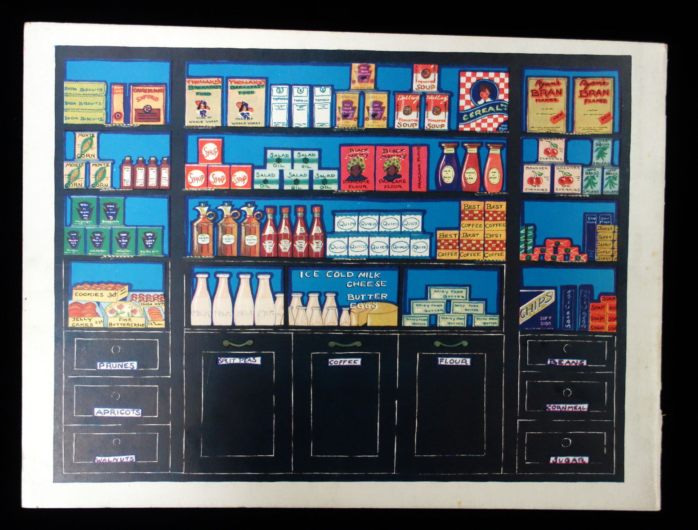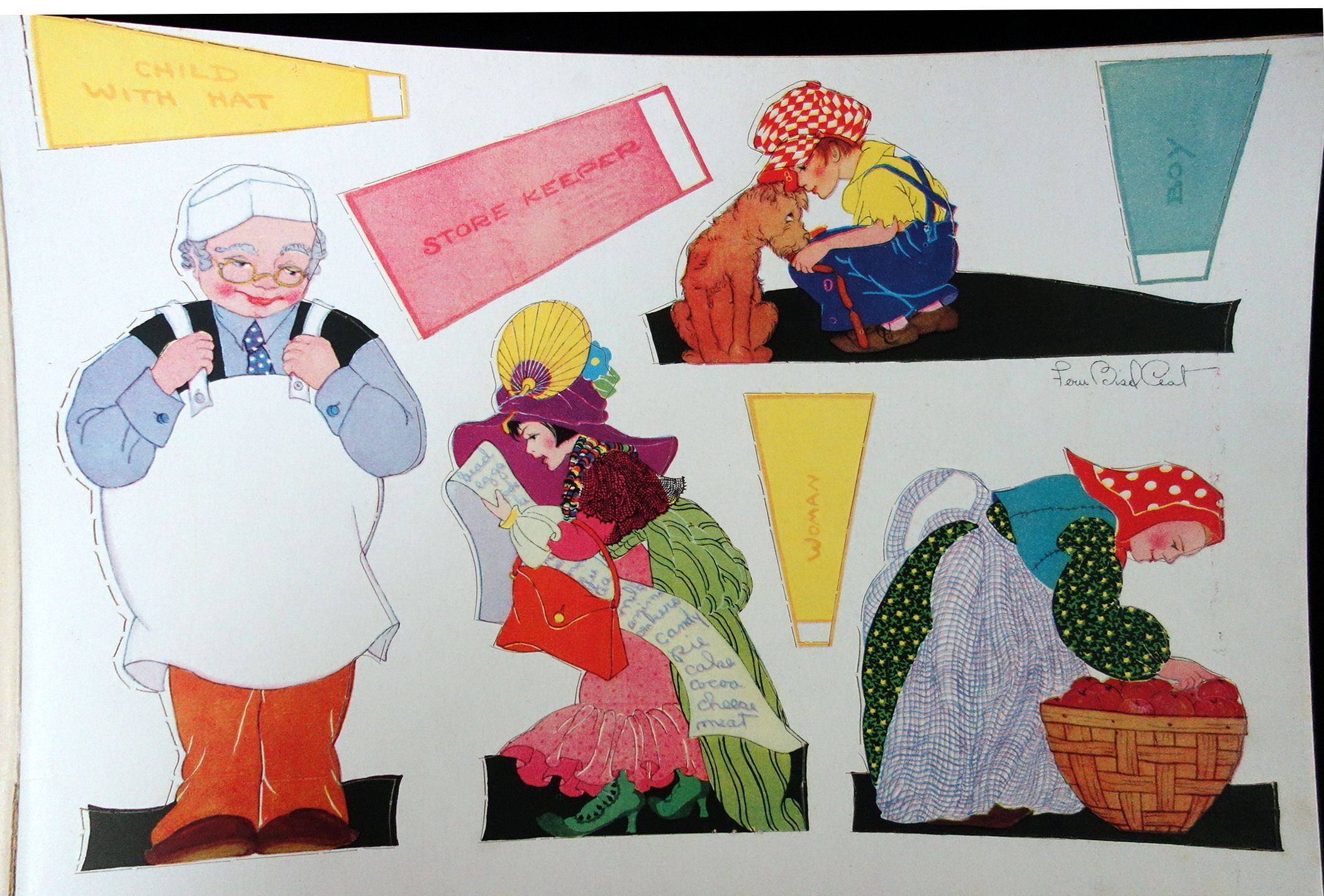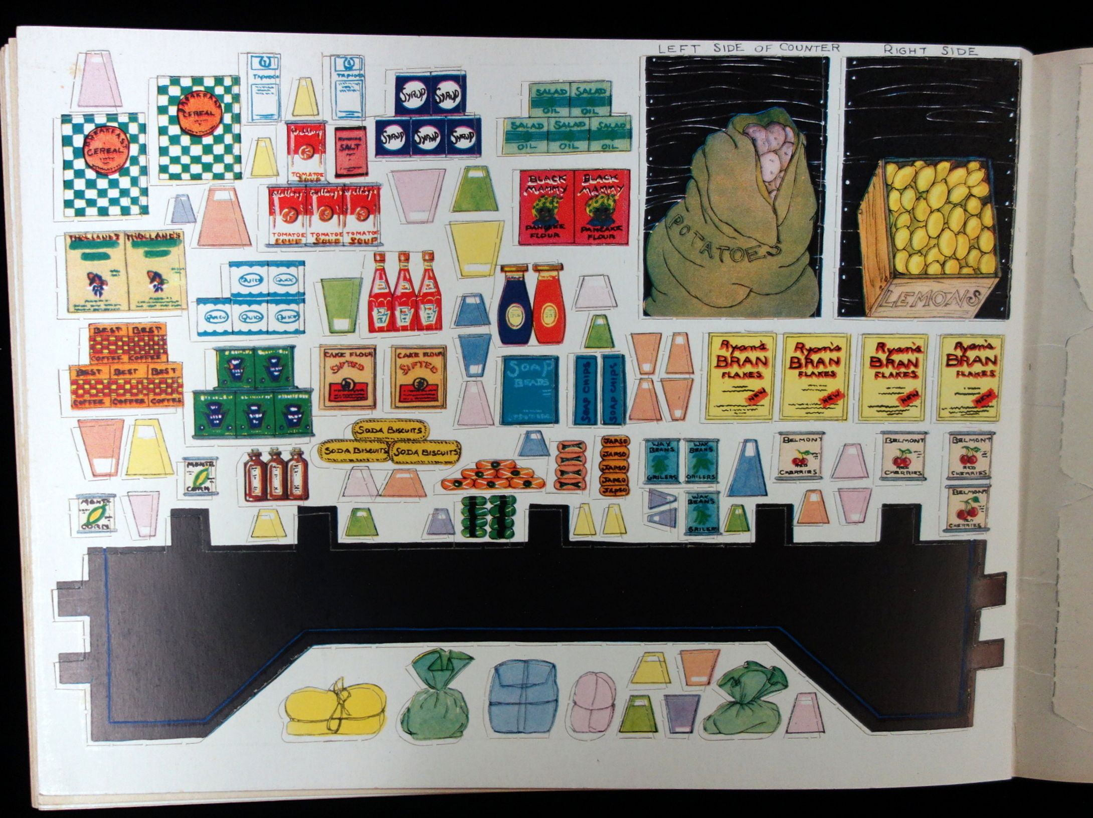 Akron, Ohio: Saalfield Pub. Co, 1933. Very light edge wear, otherwise in very good condition.. Grocery store themed punch out activity book. 7 pages of grocery store pieces and 206 total pieces that, when assembled, create a complete grocery store including produce, shelves, money, customers, and more. Each character and food stand has a corresponding easel back stand. Characters include the Store Keeper, a child with a hat, a boy, and a woman. A myriad of tiny display pieces help develop fine motor skills including a tiny box, a jar and a bundle of facsimiles to be placed on shelves. Measures 10" by 13.5