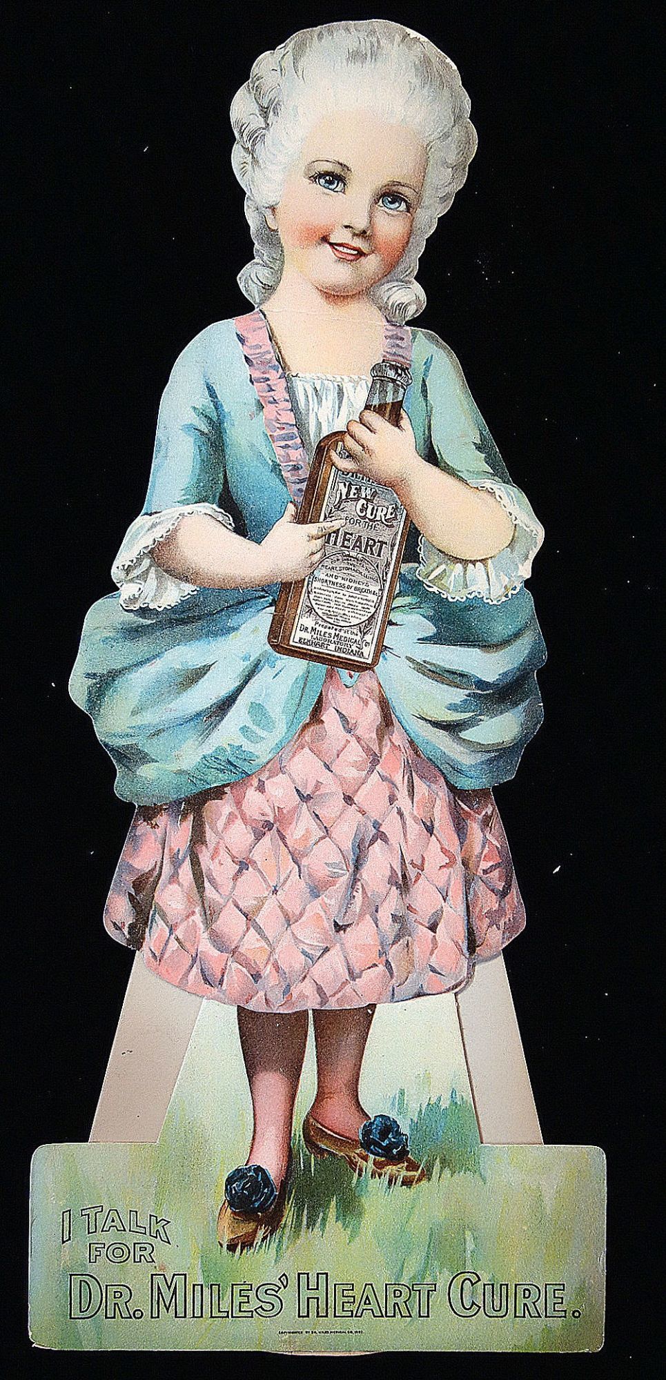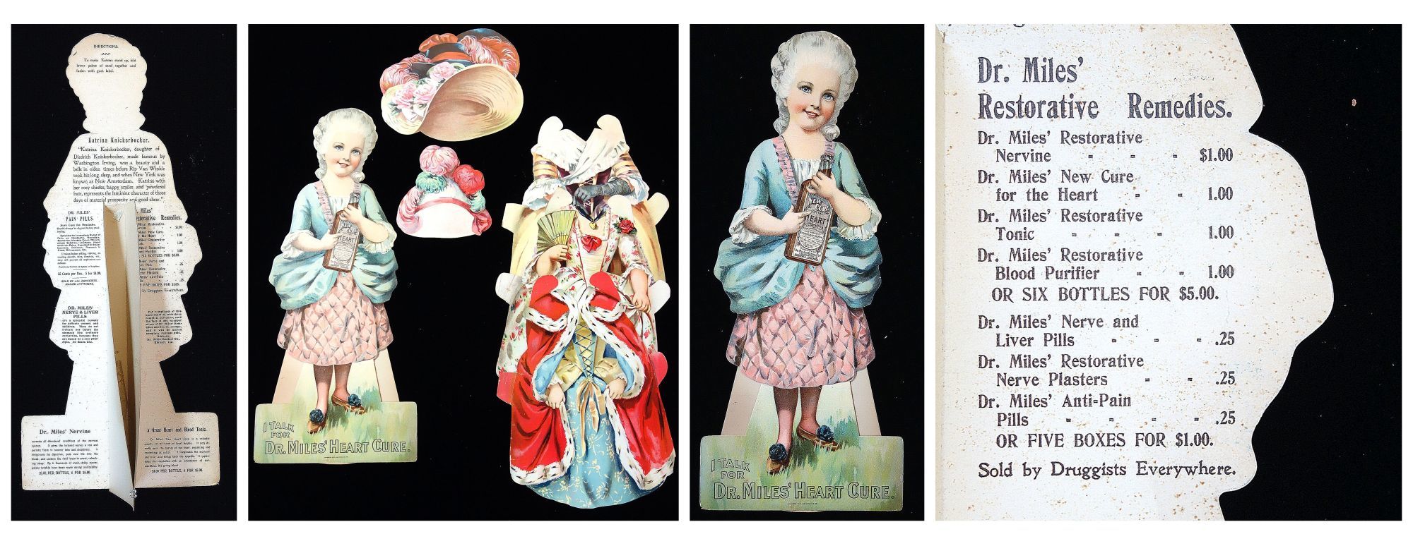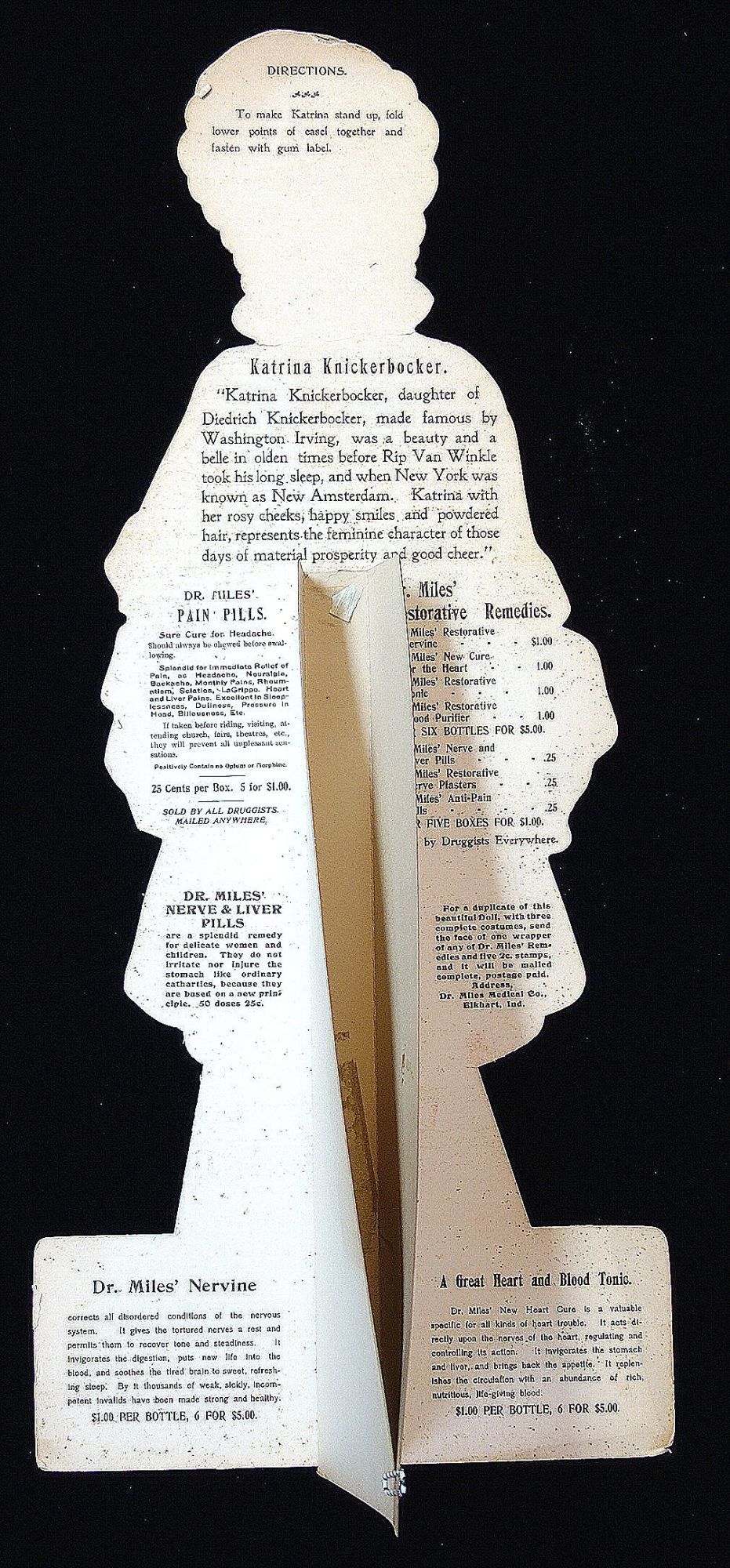 Elkhart In: Dr. Miles Medical Co, 1902. Light neck bend.. A 20 3/4" tall die-cut easel back paper doll depicting Katrina Knickerbocker holding a bottle of Dr. Miles New Heart Cure. The reverse introduces Katrina, a character in Rip Van Winkle and of course promoting the various Dr. Miles with brief narratives and a complete product listing including pricing. Also includes three costumes and hats. The costumes are identified e.g. for a stroll on the Bowling Green. Each costume has product information on the reverse.
