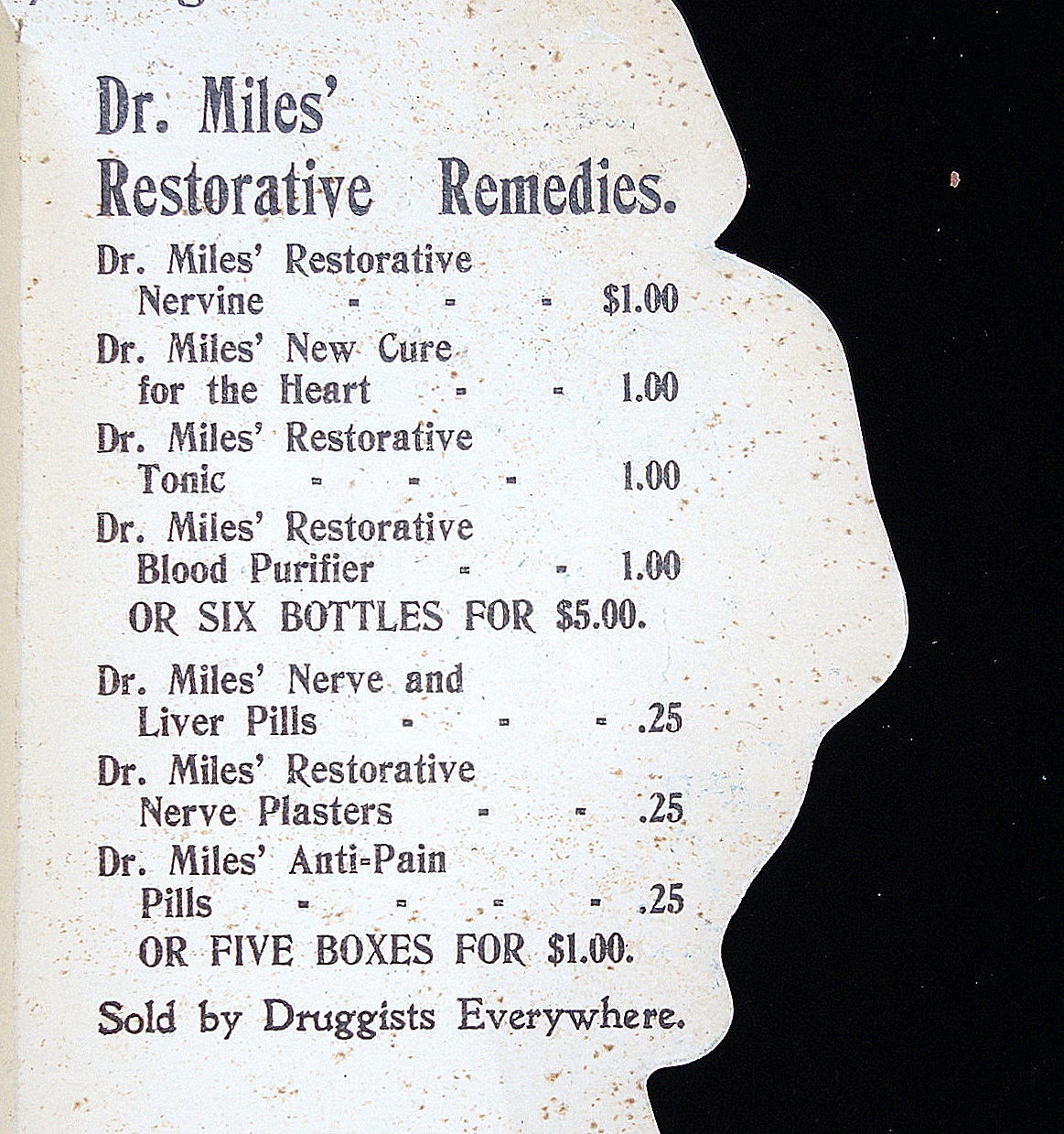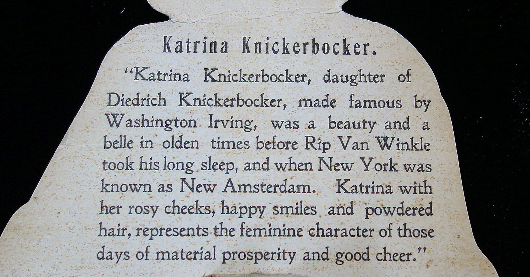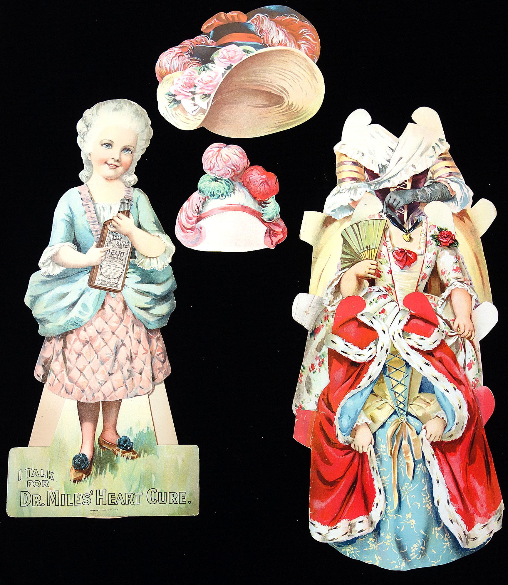 Elkhart In: Dr. Miles Medical Co, 1902. Light neck bend.. A 20 3/4" tall die-cut easel back paper doll depicting Katrina Knickerbocker holding a bottle of Dr. Miles New Heart Cure. The reverse introduces Katrina, a character in Rip Van Winkle and of course promoting the various Dr. Miles with brief narratives and a complete product listing including pricing. Also includes three costumes and hats. The costumes are identified e.g. for a stroll on the Bowling Green. Each costume has product information on the reverse.