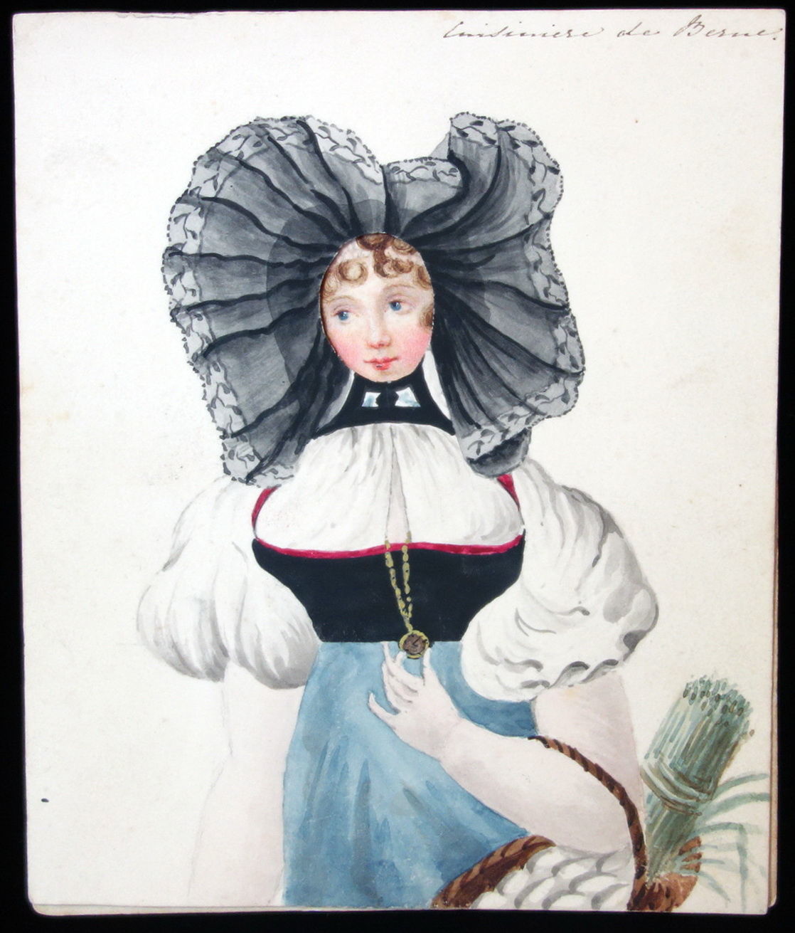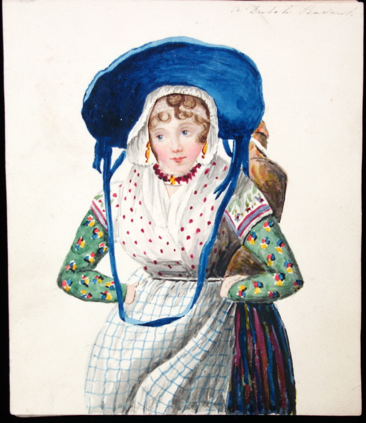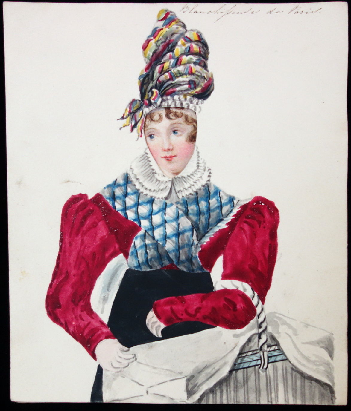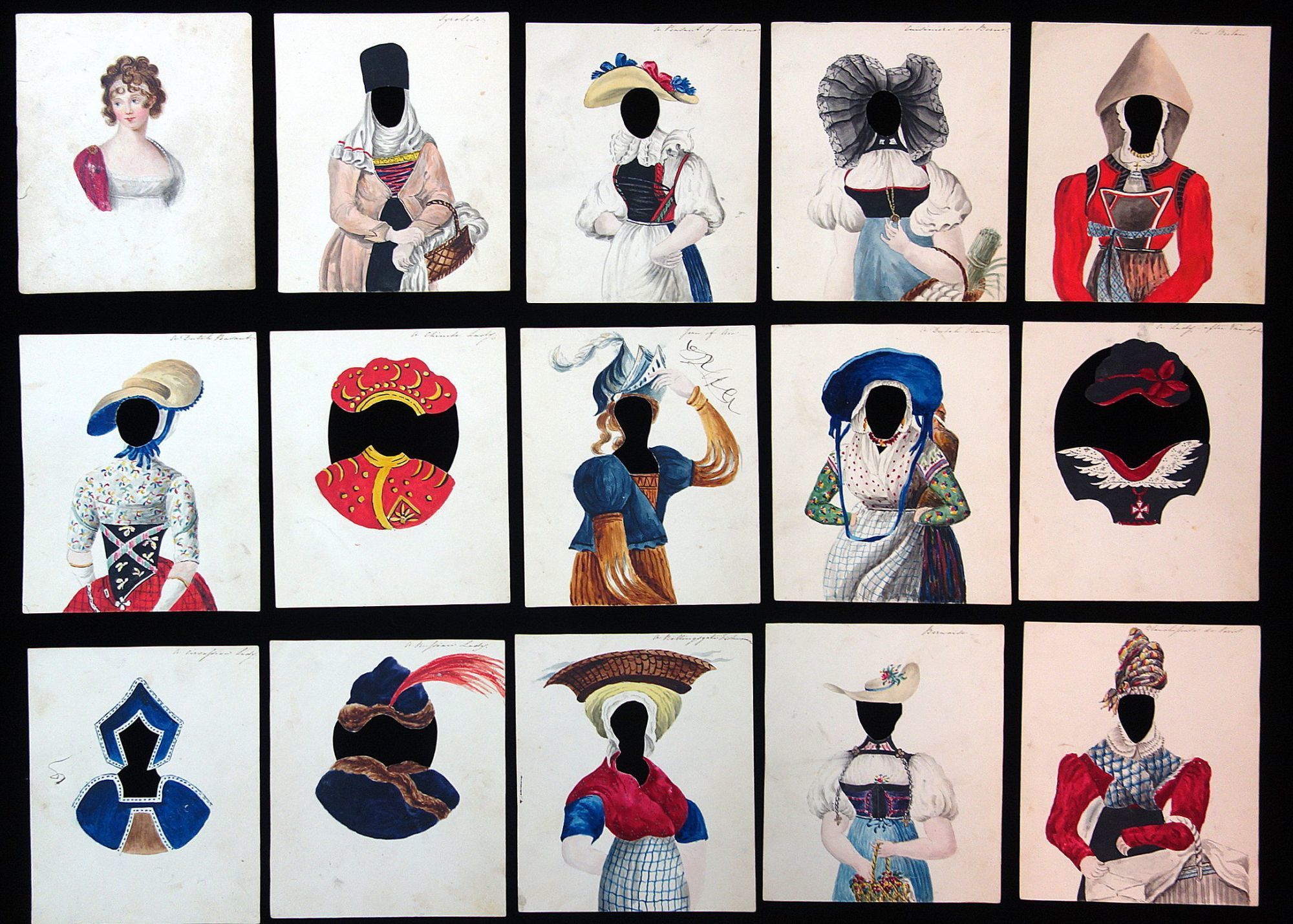 1820. A finely executed watercolor of a Regency era women with 14 intricately detailed watercolor overlays. Each character is identified by the artist at the upper left. They include