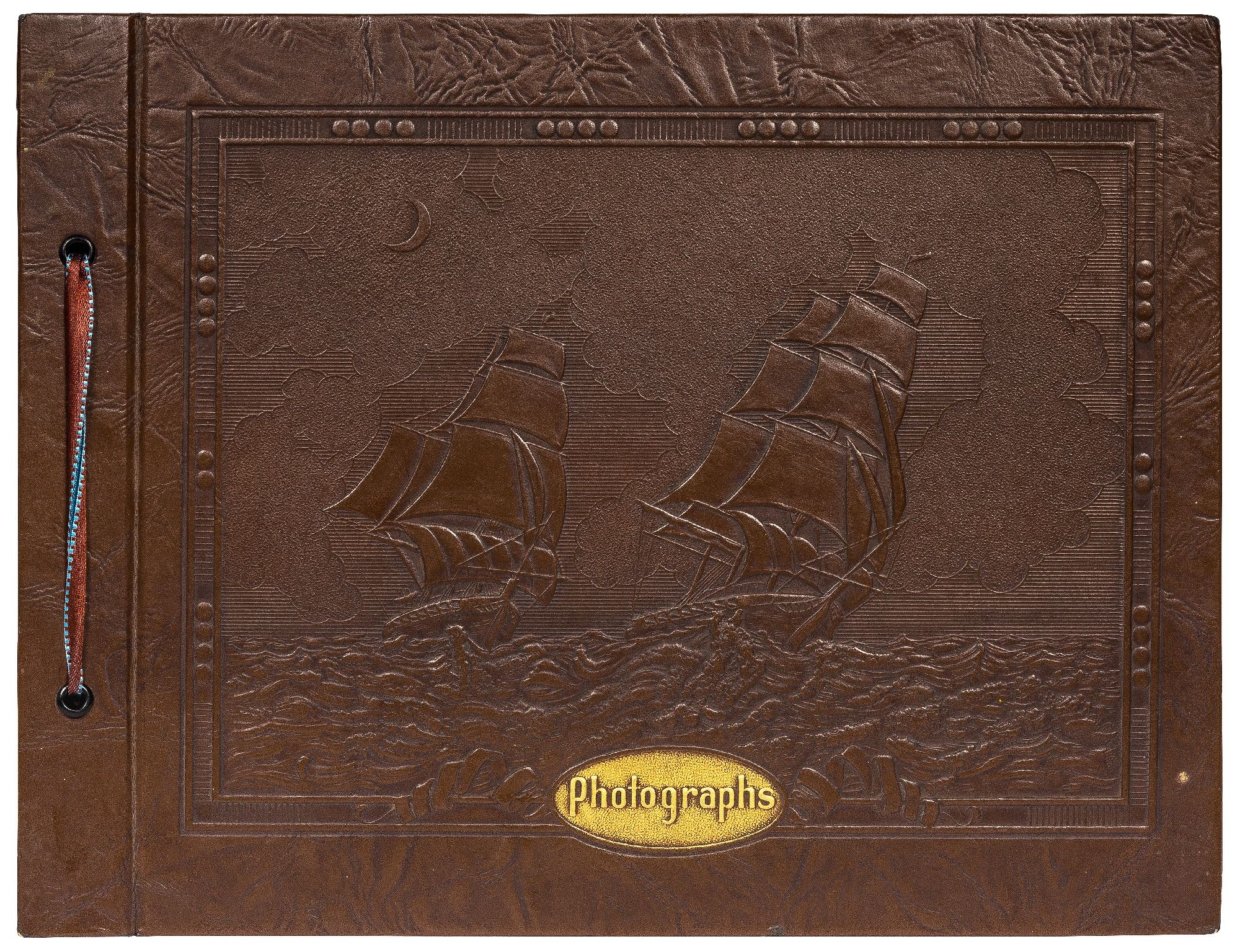 California, Arizona, 1937. Hardcover. Near Fine. Oblong quarto measuring 12" x 9.5". String-tied brown leather over stiff paper boards with stamped decorations. Contains 133 sepia-toned or black and white silver gelatin photographs measuring between .75" x 1.75" and 3.75" x 5.75" with captions. Very good album with fine photographs.