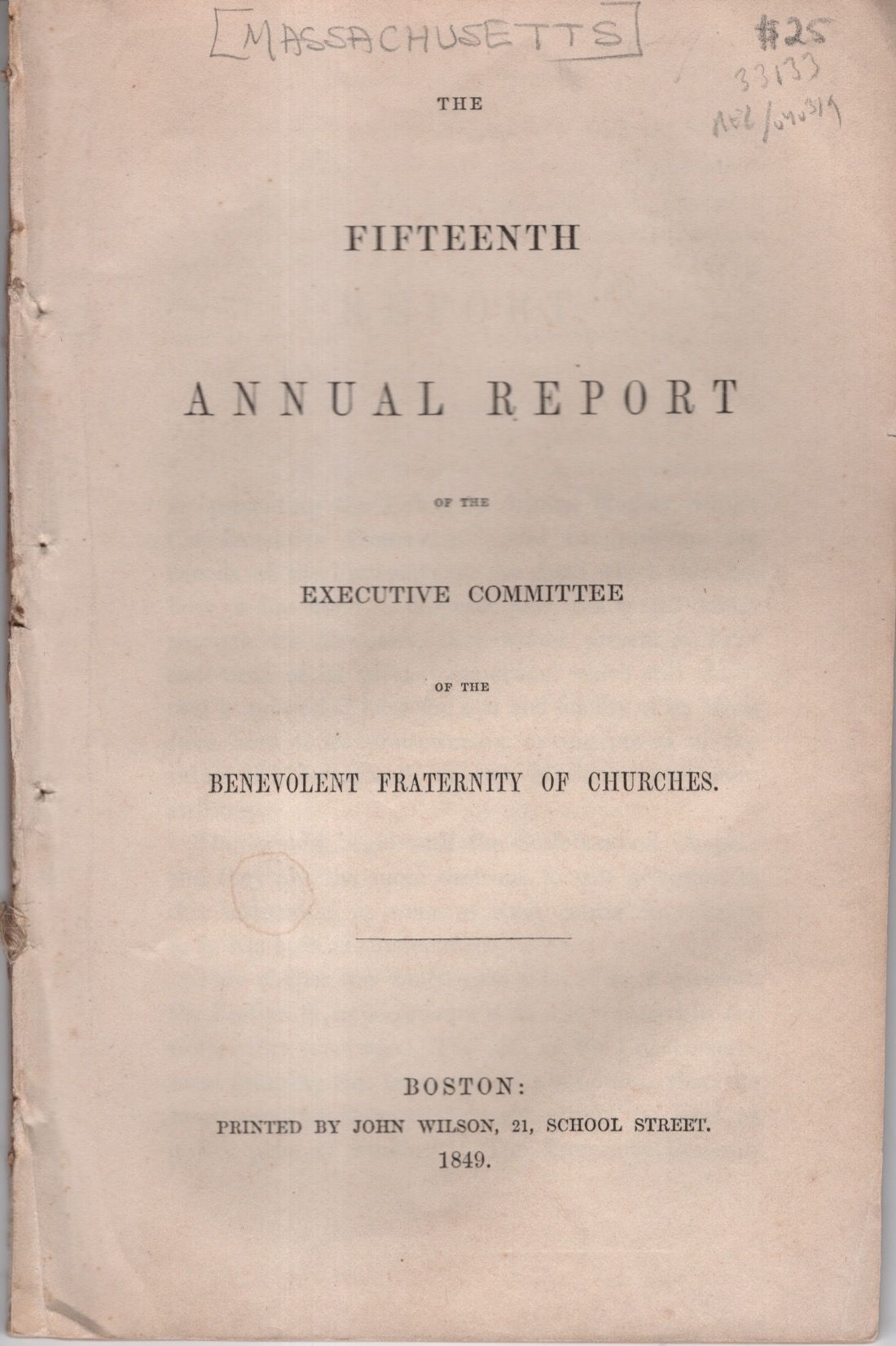 Boston: John Wilson, 1849. Paperback. Very Good. Paperback. Lacks original paper wrappers. Pencil markings to title page and small light stains to both front and last page, else clean. Includes a list of officers and report from treasurer. Short closed tears to edges of some pages. 66 pages. REL/040319.