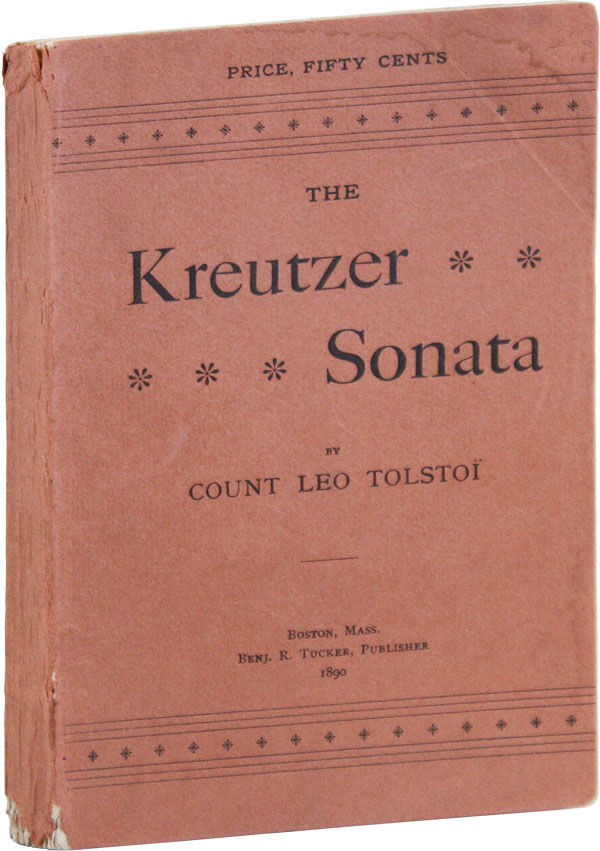 Boston: Benj. R. Tucker, 1890. First American Edition. 12mo (17cm.); publisher's orange decorative card wrappers; 143pp. Some wear to wrapper extremities including shallow chips at spine ends, faint dampstain to top edge of upper cover not bleeding into textblock, else a Very Good, tight and unfaded copy. Though Tolstoy never considered himself an anarchist, he was among the American movement's literary darlings due to his sympathetic portrayals of the peasant class and anti-militarist views. The present translation, by radical publisher and individualist anarchist Benjamin R. Tucker, was his major bestseller (62,000 copies reported) and ran into multiple printings despite being banned from the mails under the Comstock Act for indecency (the novella portrays a man whose jealousy leads him to murder his wife). The only other copies of this title currently on the market (November, 2018) are later printings. Reference: Candace Falk, ed. "Emma Goldman: A Documentary History of the American Years," Vol. 1, p. 559. No priority established between this and the first London edition, both first appearing in June, 1890 (see "Bibliography of Russian Literature in English Translation to 1945," p. 42). See also Roger E. Stoddard, "'Liberty's Library': Benj. R. Tucker's Imprint, 1875-1912," in Essays in Honor of William B. Todd (1991), p. 165, citing a reprint.
